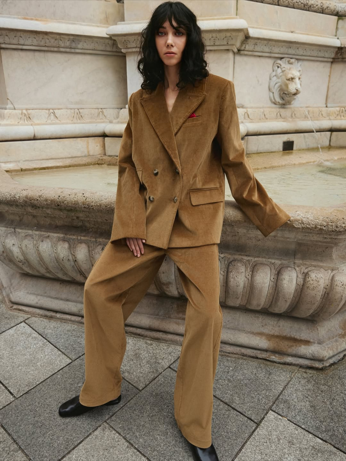 Вельвет повертається в гардероб не як ретро-відсилання, а як ультрасучасний матеріал для зими. Оверсайз-костюм із вельвету — це нова формула комфорту: теплий, тактильно приємний, візуально структурований і водночас розслаблений. У моді костюми в глибоких відтінках — шоколадному, оливковому, винному, темно-синьому. Їх носять як разом, так і окремо: жакет — із джинсами, штани — з об’ємним светром або лонгслівом. У контексті трендових речей цієї зими це одна з найпрактичніших покупок.