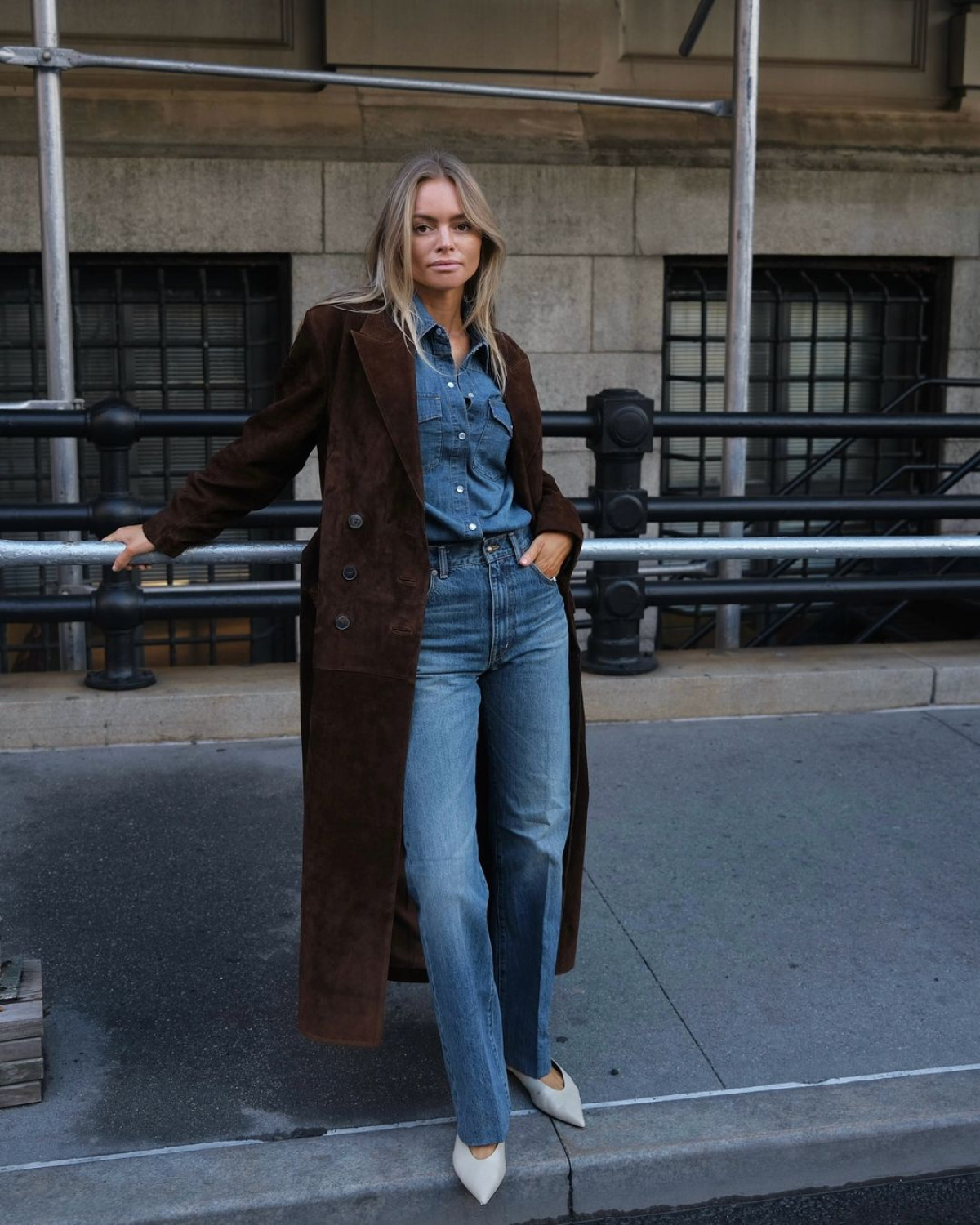 Замшеве пальто + джинсова сорочка + джинси + слінгбеки