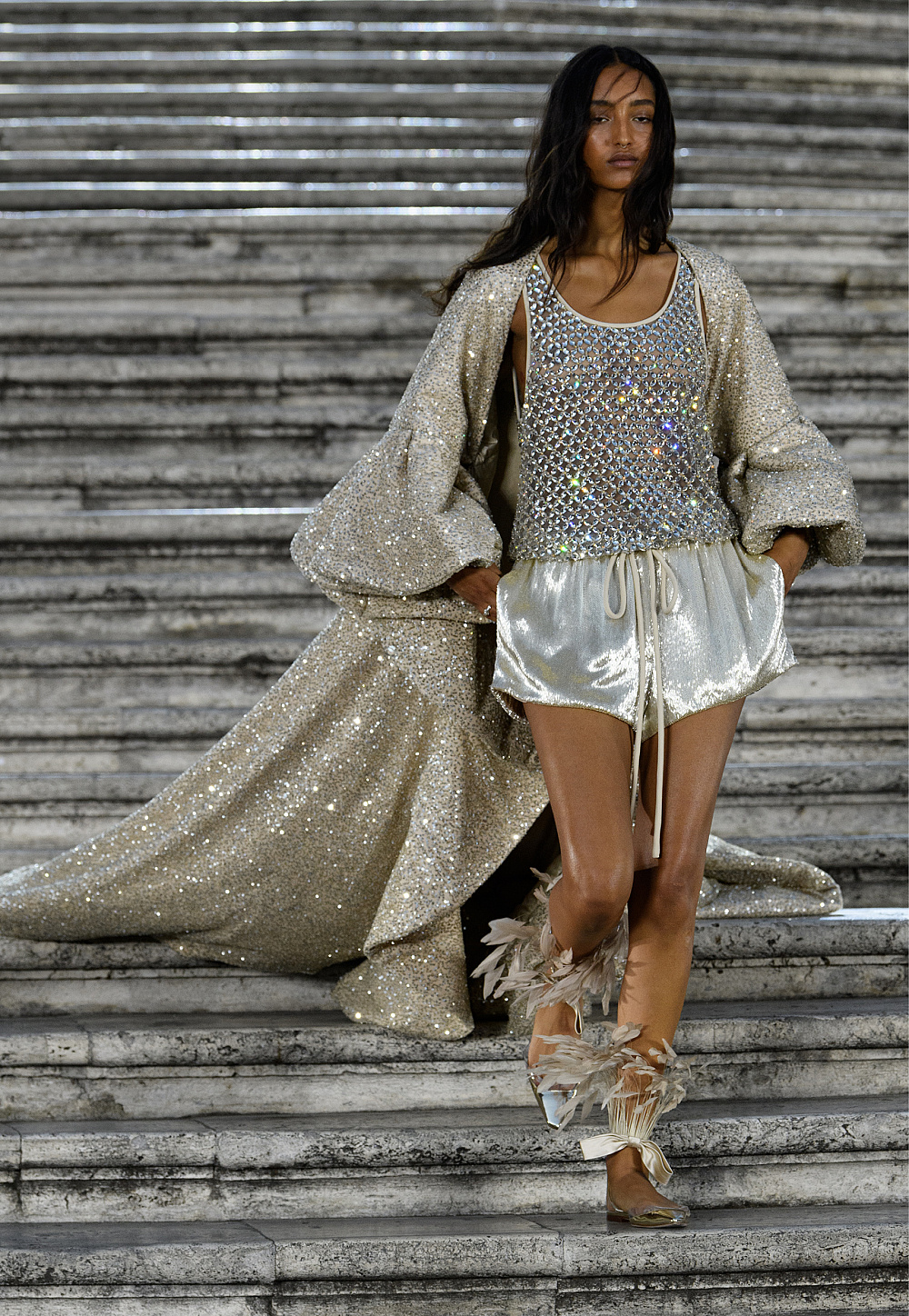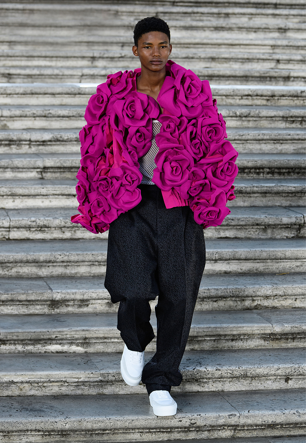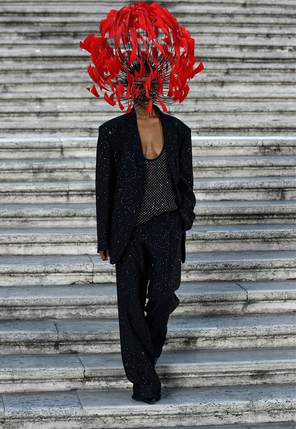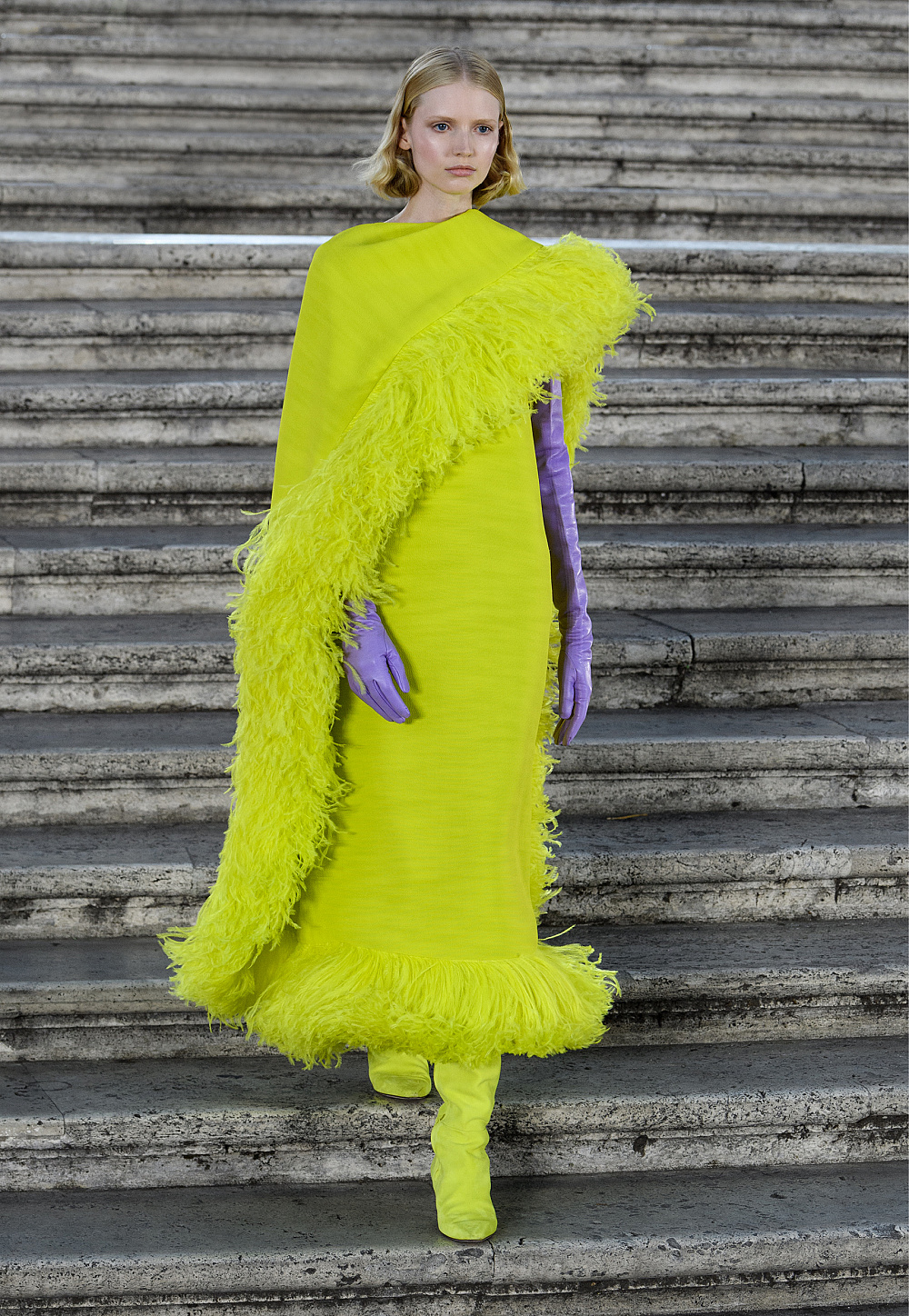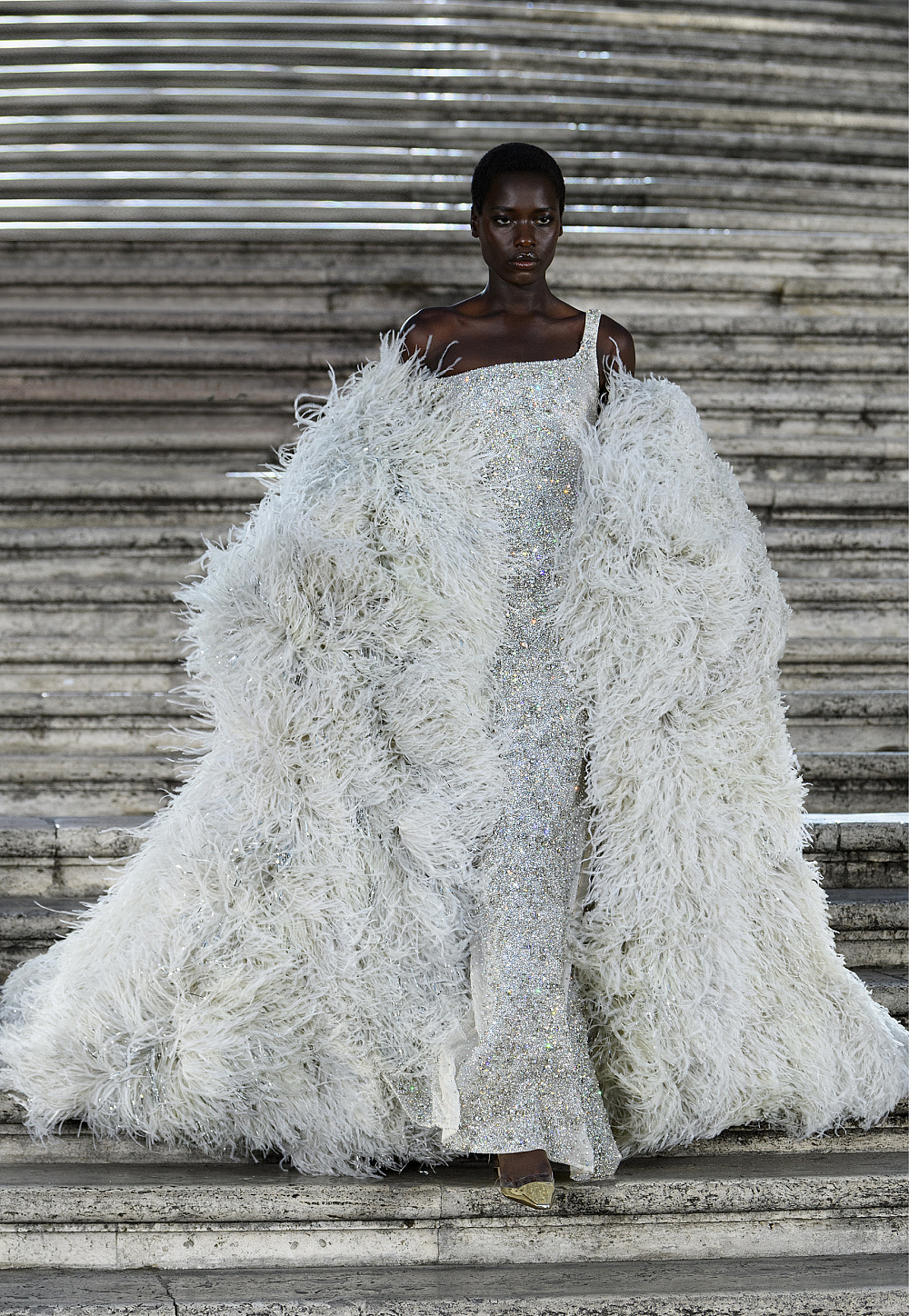 Справжній маестро кутюру П’єрпаоло Піччолі влаштував цього разу дуже знаковий показ. Колекцію було присвячено витокам модного дому, багато елементів пов’язано з 1959 роком — роком заснування бренду Валентіно Гаравані у партнерстві із Джанкарло Джамметті. Перше ательє Valentino було розміщене на Віа Грегоріана, вузькій бруківці, що звивається від церкви Трініта-деї-Монті, яка розташована на вершині Іспанських сходів. Тож сьогодні, у 2022 році, моделі Valentino крокували уявним подіумом саме в цьому символічному місці — показ відбувся на Іспанських сходах у Римі. Колекція ж була насичена яскравими поєднаннями кольорів, великою кількістю пір’я й акцентного декору. Тут П’єрпаоло Піччолі немає рівних.