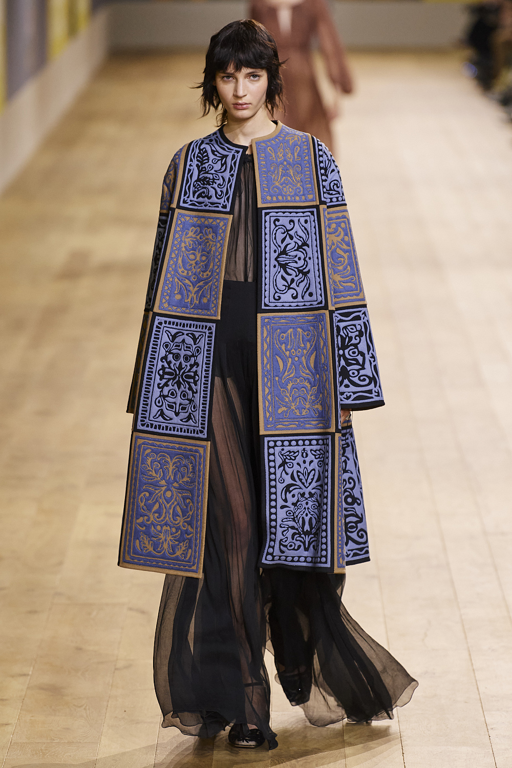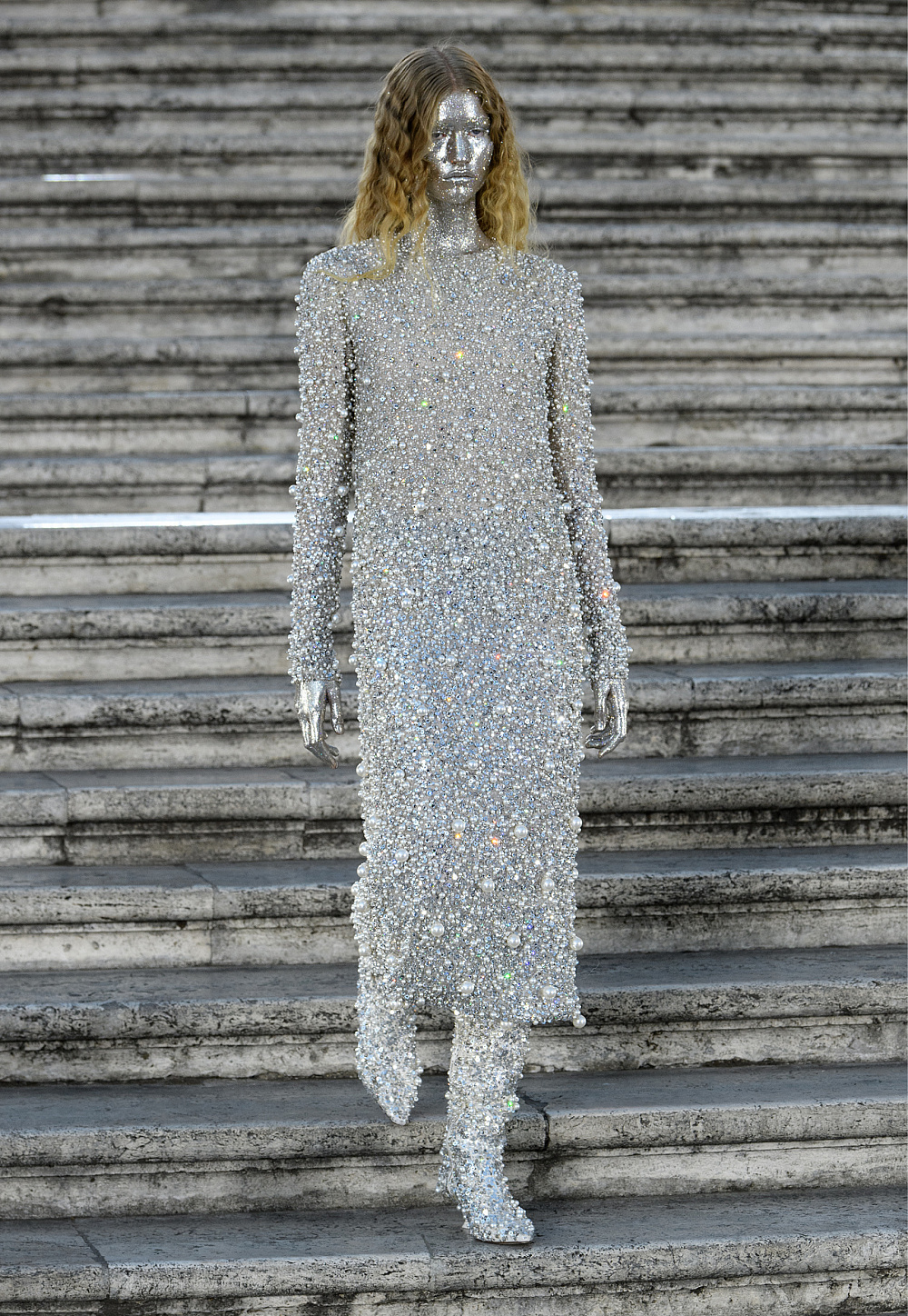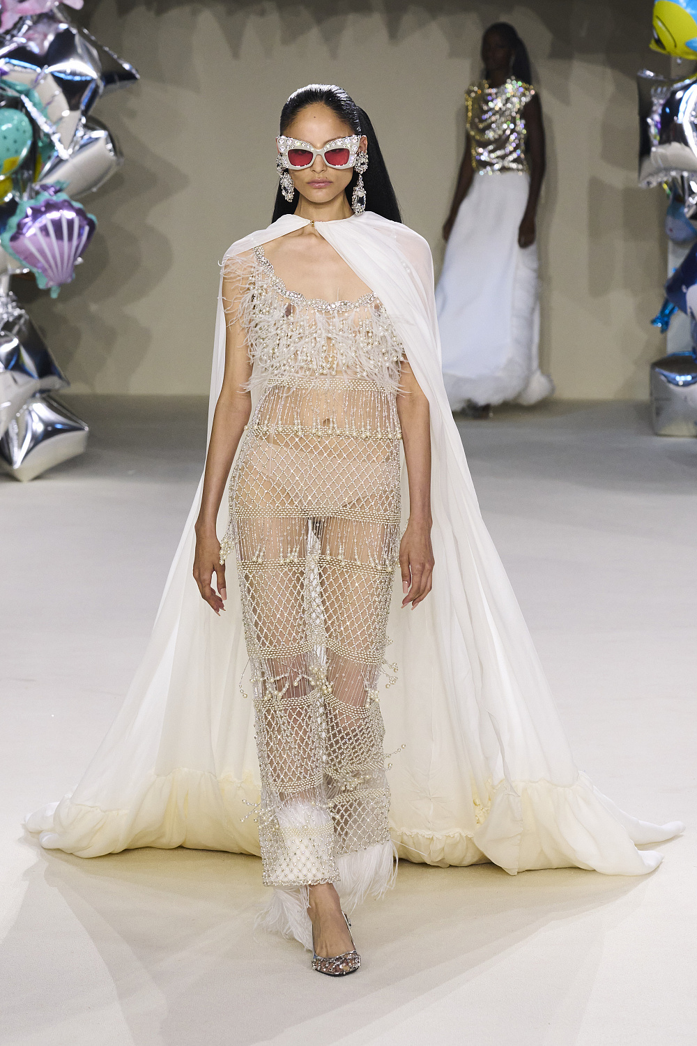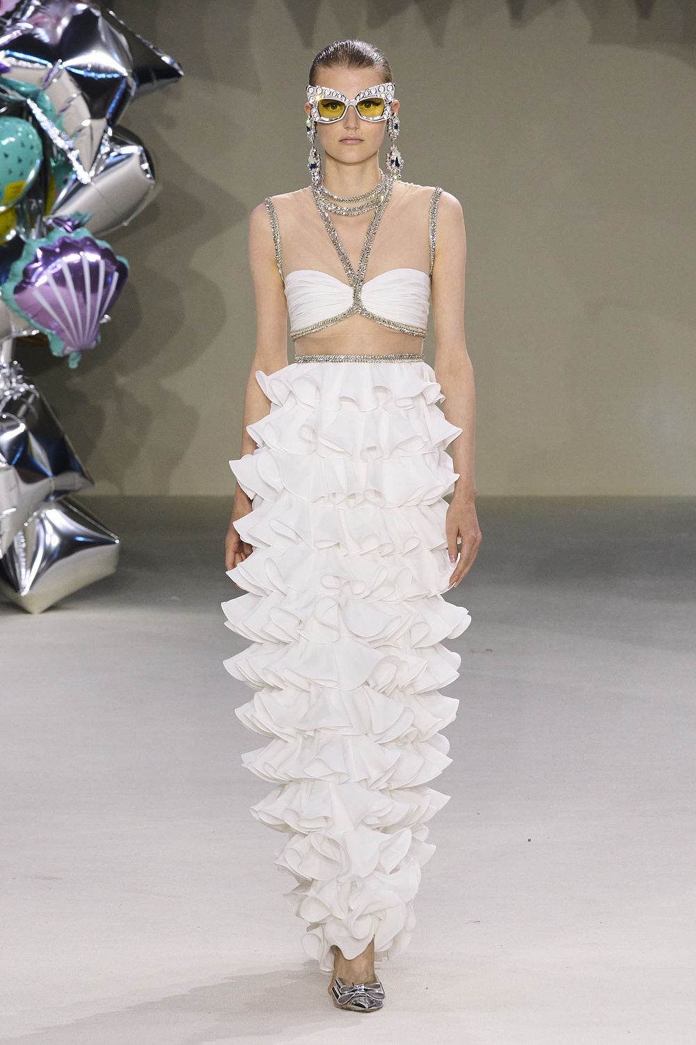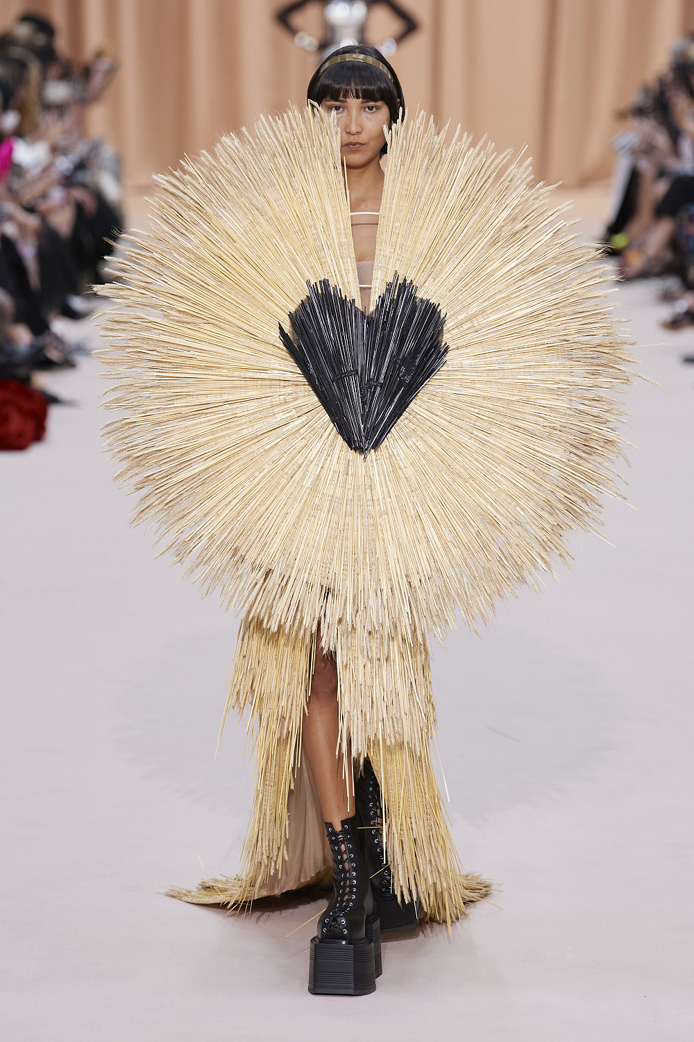 Справжній маестро кутюру П’єрпаоло Піччолі влаштував цього разу дуже знаковий показ. Колекцію було присвячено витокам модного дому, багато елементів пов’язано з 1959 роком — роком заснування бренду Валентіно Гаравані у партнерстві із Джанкарло Джамметті. Перше ательє Valentino було розміщене на Віа Грегоріана, вузькій бруківці, що звивається від церкви Трініта-деї-Монті, яка розташована на вершині Іспанських сходів. Тож сьогодні, у 2022 році, моделі Valentino крокували уявним подіумом саме в цьому символічному місці — показ відбувся на Іспанських сходах у Римі. Колекція ж була насичена яскравими поєднаннями кольорів, великою кількістю пір’я й акцентного декору. Тут П’єрпаоло Піччолі немає рівних.