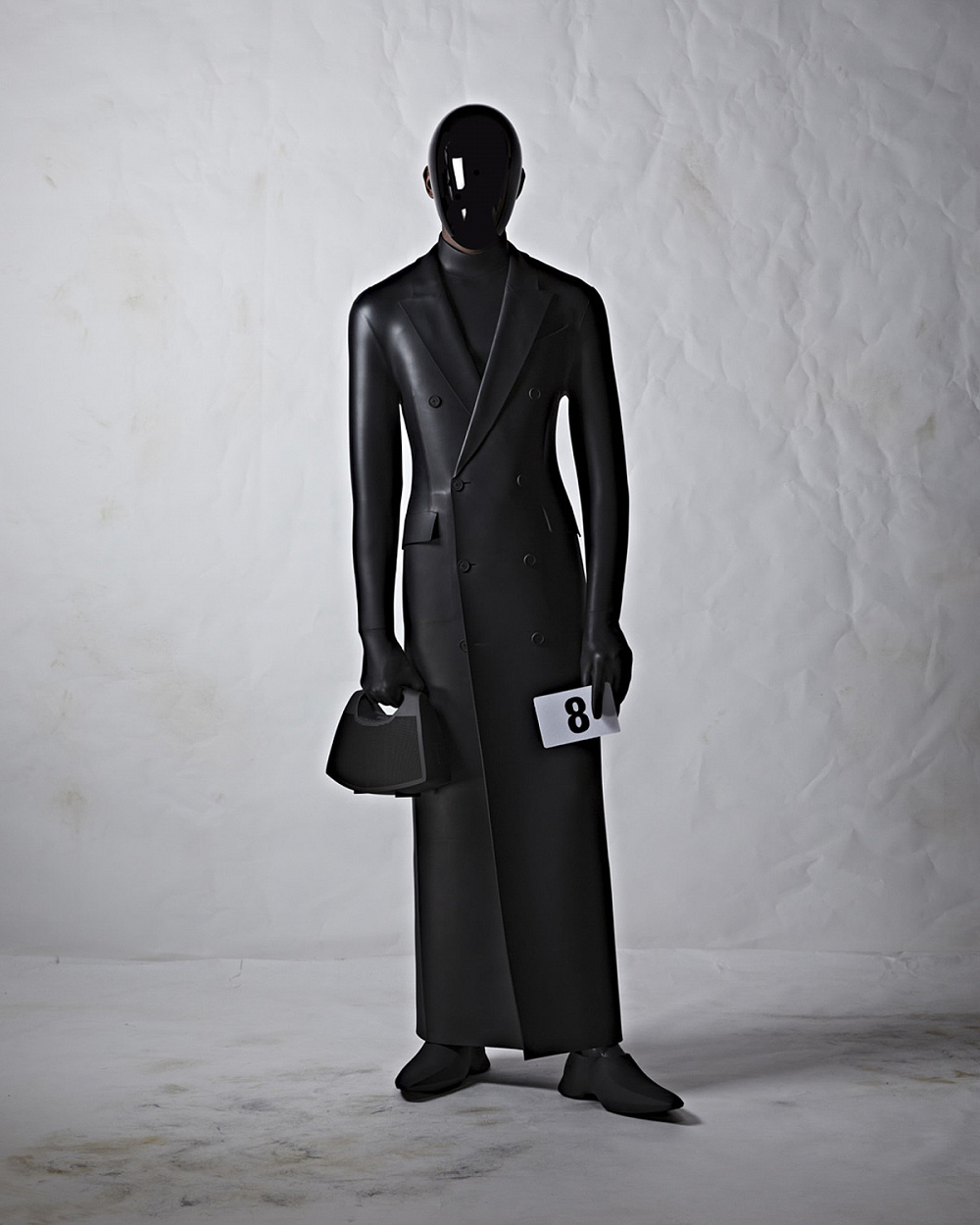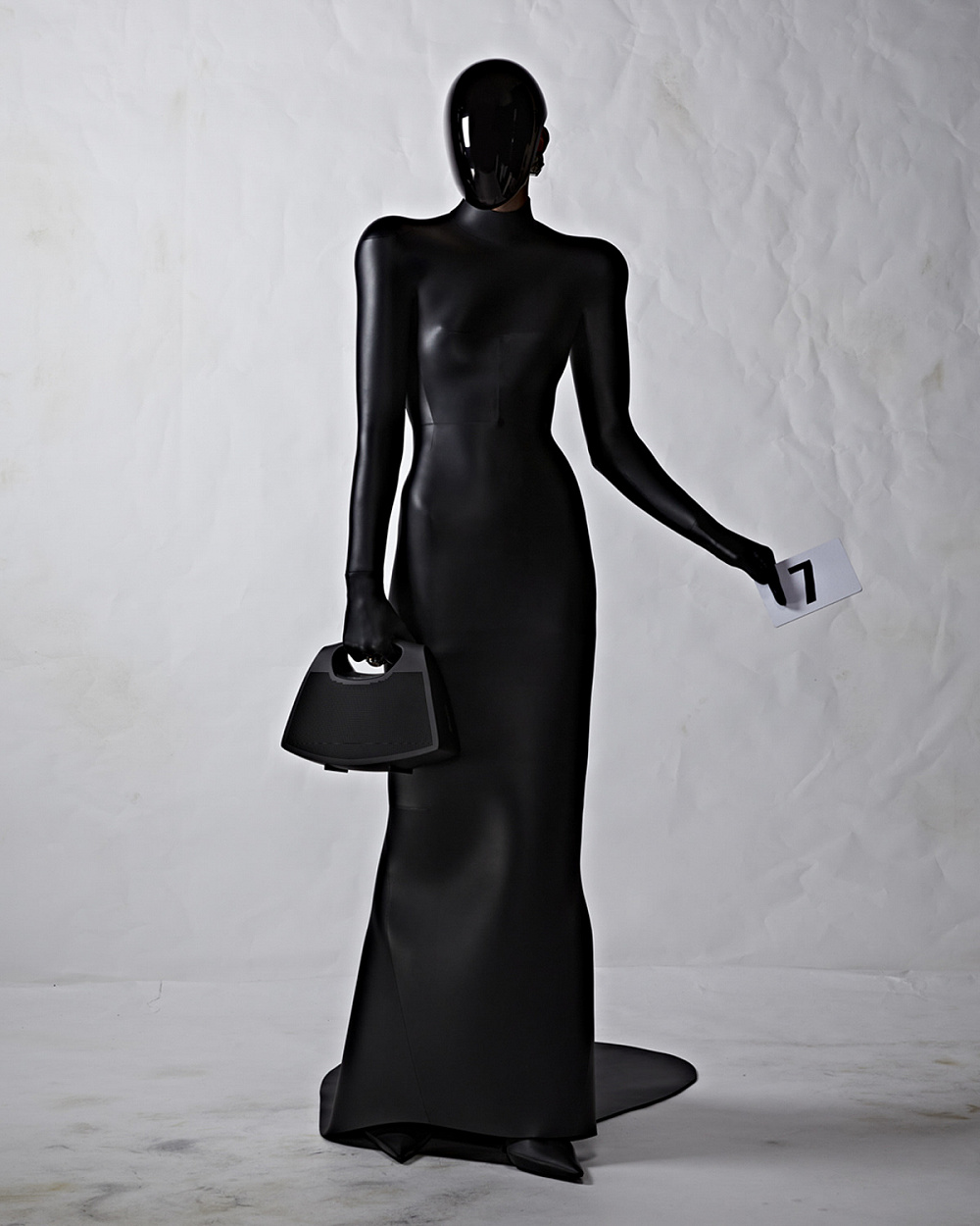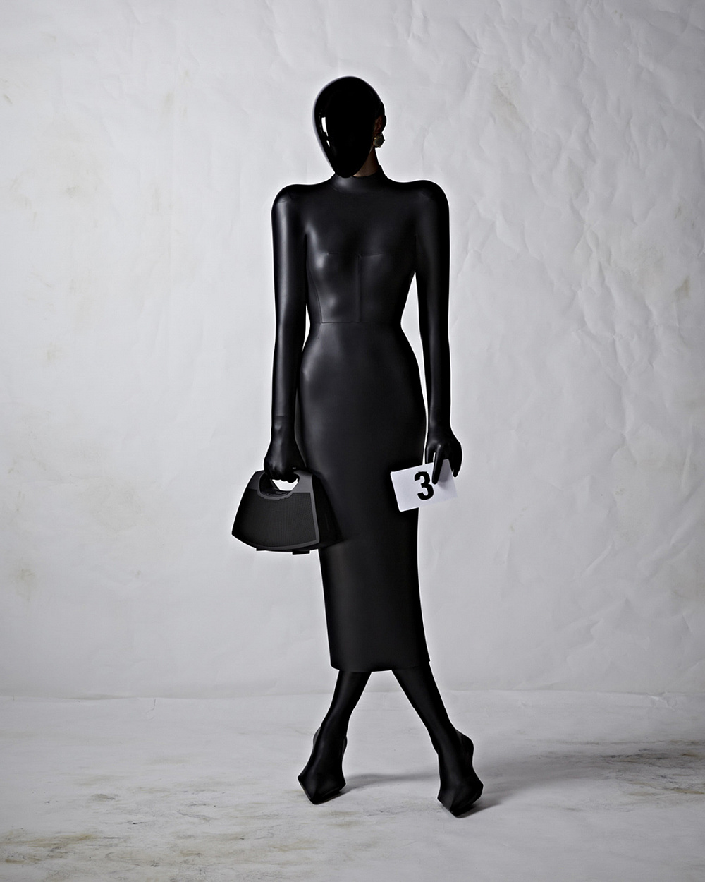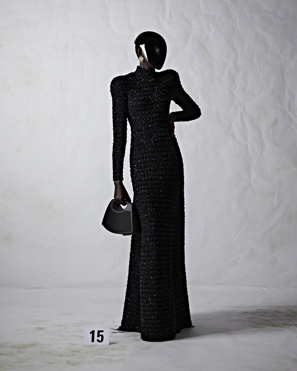 Цього разу кутюр авторства Демни Гвасалії можна поділити на два блоки. Перший — суцільний монохром зі значним переважанням чорного кольору. Образи, пронумеровані як і минулого разу, відзнято в лукбуці бренду на моделях із закритими обличчями у впізнаваних статичних позах. Нема чого і додати, it’s total Balenciaga.