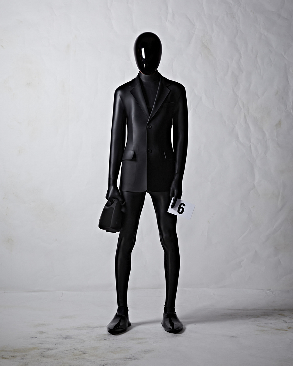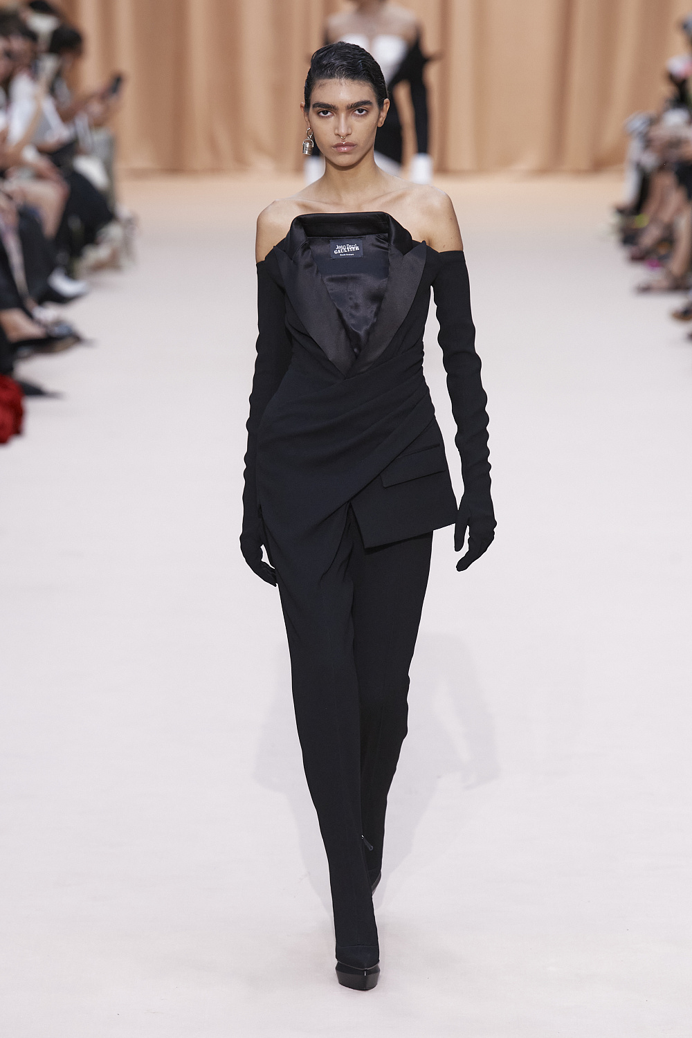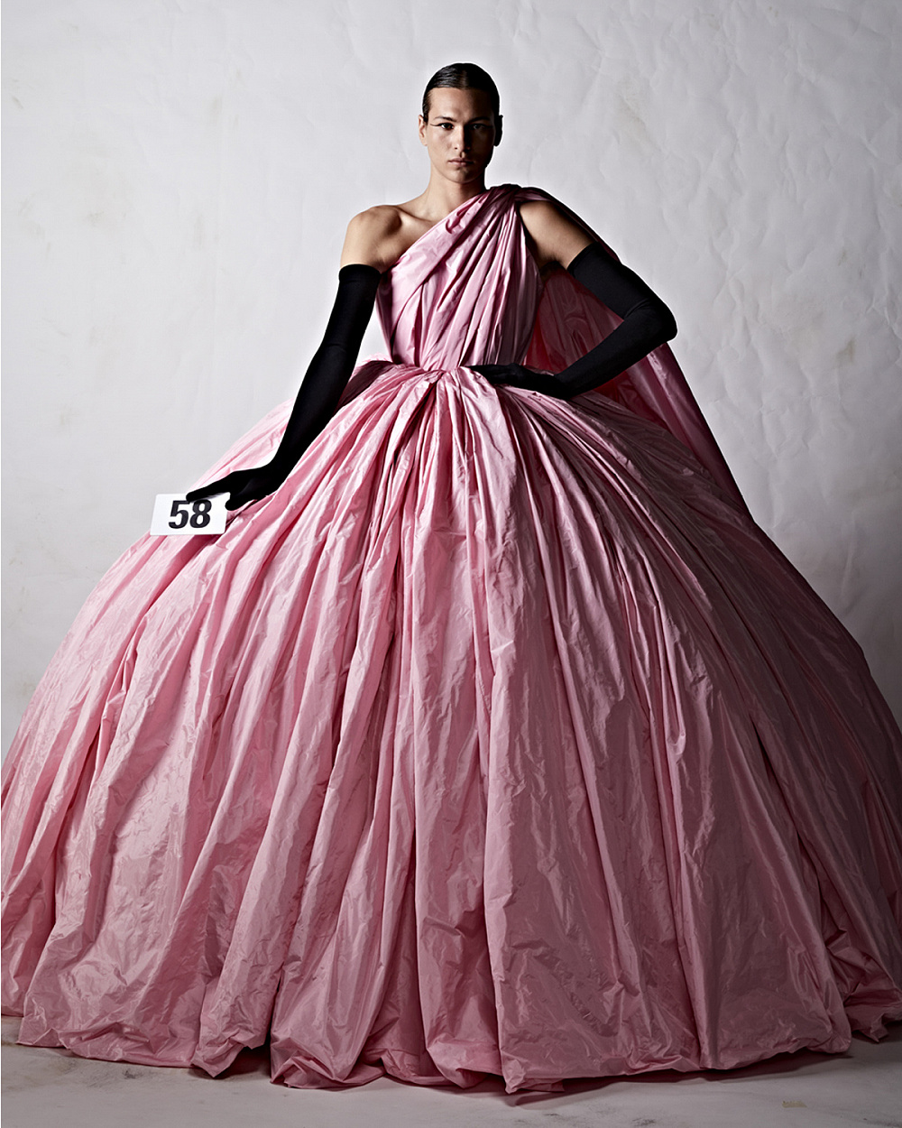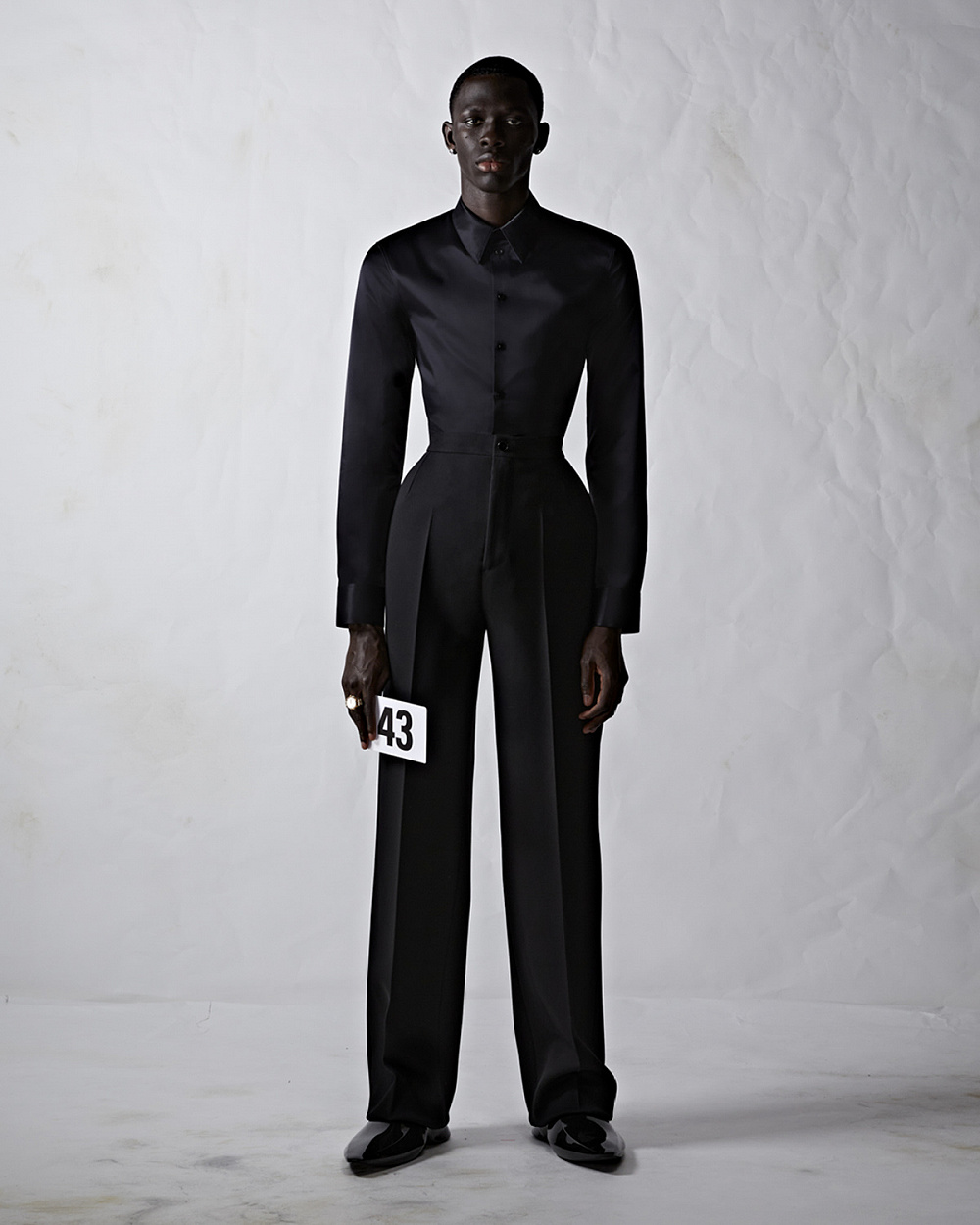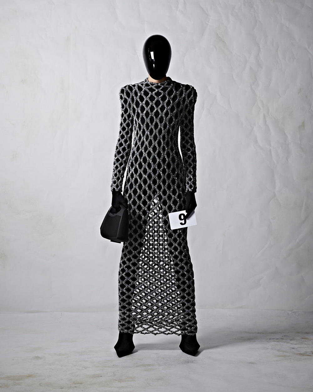 Цього разу кутюр авторства Демни Гвасалії можна поділити на два блоки. Перший — суцільний монохром зі значним переважанням чорного кольору. Образи, пронумеровані як і минулого разу, відзнято в лукбуці бренду на моделях із закритими обличчями у впізнаваних статичних позах. Нема чого і додати, it’s total Balenciaga.