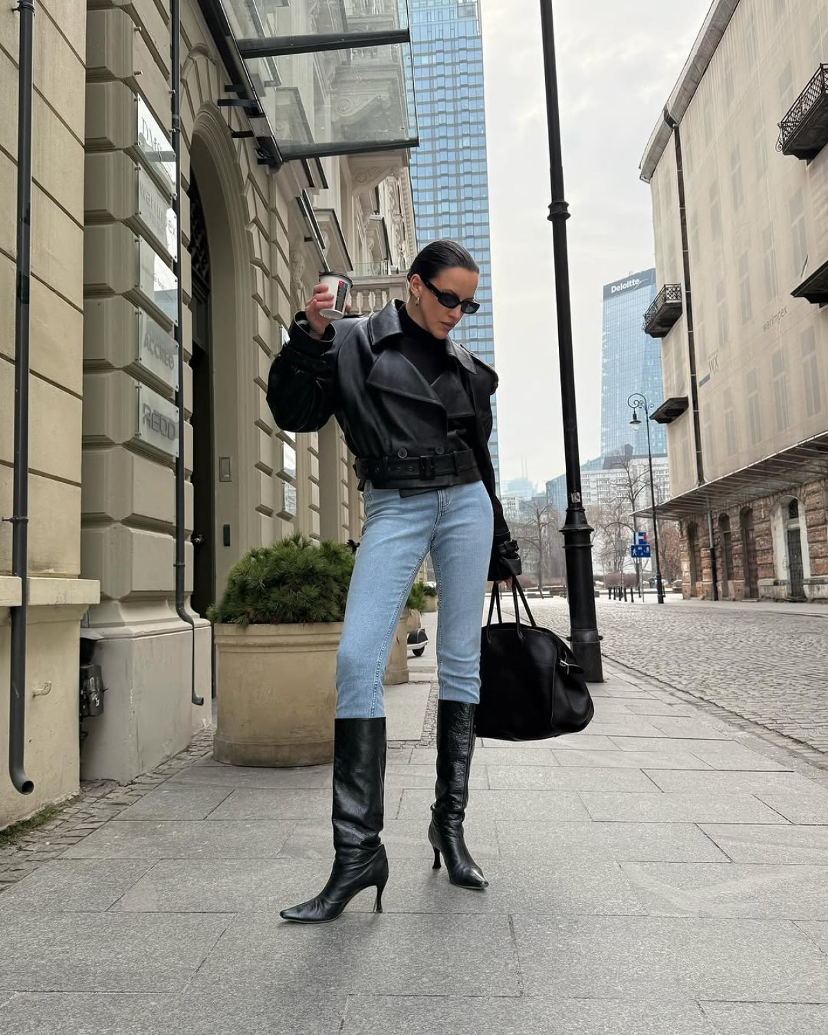 Шкіряна куртка + обтислі джинси + високі чоботи