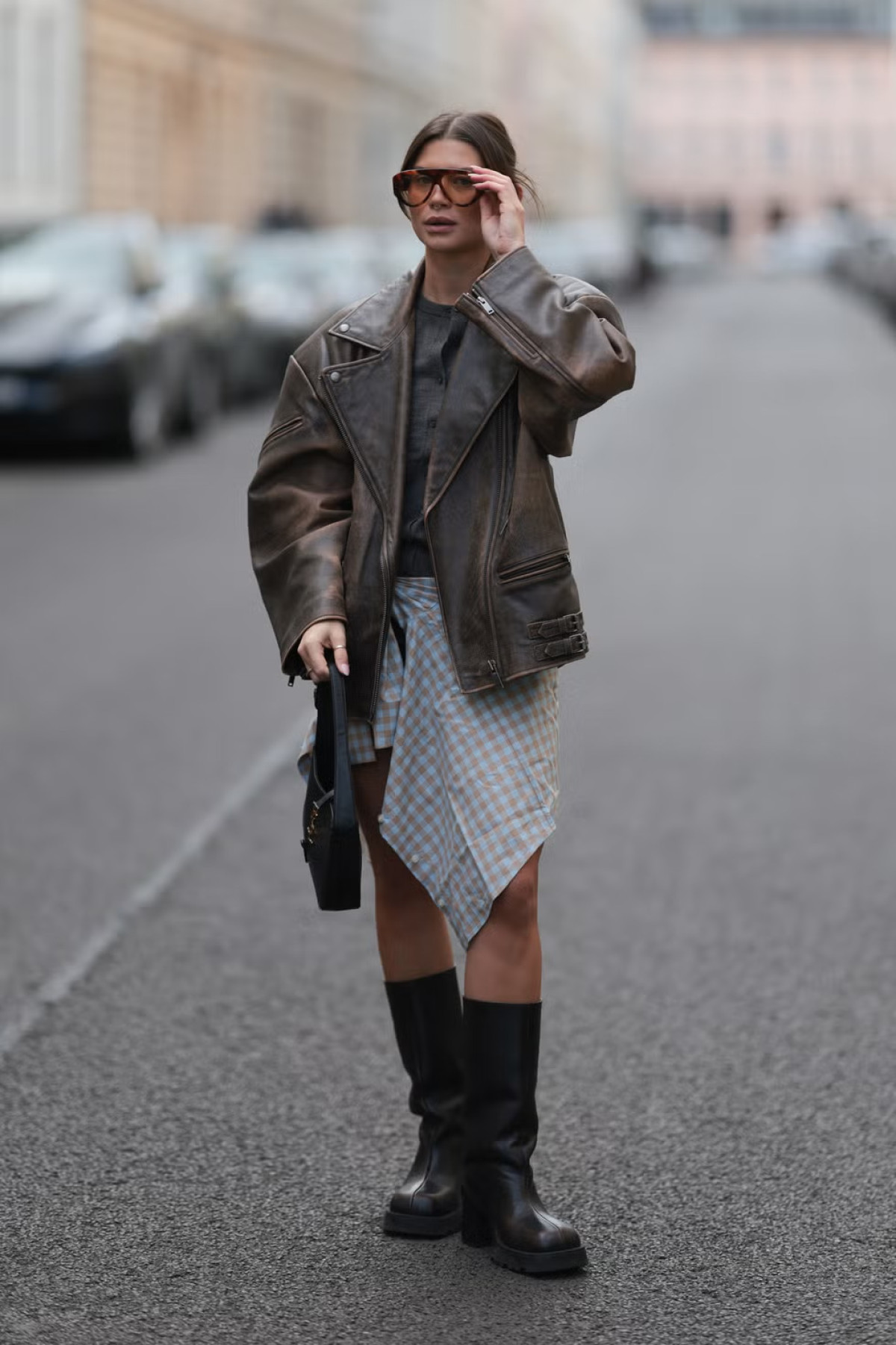 Байкерська куртка оверсайз у парі з мотоботами — це двоетапний спосіб миттєво додати собі впевненості. Решту образу можна залишити простою: оберіть свою улюблену футболку або зав’яжіть на талії картату сорочку, щоб передати дух гранжу 1990-х. За бажання — сядьте на мотоцикл, щоб завершити образ.