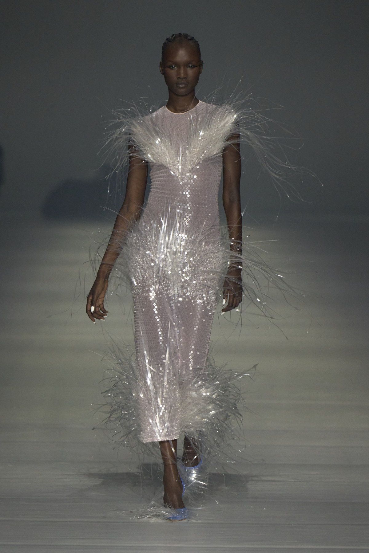 Об’ємні деталі теж додали білим сукням нового подиху. Так, звертаємо свою увагу на речі з рюшами, пір’ям, бахромою чи квітами, які зроблять образ більш романтичним і грайливим. Подібні варіації суконь представили на показах Mugler, Valentino, Akris і Coperni.