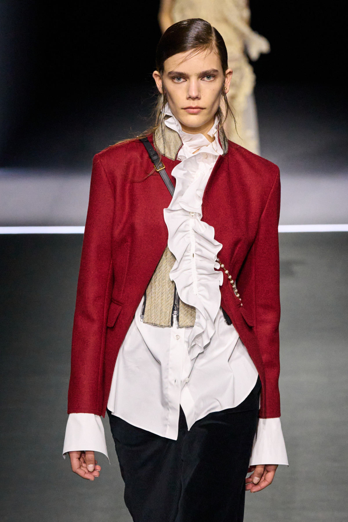 У підсумку поєднання вийшло стриманим, але водночас наповненим індивідуальністю. І якщо раніше жабо могло здаватися надто театральним, то тепер воно повертається в щоденну моду як елемент, що додає образу глибини, легкості та драми.