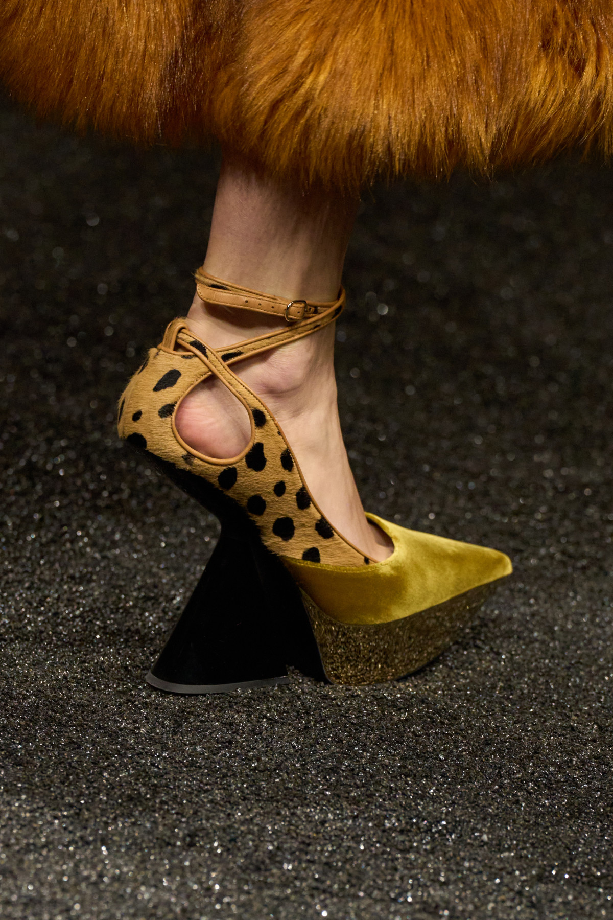 Були й дещо більш сміливі варіації трендового взуття. Duran Lantink запропонував мюлі зі зміїним принтом, створені таким чином, немовби передня та задня частини плавно переходили у підбори. Скомбінував їх бренд з асиметричною спідницею-карго та об’ємним бомбером.