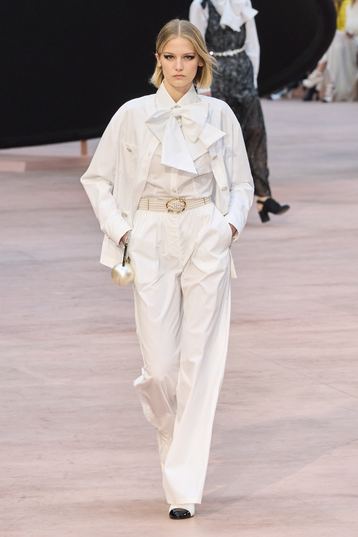 Натомість у Saint Laurent Ентоні Ваккарелло зробив ставку на масштаб — його надвеликий комір-лавальєр додав поетичності класичній білій сорочці й оживив сексуальний офісний стиль: шкіряний оверсайз-блейзер, спідниця-олівець у тон, пояс XXL, напівпрозорі колготки й металізовані слінгбеки. Усе — в ідеальному балансі між чуттєвістю та силою.