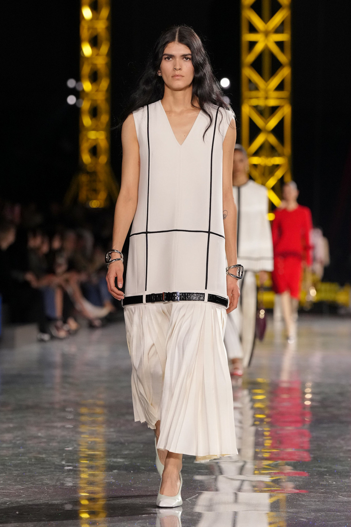 Якщо хтось думав, що дизайнер намагатиметься play it safe, варто звернути увагу на найпомітнішу рису нової колекції. Весняно-літньої колекції ми бачили спідниці та брюки з заниженою талією. Цього разу талія рішуче сповзла нижче стегон, а її нові координати на мідіспідницях та сукнях позначені шкіряними пасками. Це може здатися перебільшенням лише на перший погляд. Блазі по-сучасному грається з модними кодами дому, цитуючи 1920-ті у доволі провокативний спосіб.