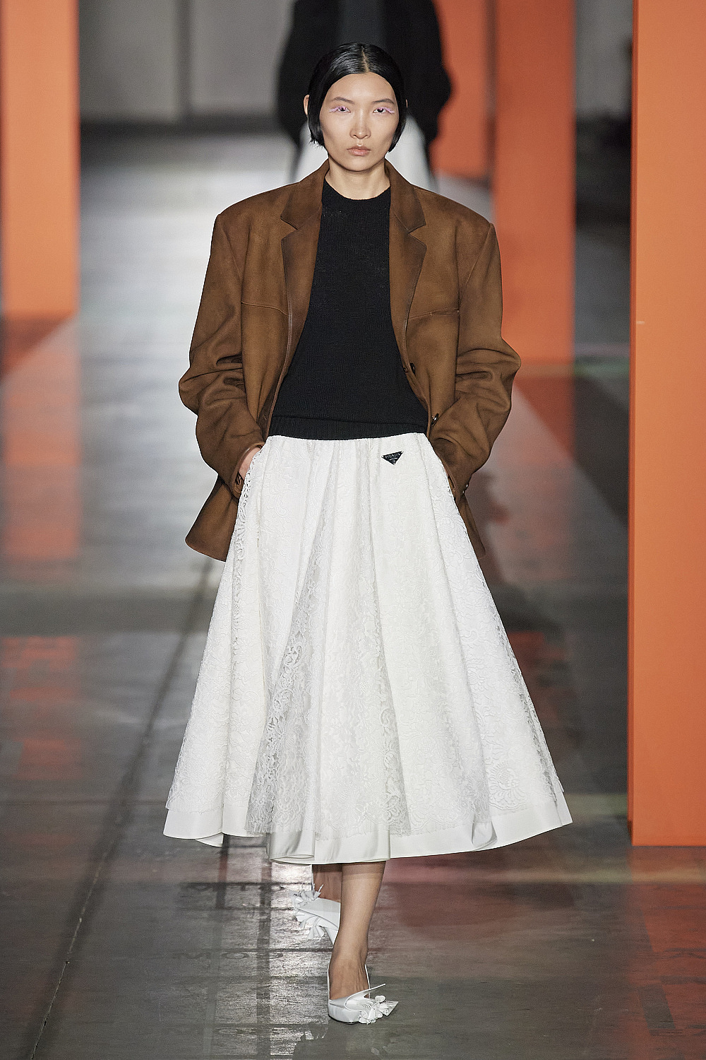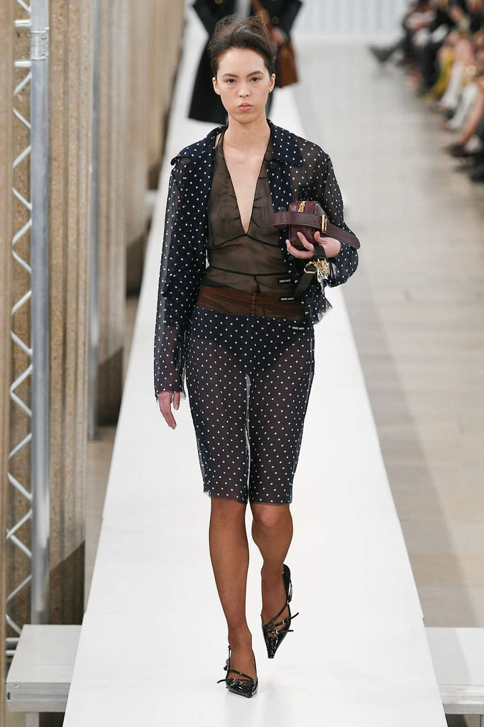 Miu Miu, що вже другий сезон акцентує увагу на спідницях міні, прозорих тканинах та, звісно, луках «без низу». Також Prada, що крокує поруч із брендом-сестрою.