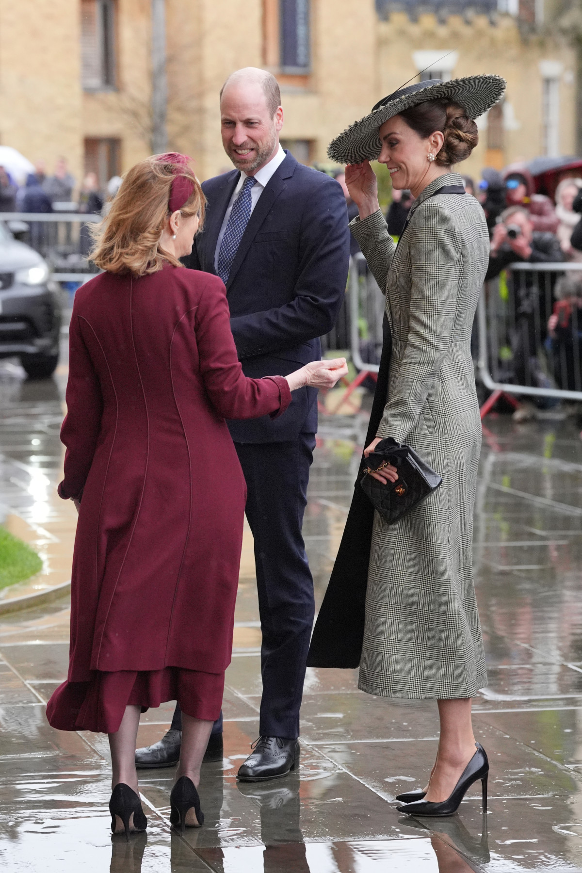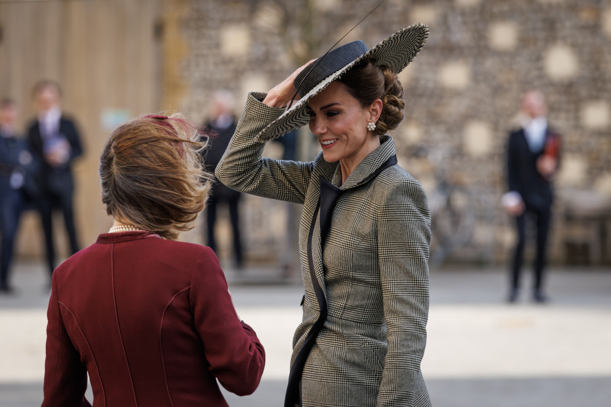 Кейт з’явилася у витонченому чорно-білому ансамблі з характерним візерунком «гусяча лапка» — безпрограшному символі британської елегантності. Її пальто з чіткою лінією плечей та акцентом на талії виглядало стримано, але дуже сучасно, а капелюх із широкими полями додав образу драматичності.