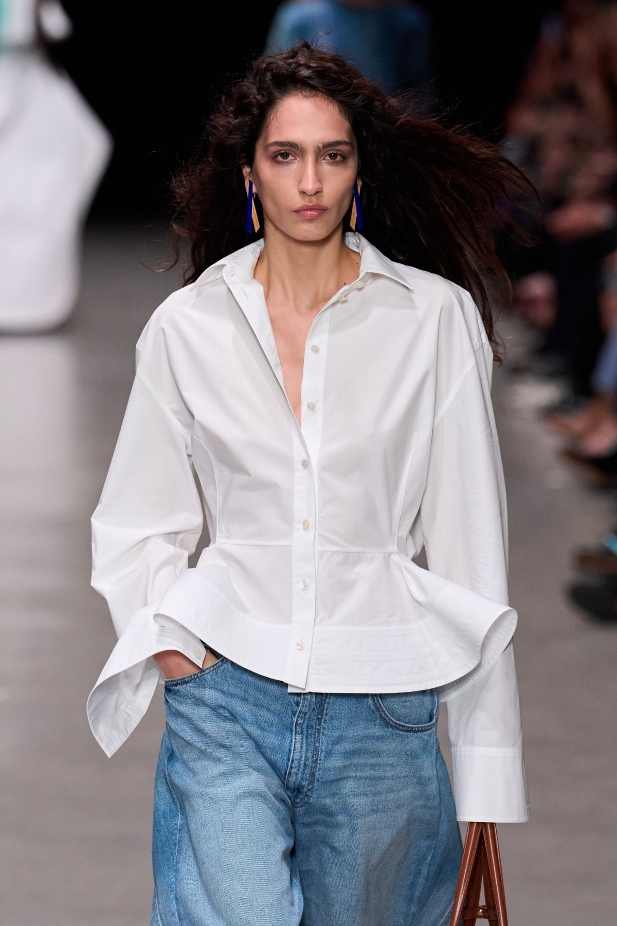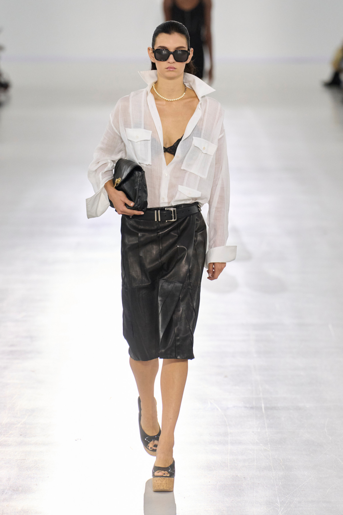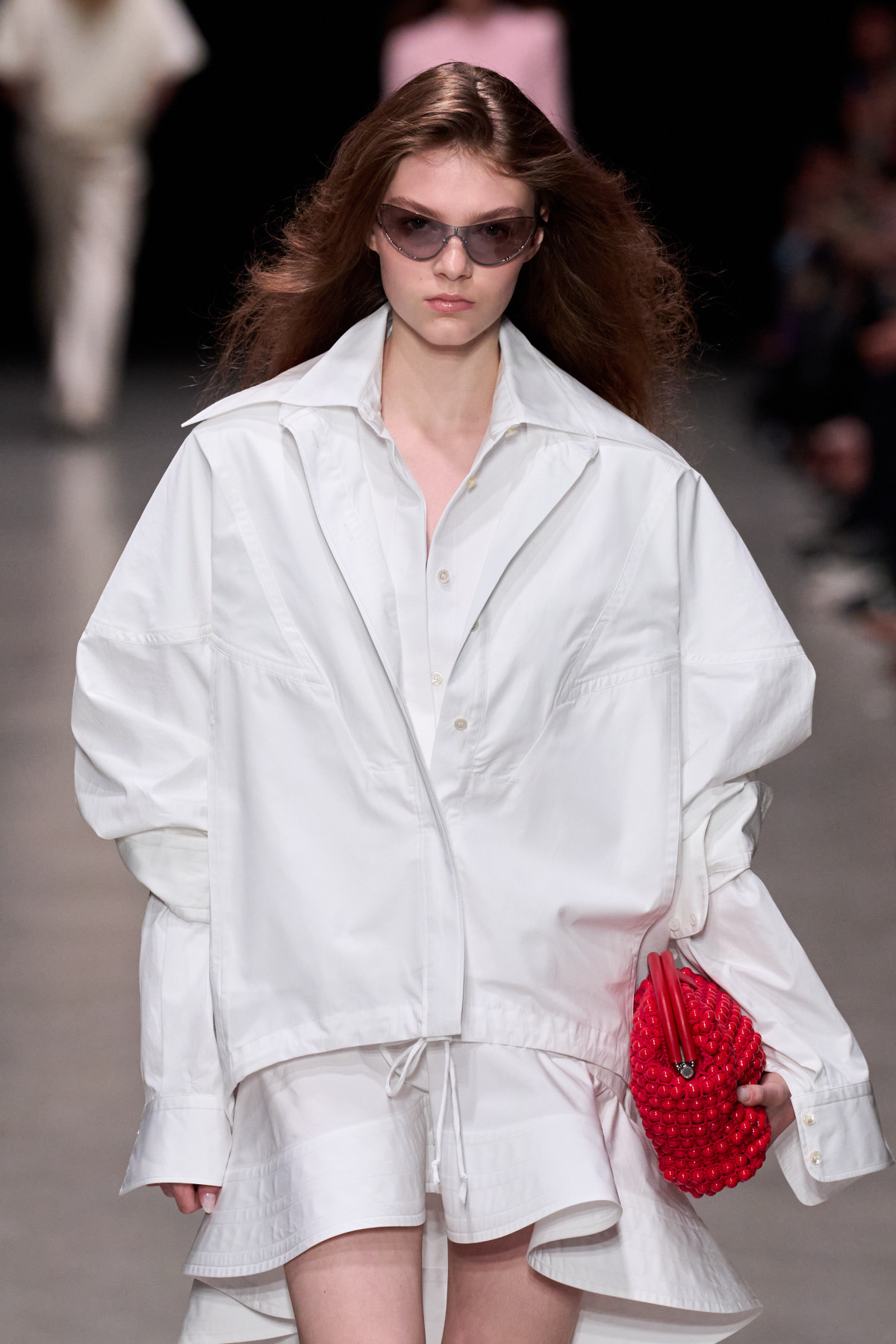 Стелла Маккартні натомість зосередилася на виразних акцентах. Дизайнерка презентувала моделі, що стягувалися на талії, утворюючи пишні оборки на подолі. Водночас верхня частина сорочки й рукави залишалися незмінними прямими.