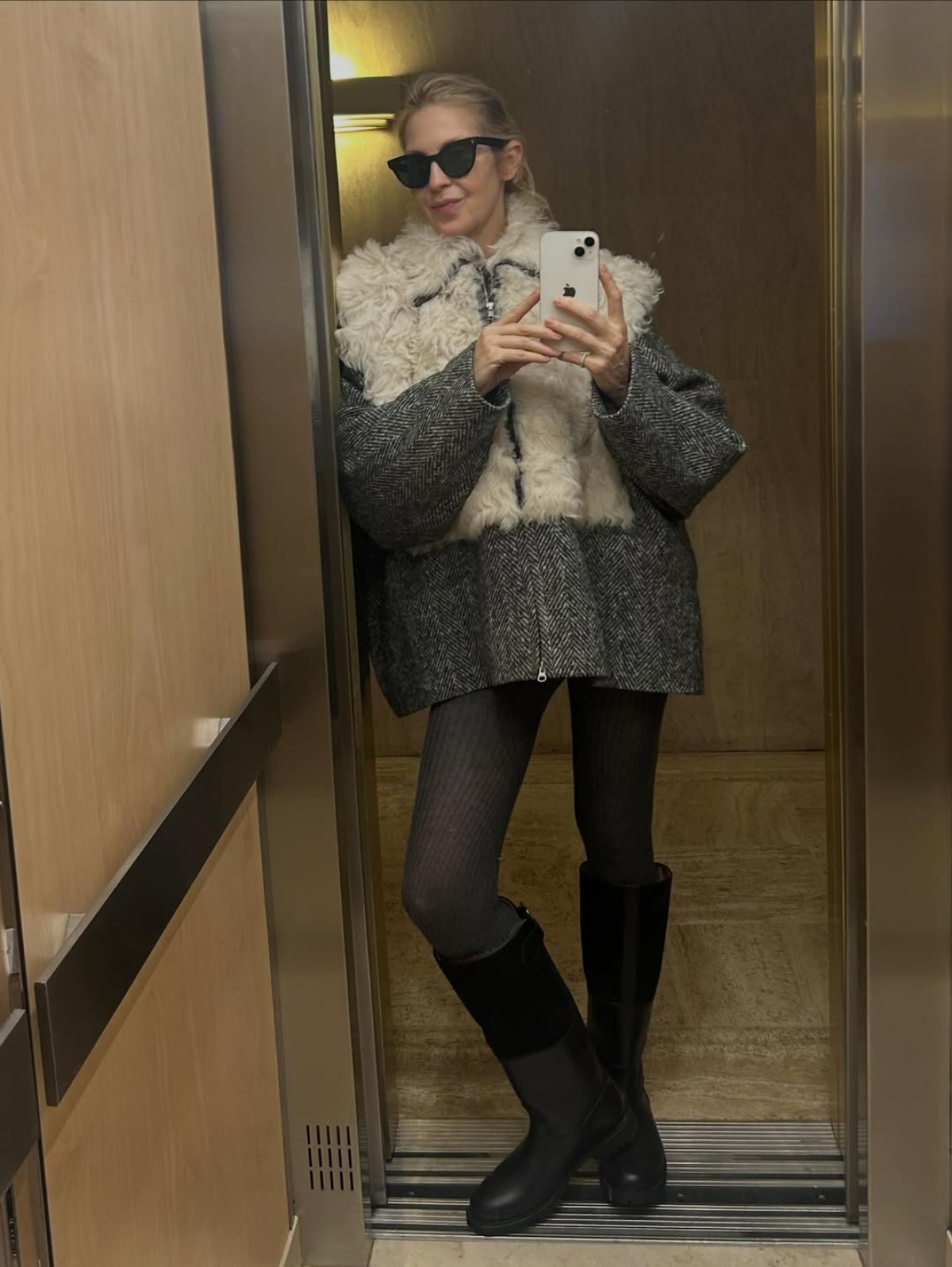 Свої образи з бомбером Келлі доповнила базовими, але безпомилково підібраними речами. Спершу акторка стилізувала верхній одяг із графітовими легінсами та високими чоботами, зробивши ставку на чіткий силует і максимальний комфорт — варіант, який легко повторити для активних зимових буднів.