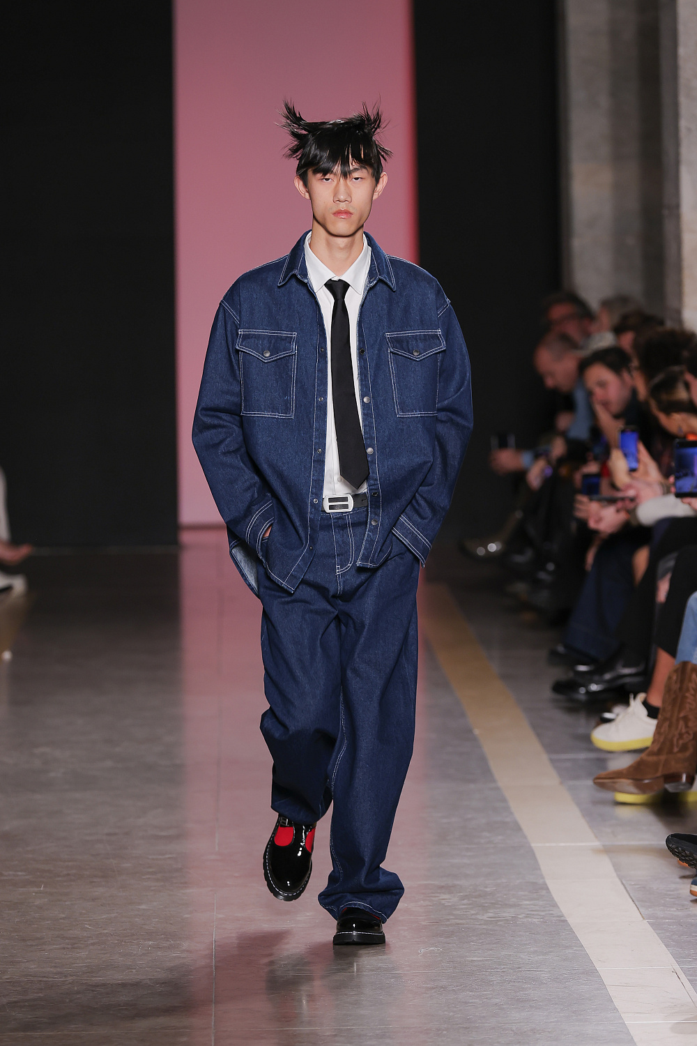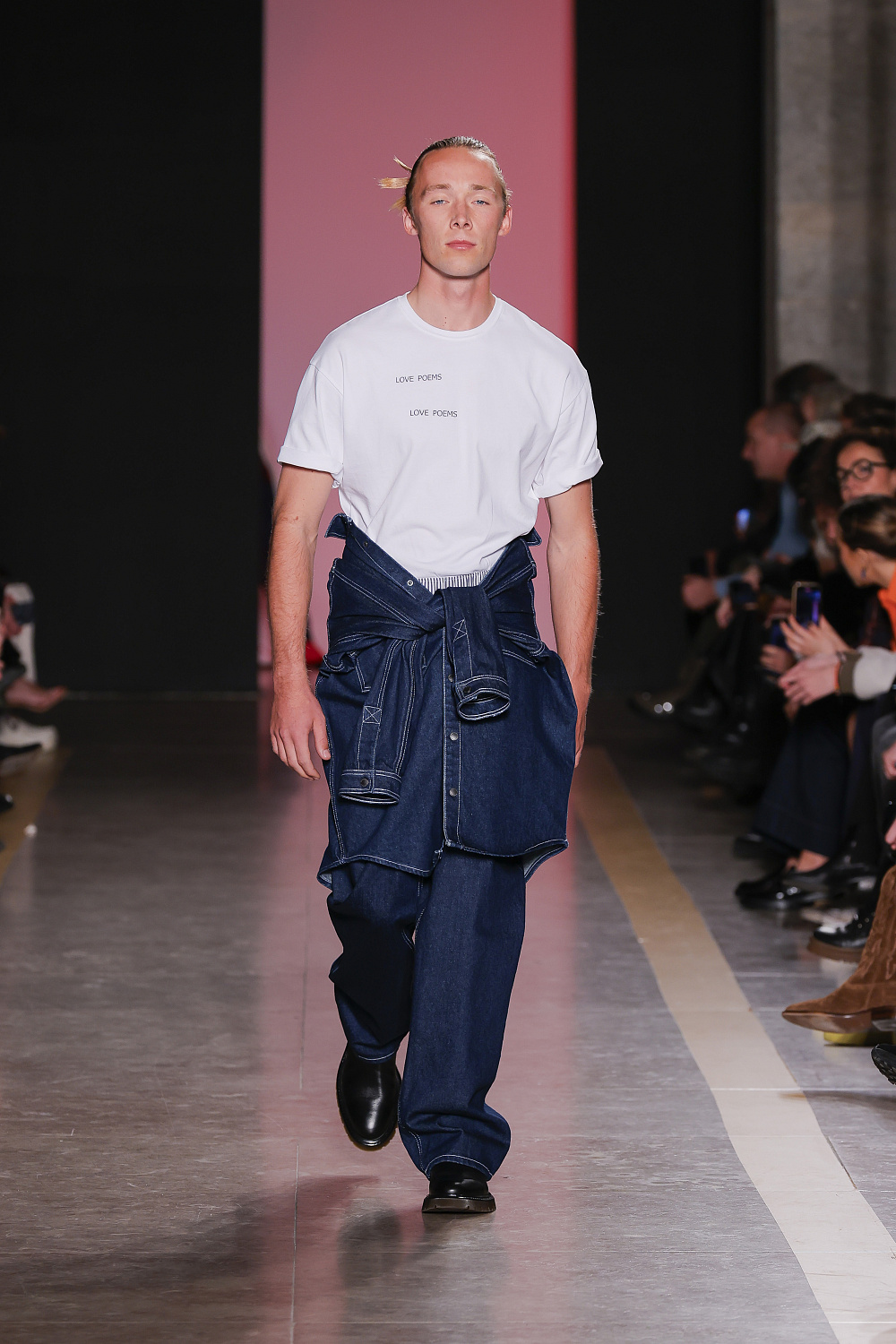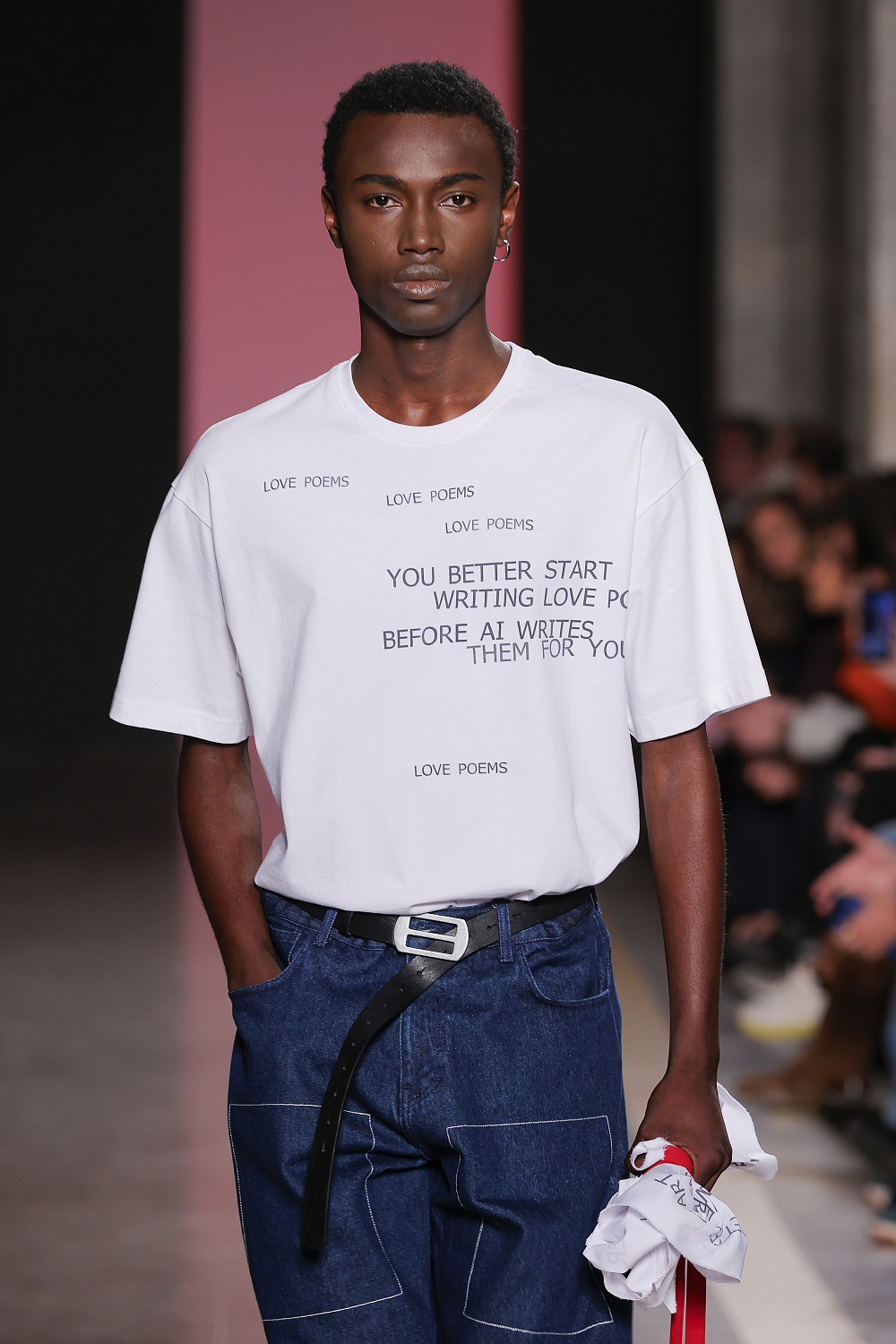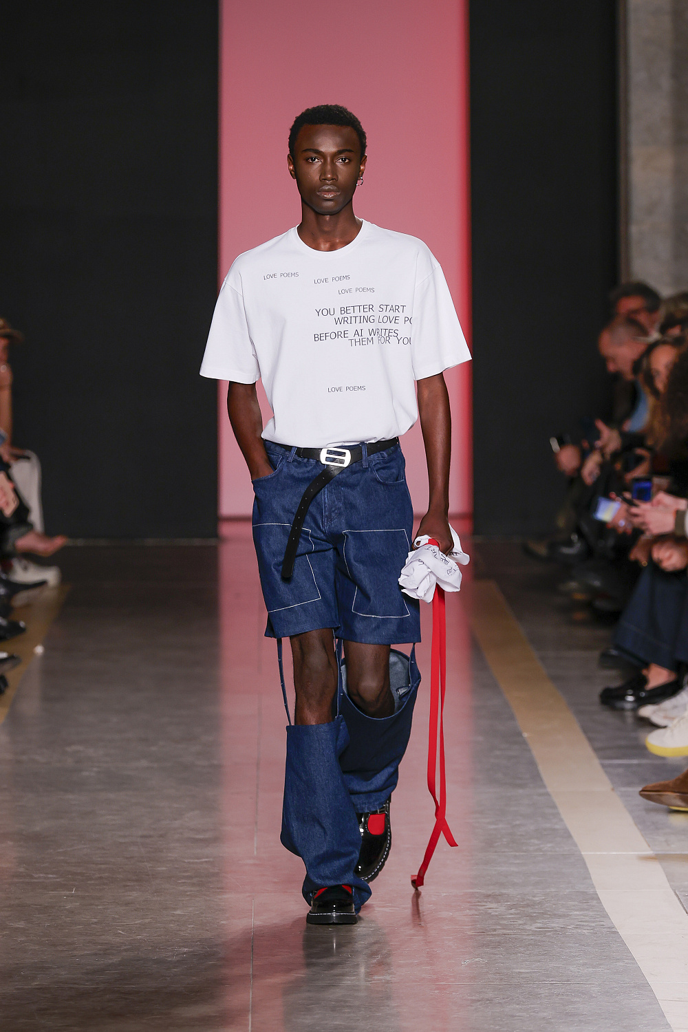 Ще одну колекцію, створену із залученням штучного інтелекту, презентували Lion of Porches X Paatiff. На подіумі ми побачили різні варіації речей із деніму в поєднанні зі своєрідним officecore: це й об`ємні джинси в комплекті з класичною білою сорочкою та чорною краваткою, і брюки та куртки з деформаціями, і футболки з красномовним слоганом You better start writing love poems, before AI writes them for you. Краще і не скажеш!