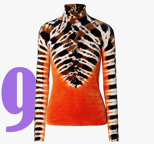 Водолазка Proenza Schouler на 9-м месте по популярности, так как tie-dye до сих пор является одним из самых быстрорастущих ключевых поисковых запросов года с ростом числа запросов на Lyst на 154% и более 32 000 упоминаний в социальных сетях.