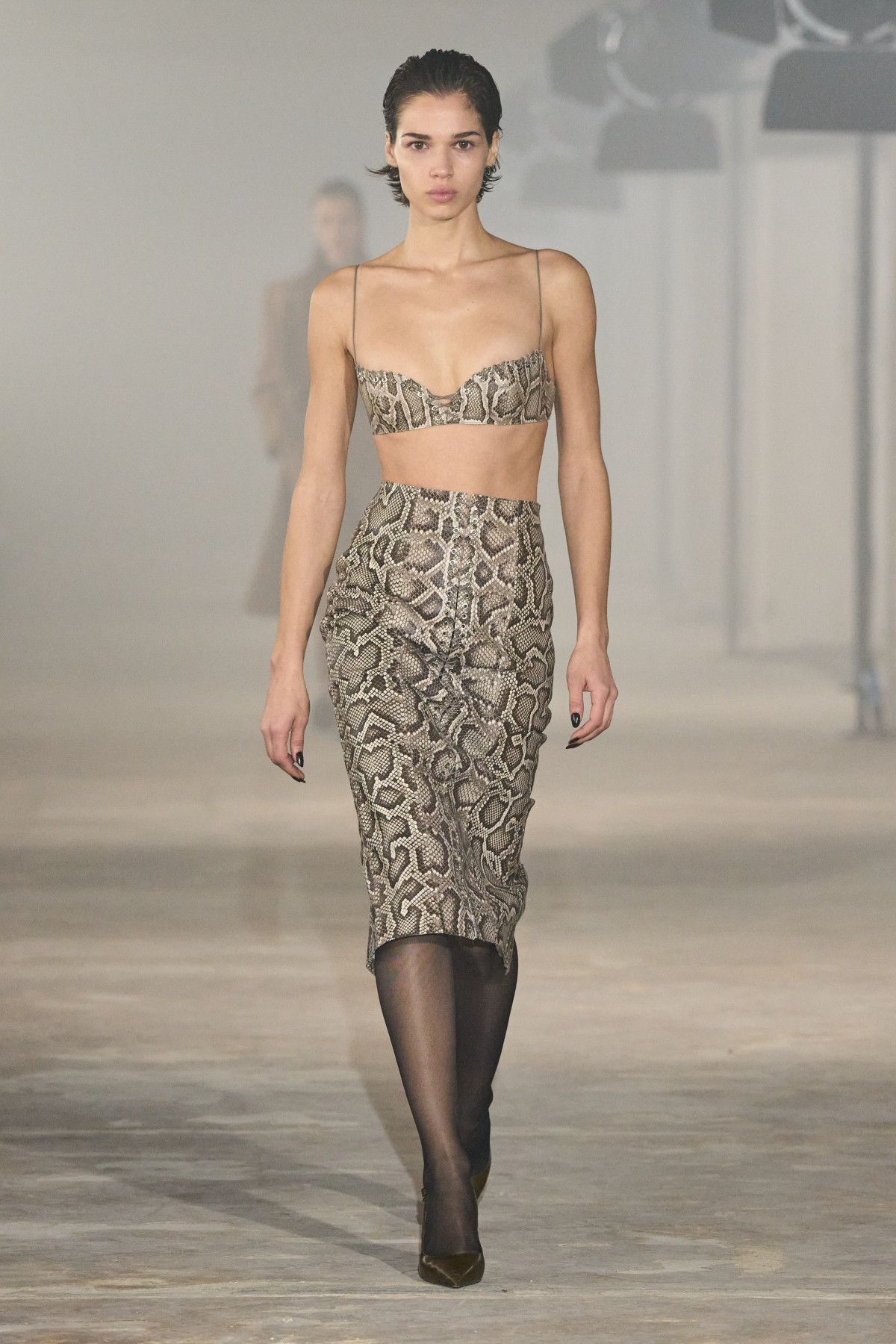 Зокрема, найвиразніше він проявився в елементах низу. Бренди Gabriela Hearst та Saint Sernin додали до своїх колекцій елегантні спідниці-олівці прямого крою, тоді як Roberto Cavalli та Junya Watanabe зупинилися на універсальних брюках — вільних або дещо розкльошених. Поєднували їх здебільшого з верхом у нейтральних відтінках чи, навпаки, створювали total looks всуціль зі зміїного принту.