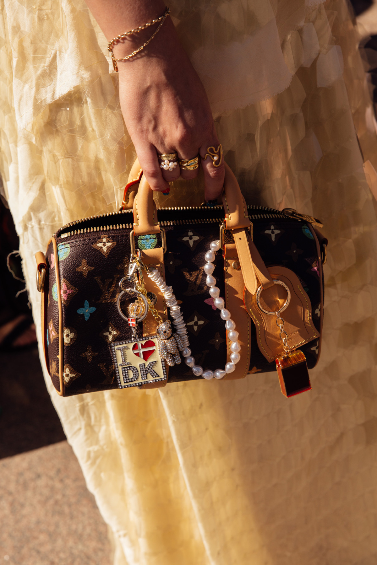 Аби ще більше надихнутися стилізаціями сумок, звертаємося до образів стрітстайл-зірок, а особливо копенгагенських модниць. На Тижні моди, що пройшов кілька днів тому, дівчата запропонували низку цікавих варіантів, чим можна прикрасити свій аксесуар: від намиста з перлів і нашивок до м’яких іграшок із Гаррі Поттером, телепузиками чи ведмедями.