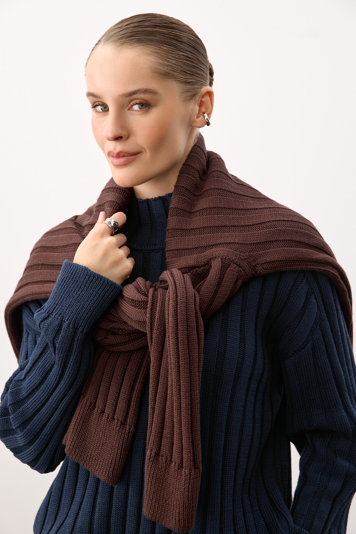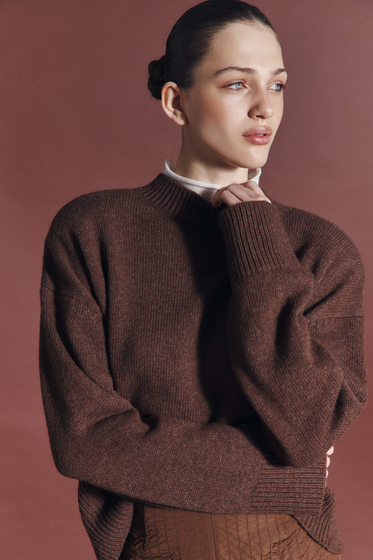 Не менш органічно светр поєднується з джинсами чи класичними брюками. Світлий денім підкреслюватиме теплоту шоколадного відтінку, тоді як чорні або бежеві штани додадуть елегантності та графічності. Для більш розслабленого варіанту радимо обрати шкіряний чи трикотажний низ — такий ансамбль буде актуальним навіть без додаткових акцентів.
