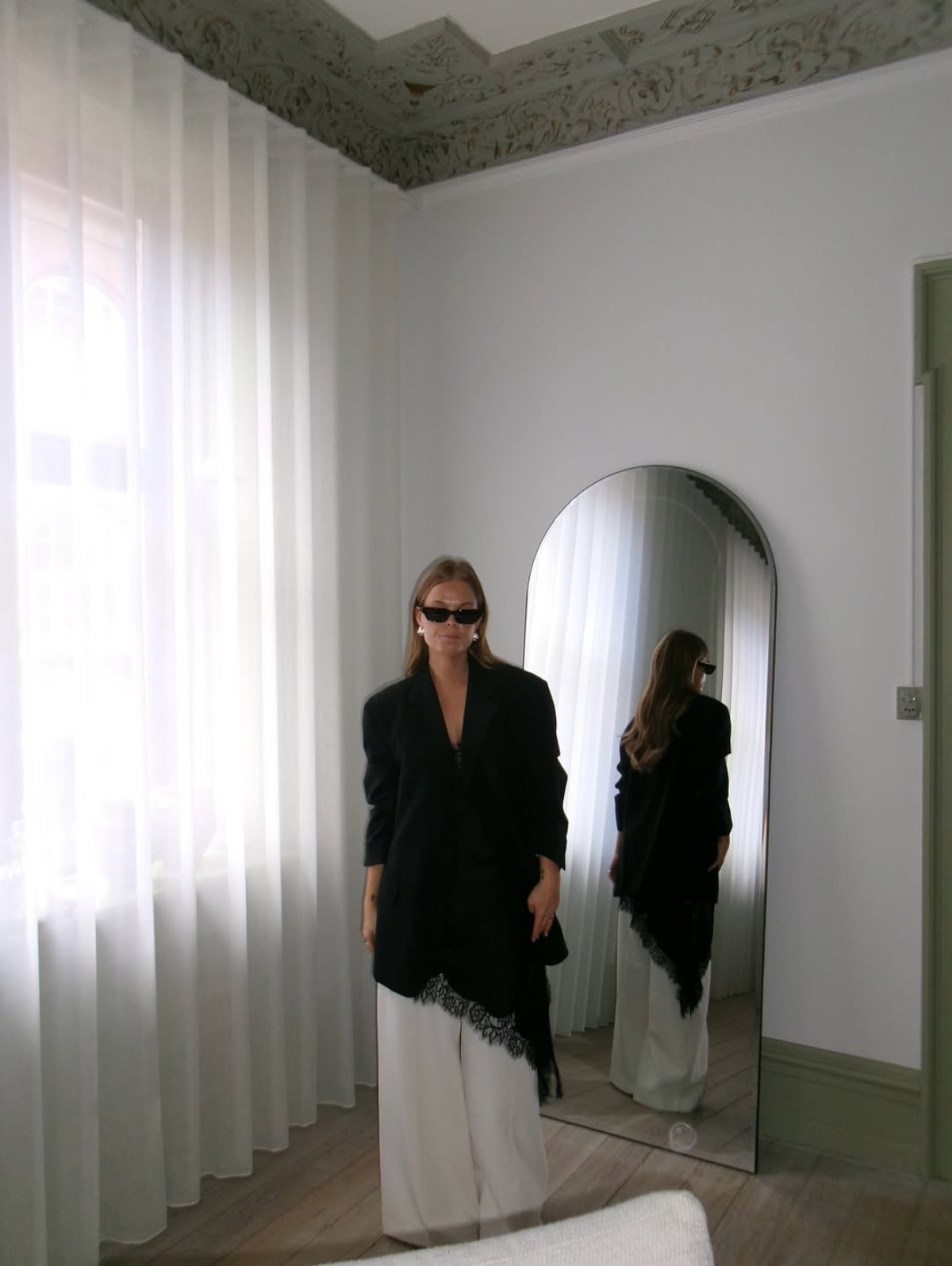 Оберіть найулюбленіші брюки — чи то базові палаццо, чи то трендові аладдіни, чи то все ті ж джинси — і скомбінуйте їх із витонченою сукнею з мереживними деталями на подолі й декольте. Ще краще, якщо річ вирізнятиметься й асиметричним кроєм: так, образ отримає ту саме акцентну деталь, яка приковуватиме всі погляди.