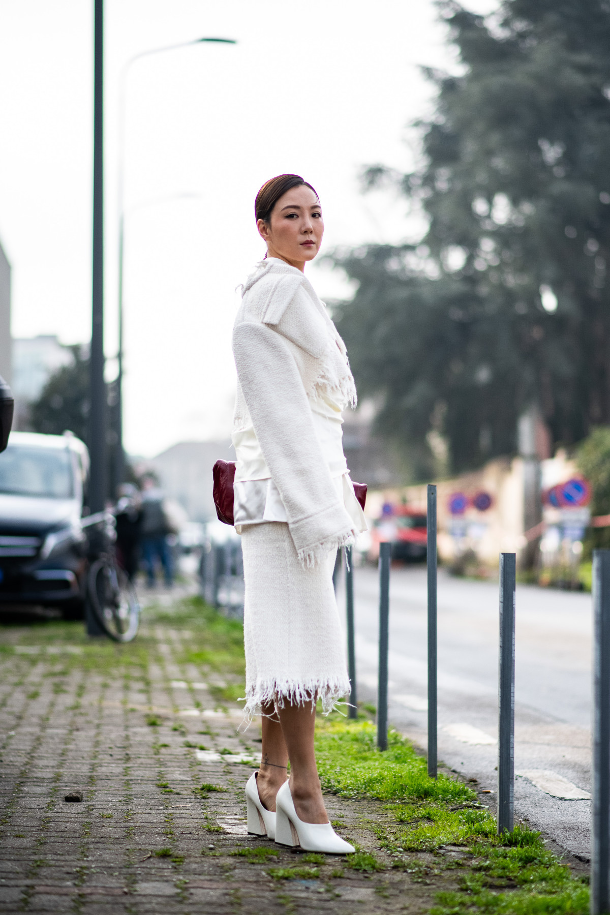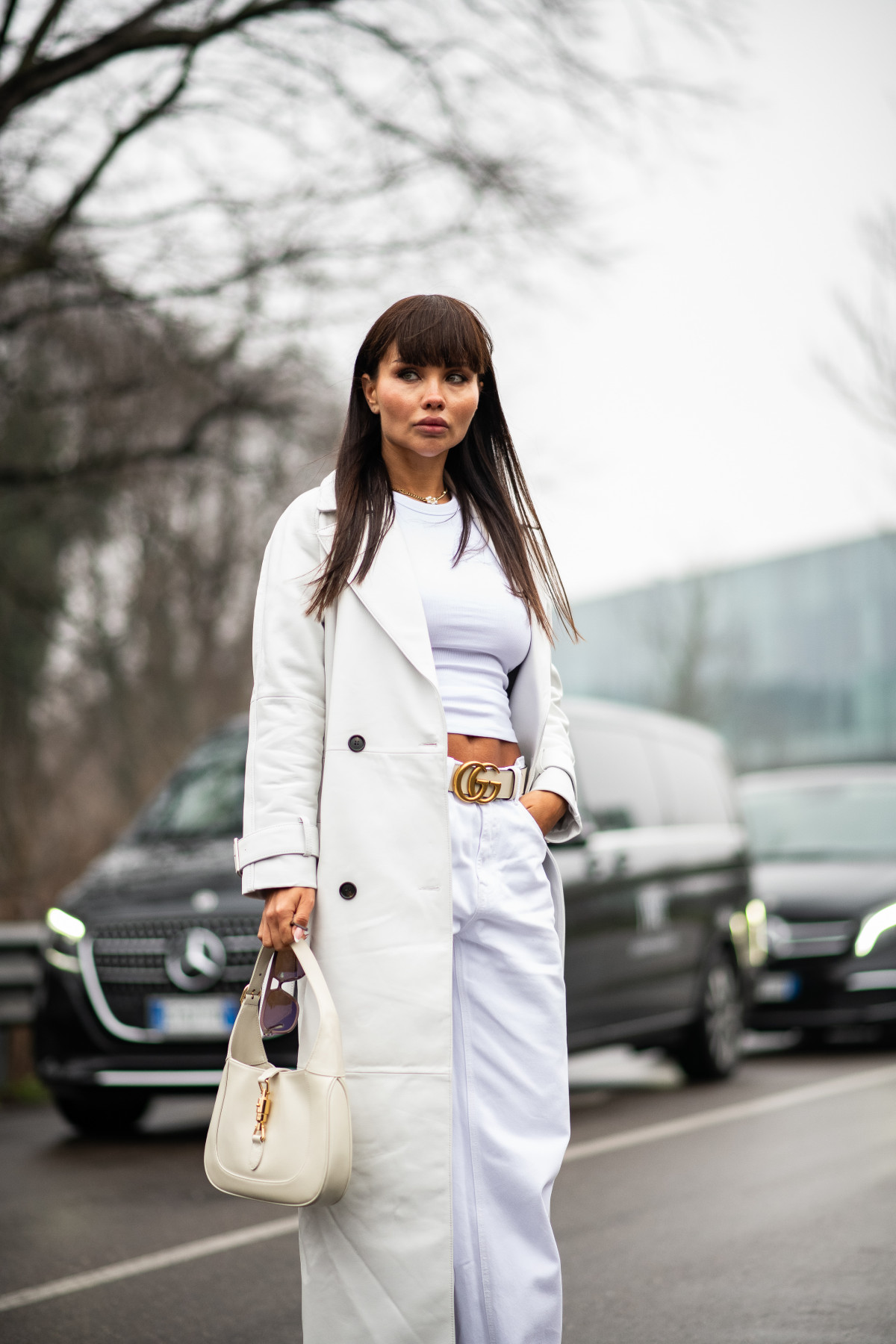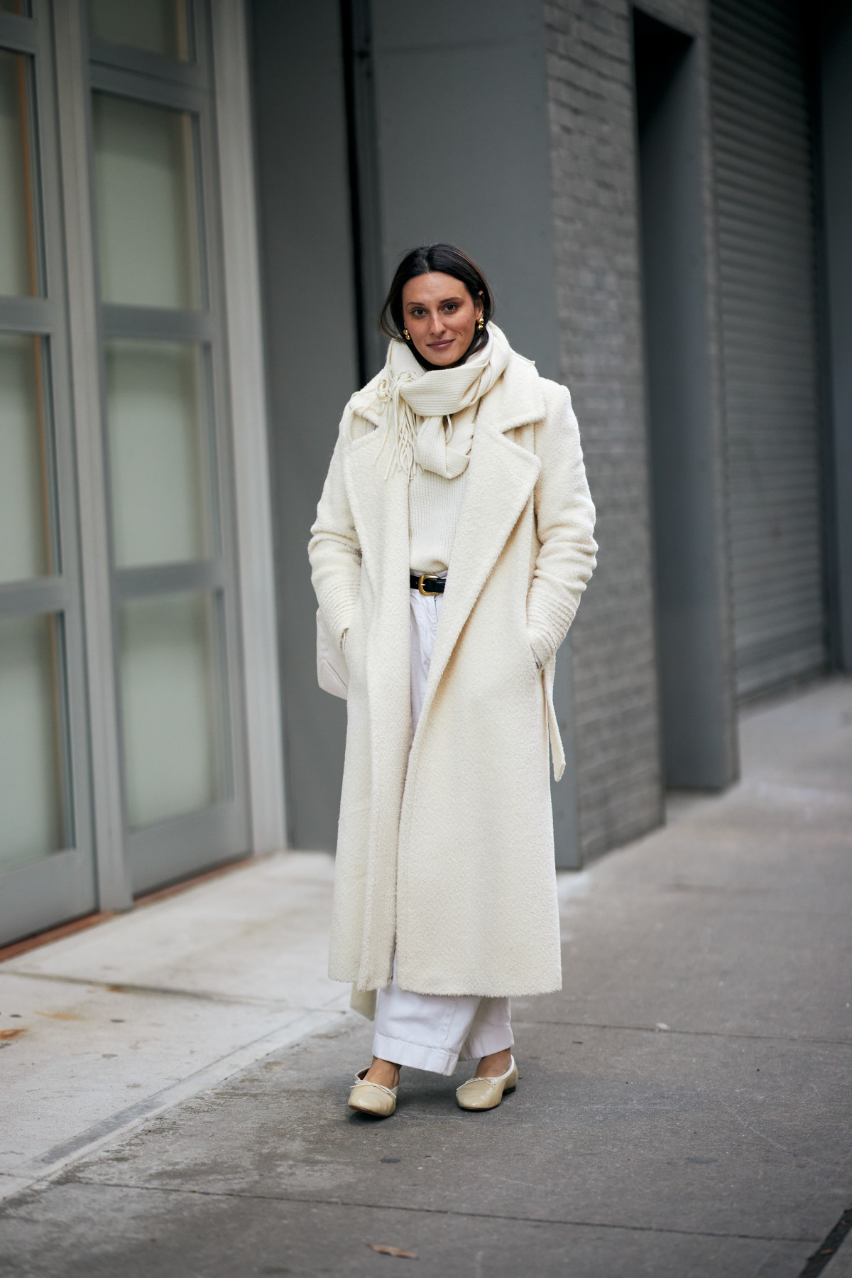 Взимку total white розкривається по-особливому: на тлі сірого міста чи свіжого снігу він виглядає ще чистішим і вишуканішим. Це той випадок, коли мінімалізм говорить голосніше за складні декоративні рішення, а кожна річ — від пухнастого светра до лаконічних шкіряних черевиків — стає частиною продуманого гармонійного ансамблю.