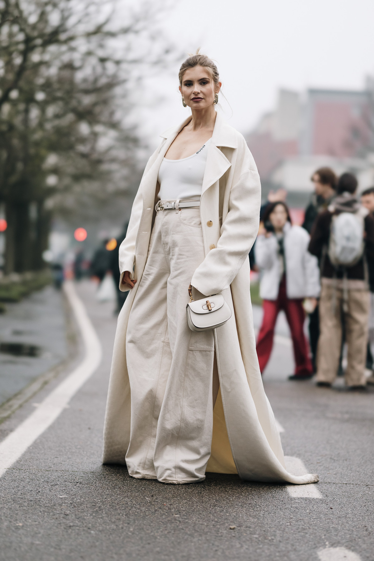 Попри зовнішню простоту, повністю світлий образ дає можливість експериментувати: поєднувати об’ємний верх і стриманий низ, міксувати матові та глянцеві фактури, балансувати між різними естетиками. У цьому білосніжному полі легко грати зі стилями, не боячись «перевантажити» лук — стримана палітра все утримає.