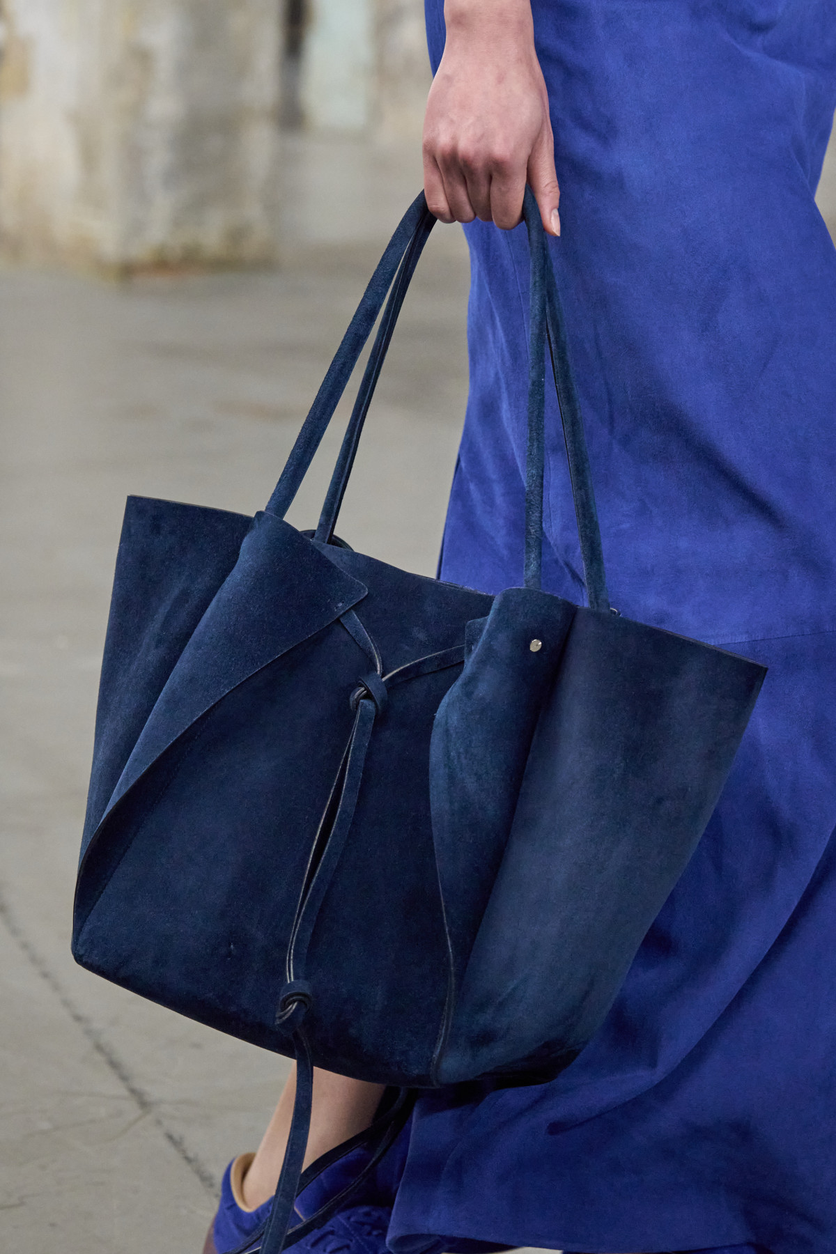Останній, але не менш стильний варіант аксесуарів — у темно-синьому кольорі. Він такий же універсальний, як, до прикладу, чорний, однак при цьому ж дещо цікавіший та акцентніший. Cloe, Akris і Gabriela Hearst, зокрема, презентували на подіумах кілька варіантів — він об’ємних замшевих до мініатюрних шкіряних.