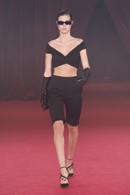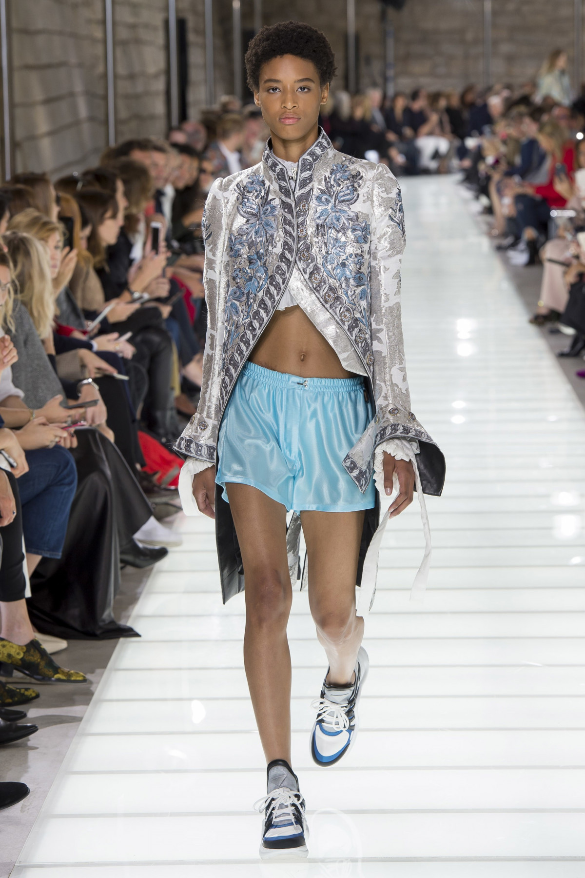 Эклектичный микс: укороченный жакет-камзол на голое тело со спортивными шортами.