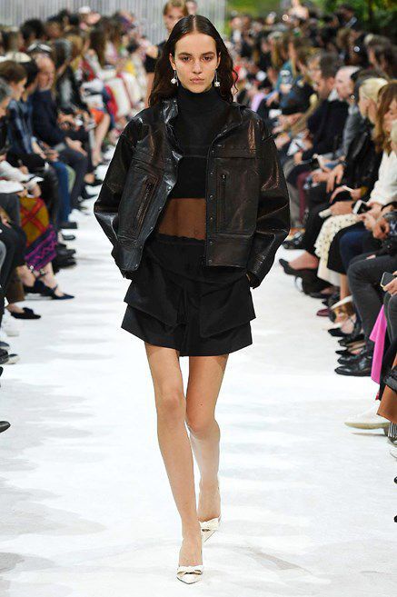 Твидовый костюм парижских буржуа превратился в наряд для похода в модный клуб благодаря микротопу с бахромой и пластиковым ботфортам.