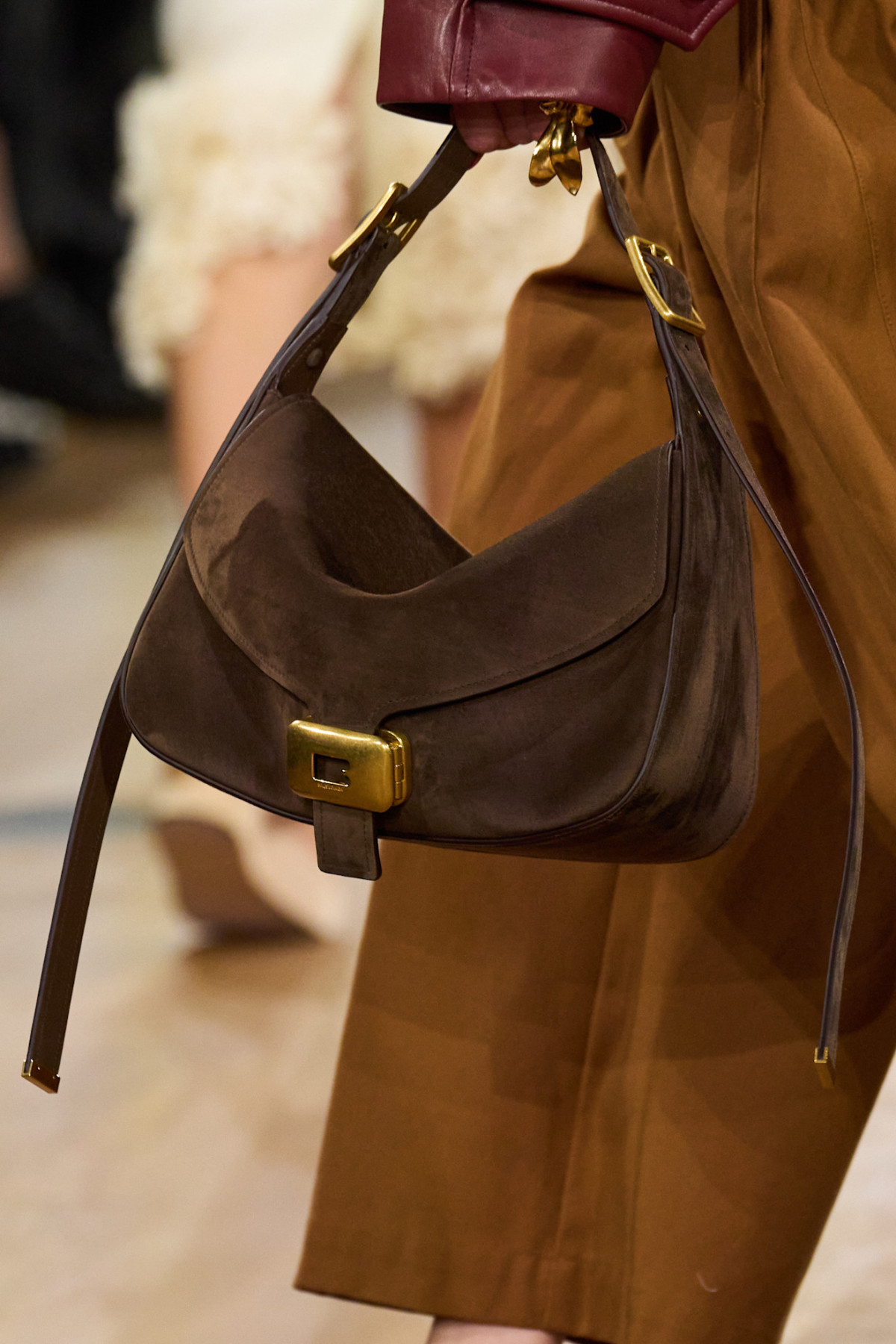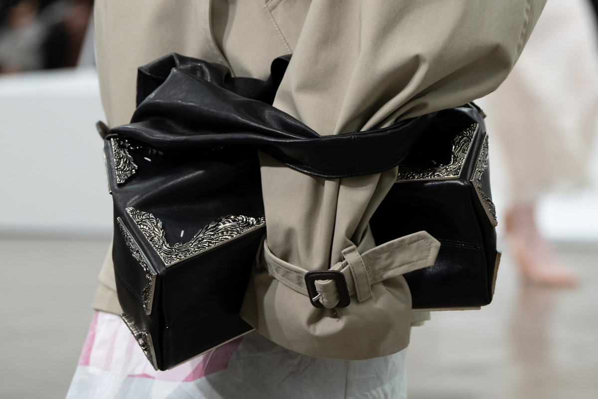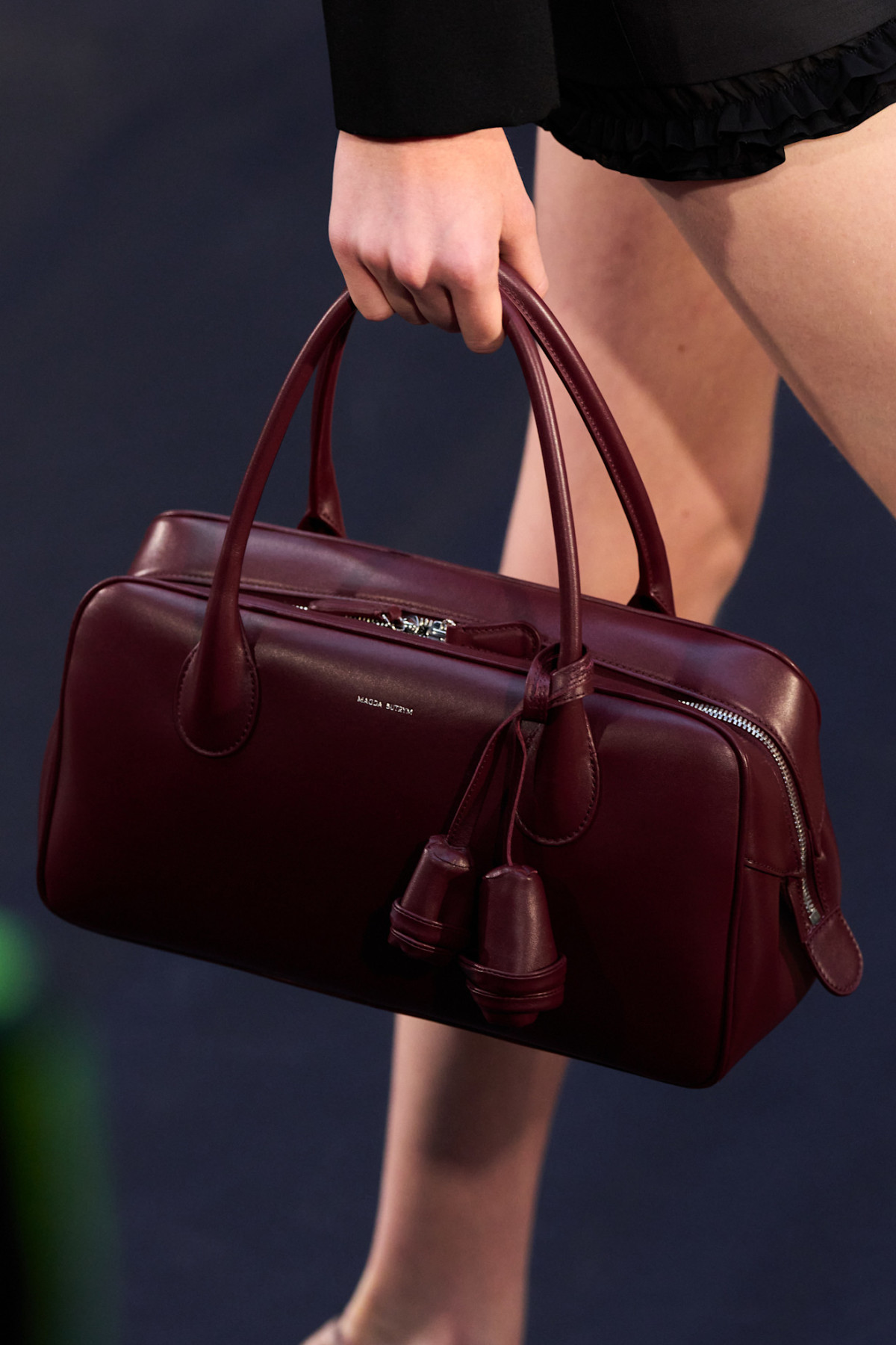 Сумки-мішки — про грайливість і гарний настрій. Цього сезону вони «виросли» до розміру невеликих, але вже цілком практичних сумок. Вони стають ефектним акцентом як у повсякденних, так і у вечірніх образах, проте саме в щоденних образах виглядають найбільш цікаво й контрастно. Шкіряні, текстильні, атласні — усі вони працюють на грі фактур і створюють виразний діалог з одягом. Prada до атласних яскравих сумок-мішечків додає відповідні атласні рукавички.