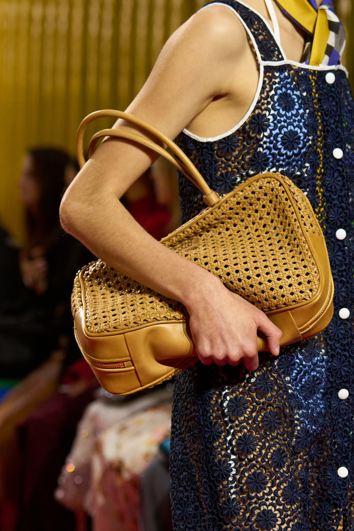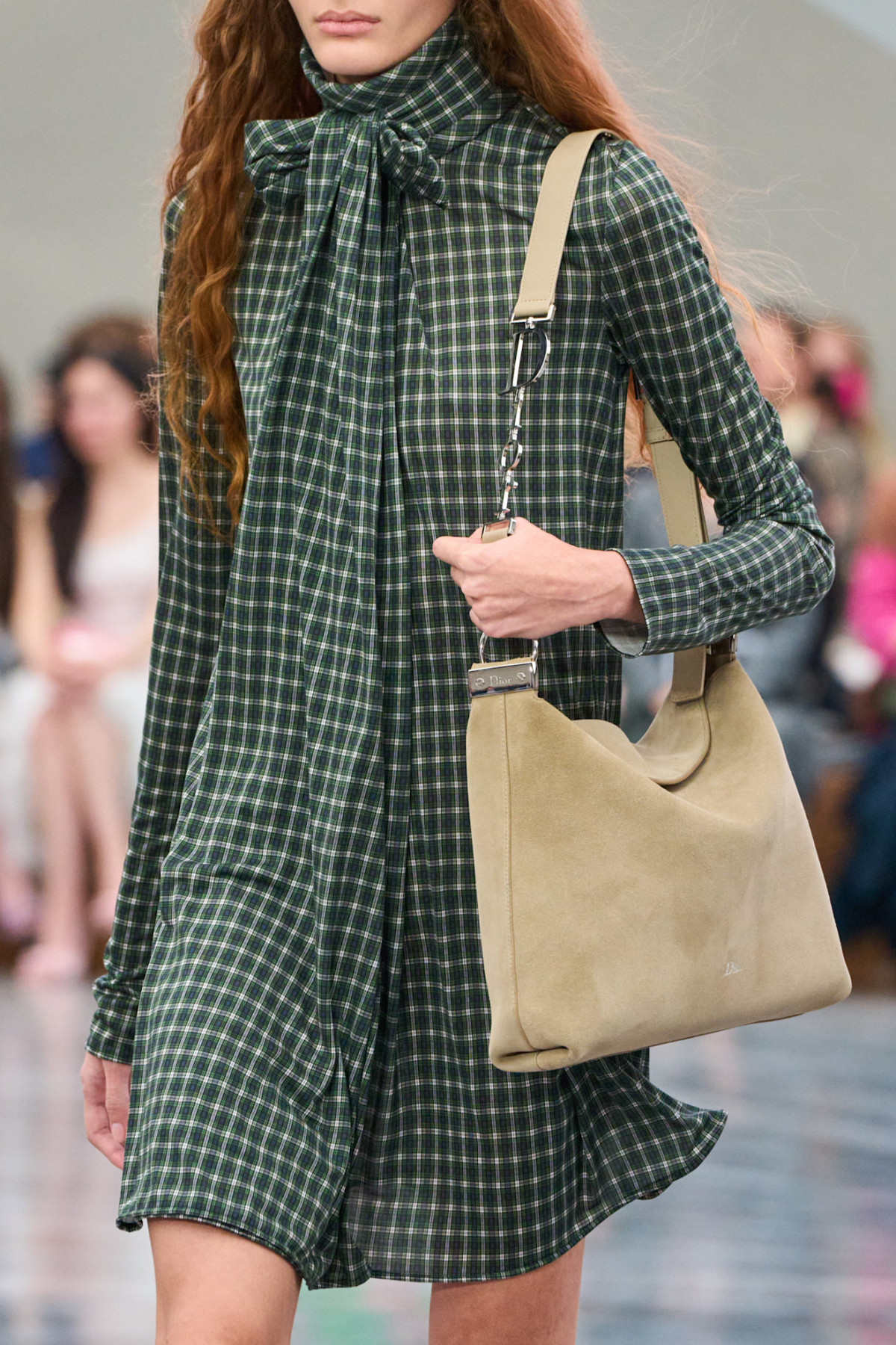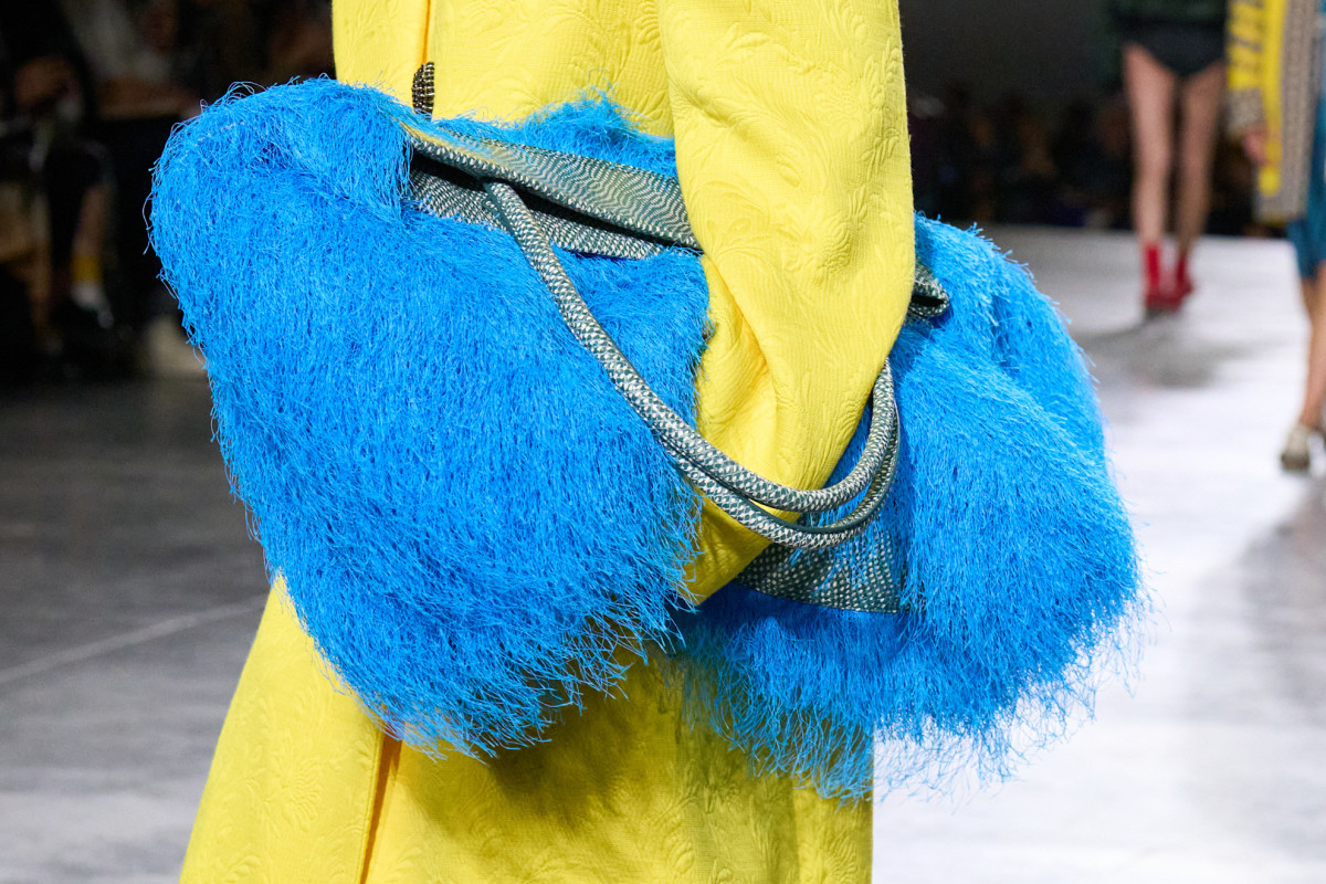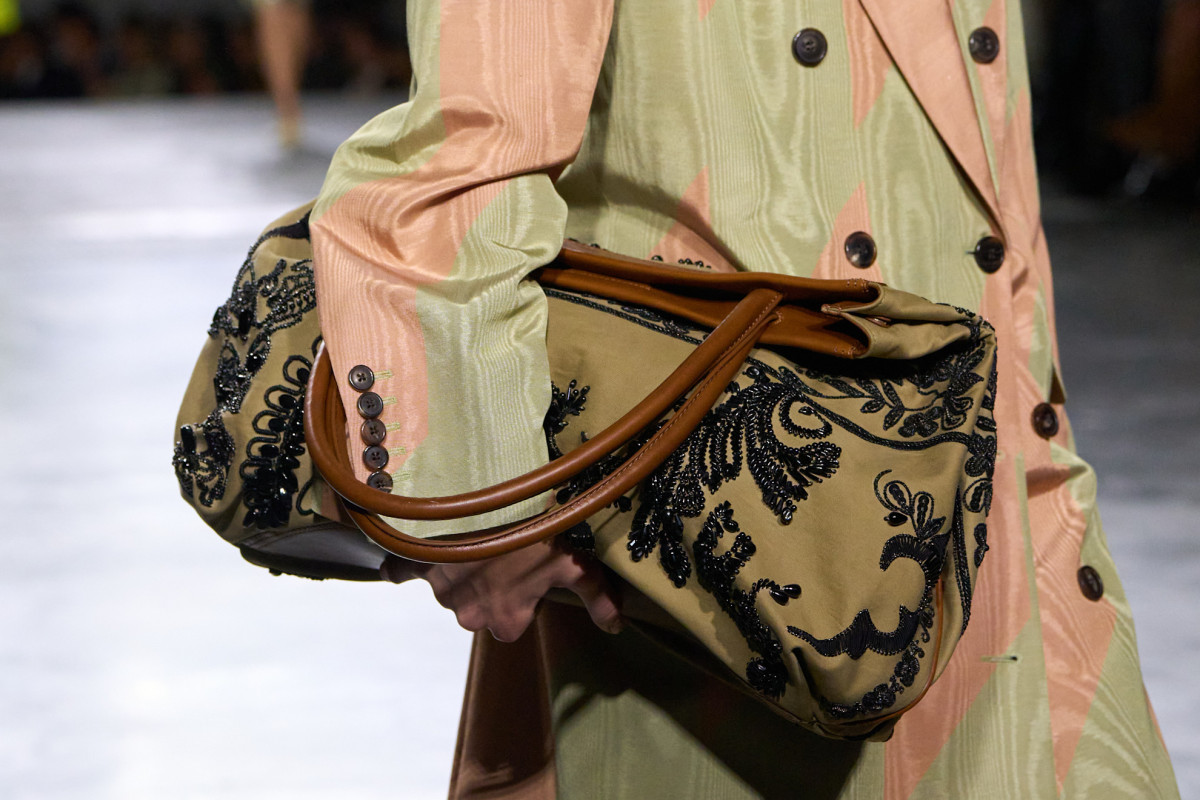 Сумки-мішки — про грайливість і гарний настрій. Цього сезону вони «виросли» до розміру невеликих, але вже цілком практичних сумок. Вони стають ефектним акцентом як у повсякденних, так і у вечірніх образах, проте саме в щоденних образах виглядають найбільш цікаво й контрастно. Шкіряні, текстильні, атласні — усі вони працюють на грі фактур і створюють виразний діалог з одягом. Prada до атласних яскравих сумок-мішечків додає відповідні атласні рукавички.