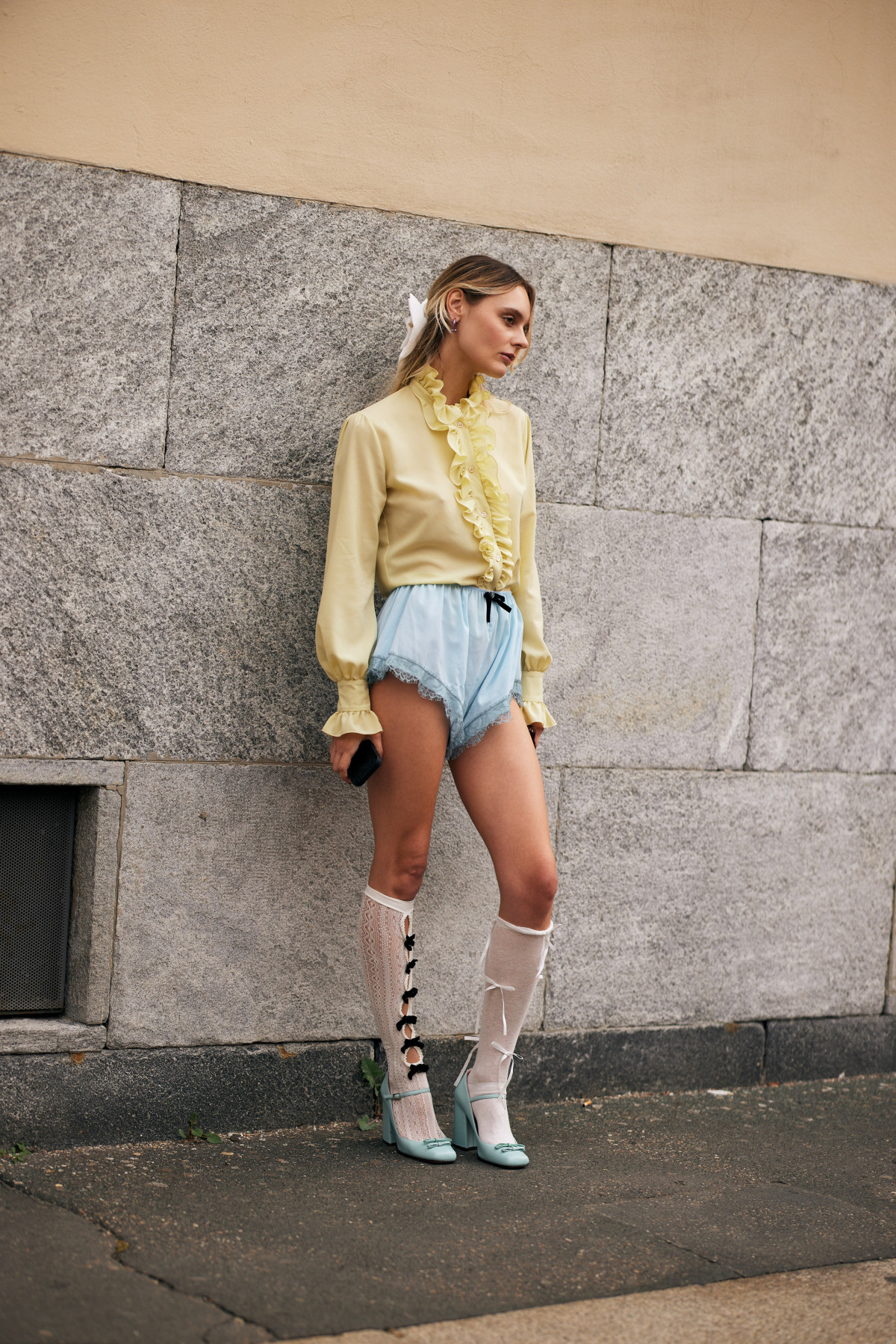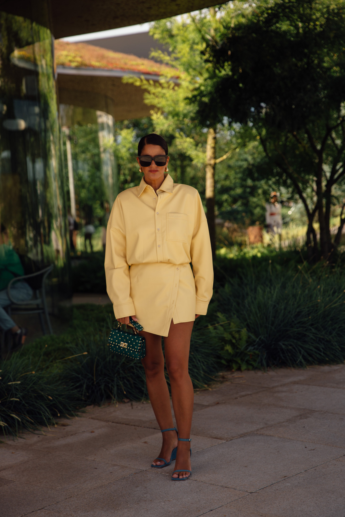 Модниці теж не забарилися з власним баченням поєднань цього кольору. Дехто зробив вибір на користь верхнього одягу, зокрема, довгих пальт, що підійдуть для прохолодної весняної погоди. Інші ж піддалися бохо-естетиці та продемонстрували стилізації з повітряними сукнями, блузами, прикрашеними рюшами, та ніжними жакетами. А були й ті, хто зупинився на позачасовій базі: мінімалістичних сорочках, блейзерах та вільних спідницях.