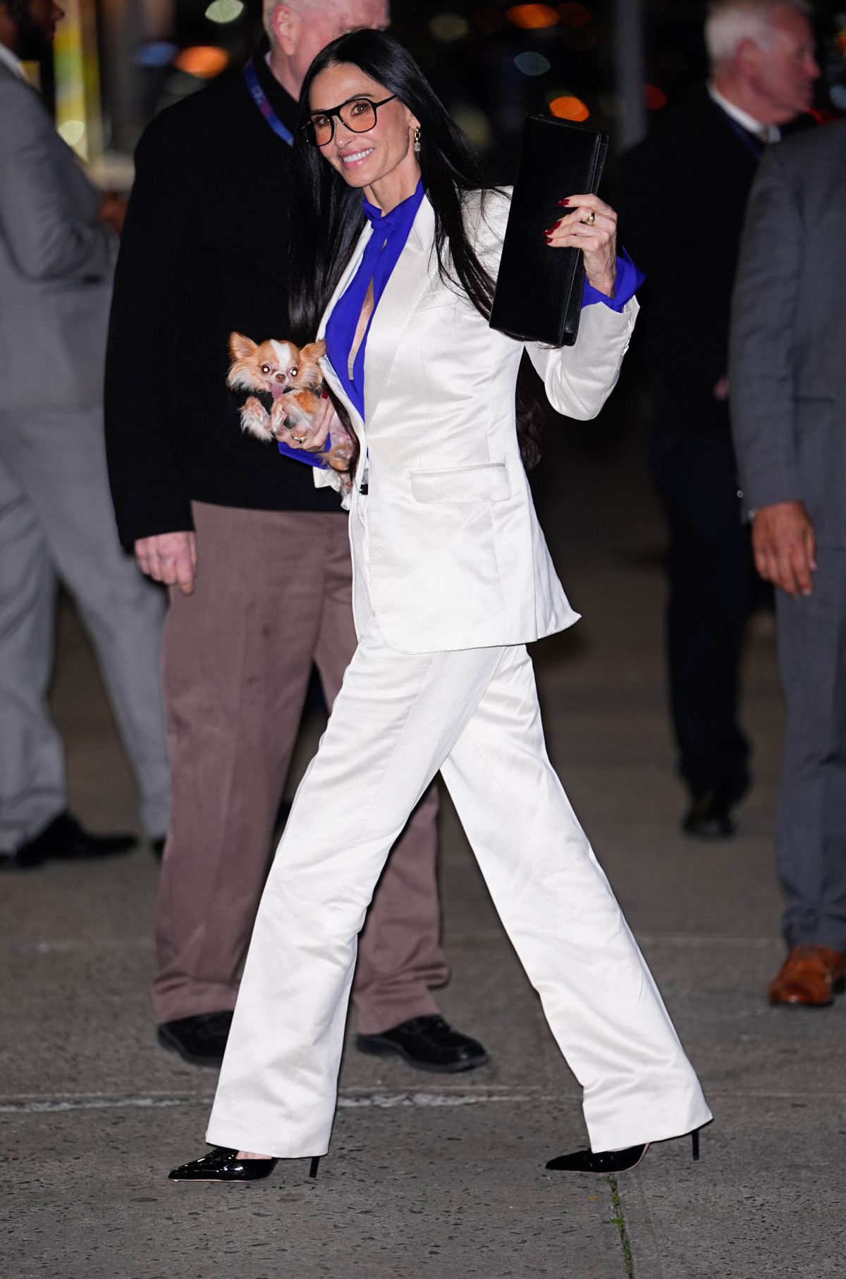 В останні тижні зірка пропонує шанувальникам цілу палітру образів для різноманітних приводів. До прикладу, напередодні свого дня народження вона завітала на вечірнє шоу у вишуканому сатиновому костюмі в білосніжному відтінку, якому по праву можна віддати титул одного з найгарячіших трендів зимової пори. Доповнила його Демі контрастною кобальтовою блузою та лоферами на високих підборах — елегантно, незвично й дуже стильно.