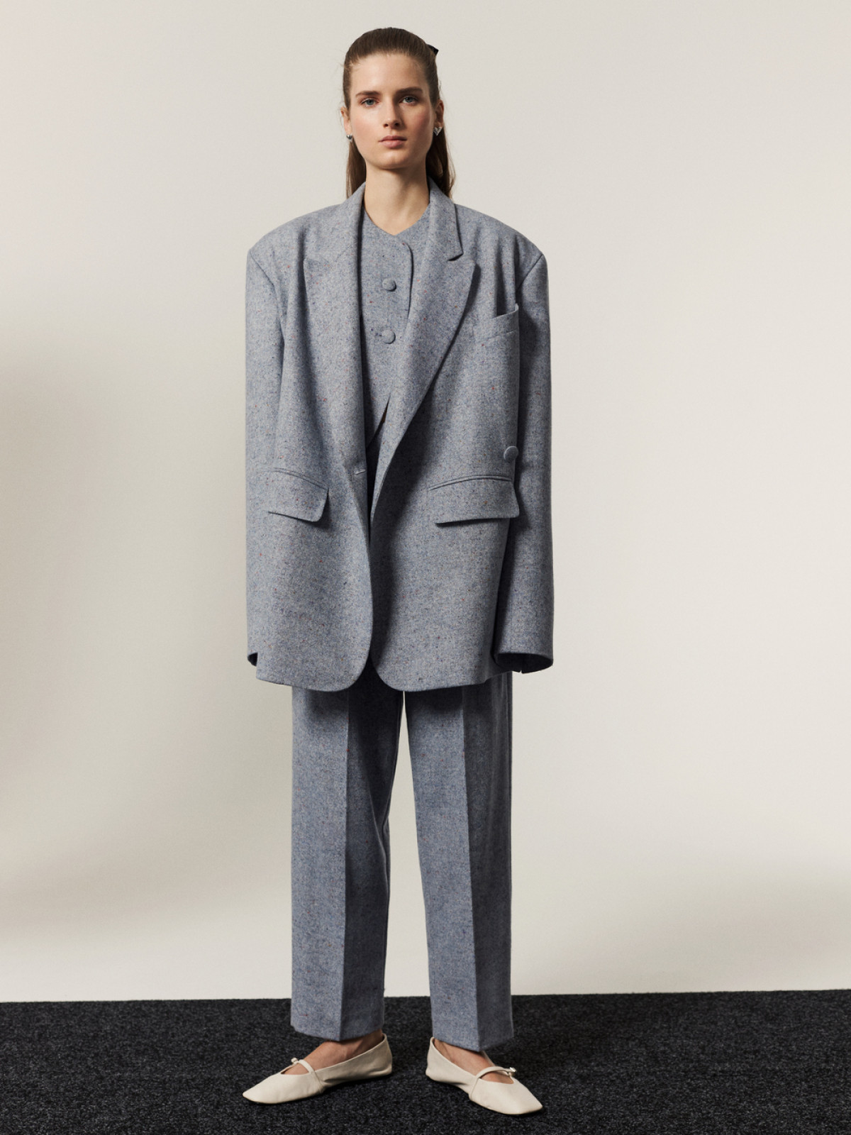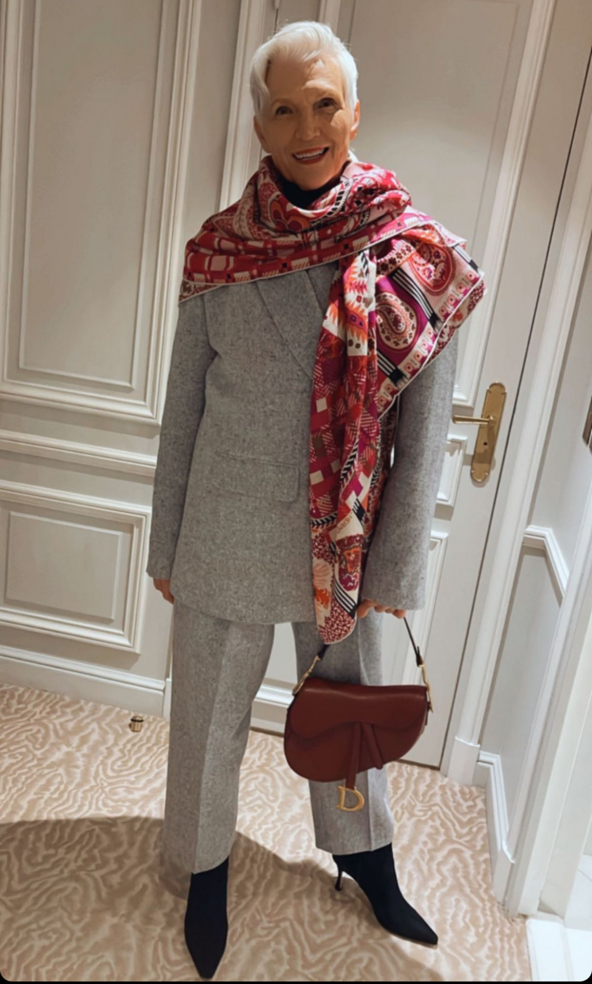 Тиждень високої моди в Парижі традиційно збирає на свої шоу величезну кількість знаменитостей і fashion-інфлюенсерів. Пропустити одну з наймодніших подій року не змогла і мама Ілона Маска — 73-річна Мей Маск. Для появи на публіці вона обрала костюм-трійку з колекції FW’21/22 від Marianna Senchina. Виготовлений з італійської сіро-блакитної вовни, жакет зі спеціально гіпертрофованою лінією плечей доповнений жилетом та брюками з високою талією. Стилістка зірки Джулія Перрі завершила образ бордовою сумкою Dior та шарфом у тон.
