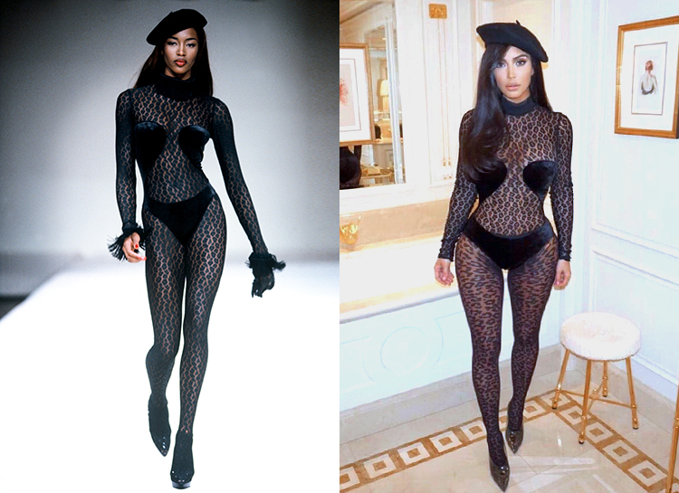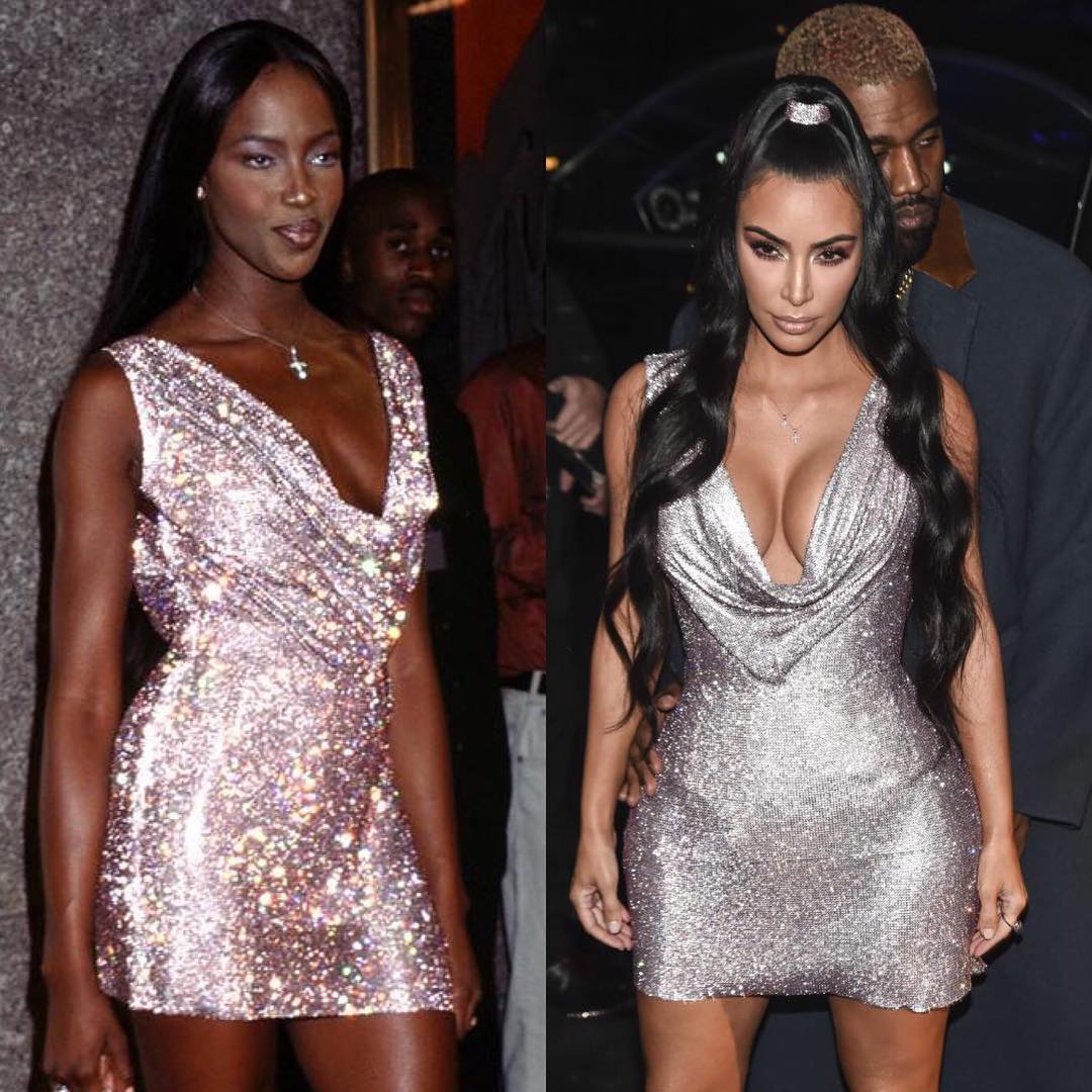 Ось уже другий рік поспіль користувачі соцмереж звинувачують Кім Кардаш’ян в копіювання стилю Наомі Кемпбелл. Зірка реаліті-шоу «надихається» не тільки подіумними, а й вечірніми образами визнаної ікони стилю. Нова хвиля звинувачень посипалася на дружину Каньє Веста після її появи на останньому тижні моди в Парижі (для вечірнього виходу Кім обрала прозорий леопардовий комбінезон – точно такий, в якому 18 років тому вийшла на подіум Наомі). А жовто-блакитна сукня-комбінація, яку Кардаш’ян придбала для весілля друга, тільки підлила олії в вогонь. Зрештою Instagram-зірка не витримала і підняла білий стяг. Кім опублікувала фото в вінтажній сукні з надписом «Наомі назавжди», тим самим зізнавшись в любові до стилю супермоделі. І поки армії прихильників зірок сперечаються, кому та чи інша сукня пасує більше (а параметри, погодьтеся, в Кім і Наомі зовсім різні), пропонуємо освіжити в пам’яті деякі скопійовані образи.