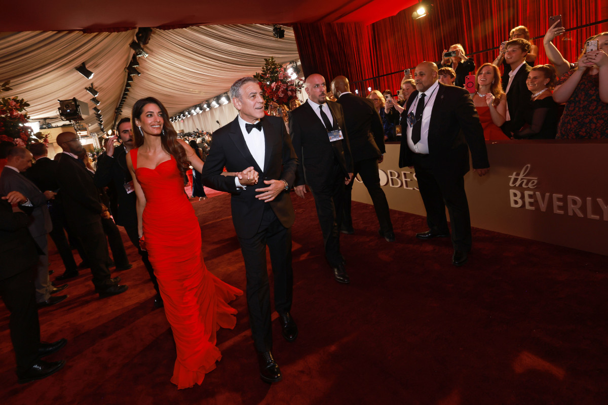 Зірка завітала на червону доріжку події у супроводі коханого Джорджа Клуні. Для такого випадку вона обрала властивий для свого стилю червоний ансамбль, що складався з драпірованої максісукні від Balmain, туфель Jimmy Choo, а також клатчу. Ідеальним доповненням образу стали діамантові сережки Cartier та тенісний браслет з 18-каратного білого золота.