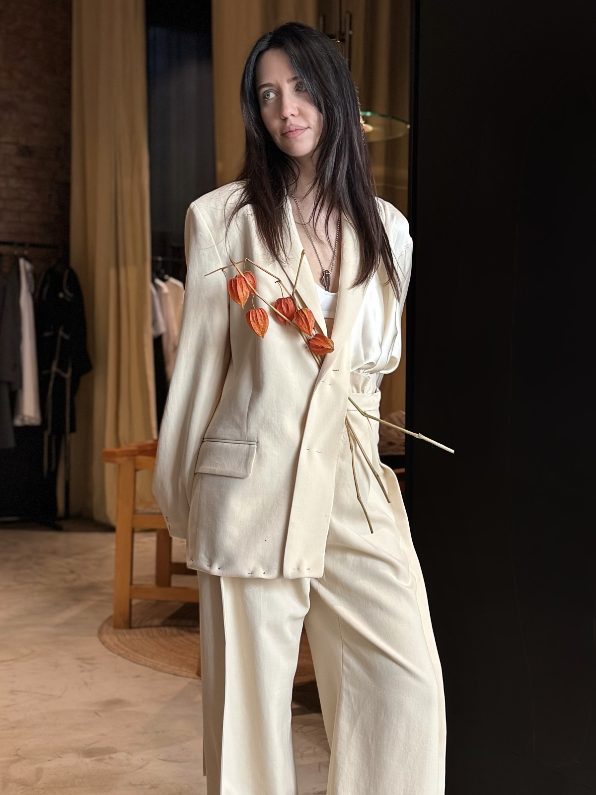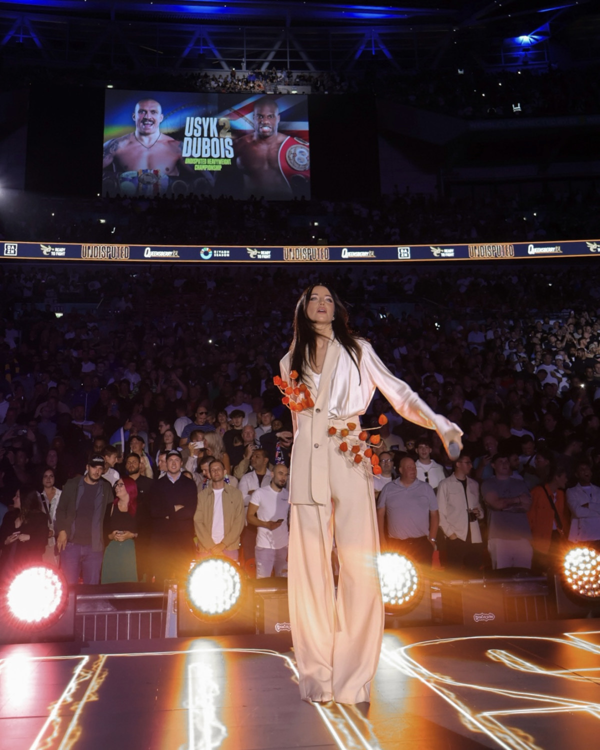 У ніч з 19 на 20 липня в Лондоні відбулася одна з найочікуваніших спортивних подій року — поєдинок Олександра Усика проти Даніеля Дюбуа. Український боксер захищав свій титул абсолютного чемпіона світу в суперважкій вазі, і ця подія стала не лише значущою в історії боксу, а й насиченою потужними культурними сенсами. Перед боєм на арені прозвучали гімни обох країн, і виконання Державного гімну України було довірене DOROFEEVA. Досить промовистим був не лише виступ співачки, а і її сценічний образ — кастомний костюм від українського бренду LITKOVSKA, створений спеціально для цього виступу. Над ним команда працювала з урахуванням унікального контексту. Основу образу вперше було представлено під час Тижня моди в Парижі у колекції весна-літо — 2025. Він натхнений символізмом збору врожаю в українській культурі та трансформований дизайнеркою Лілією Літковською через авторське деконструювання елементів чоловічого костюма й адаптацію їх для жіночого тіла.