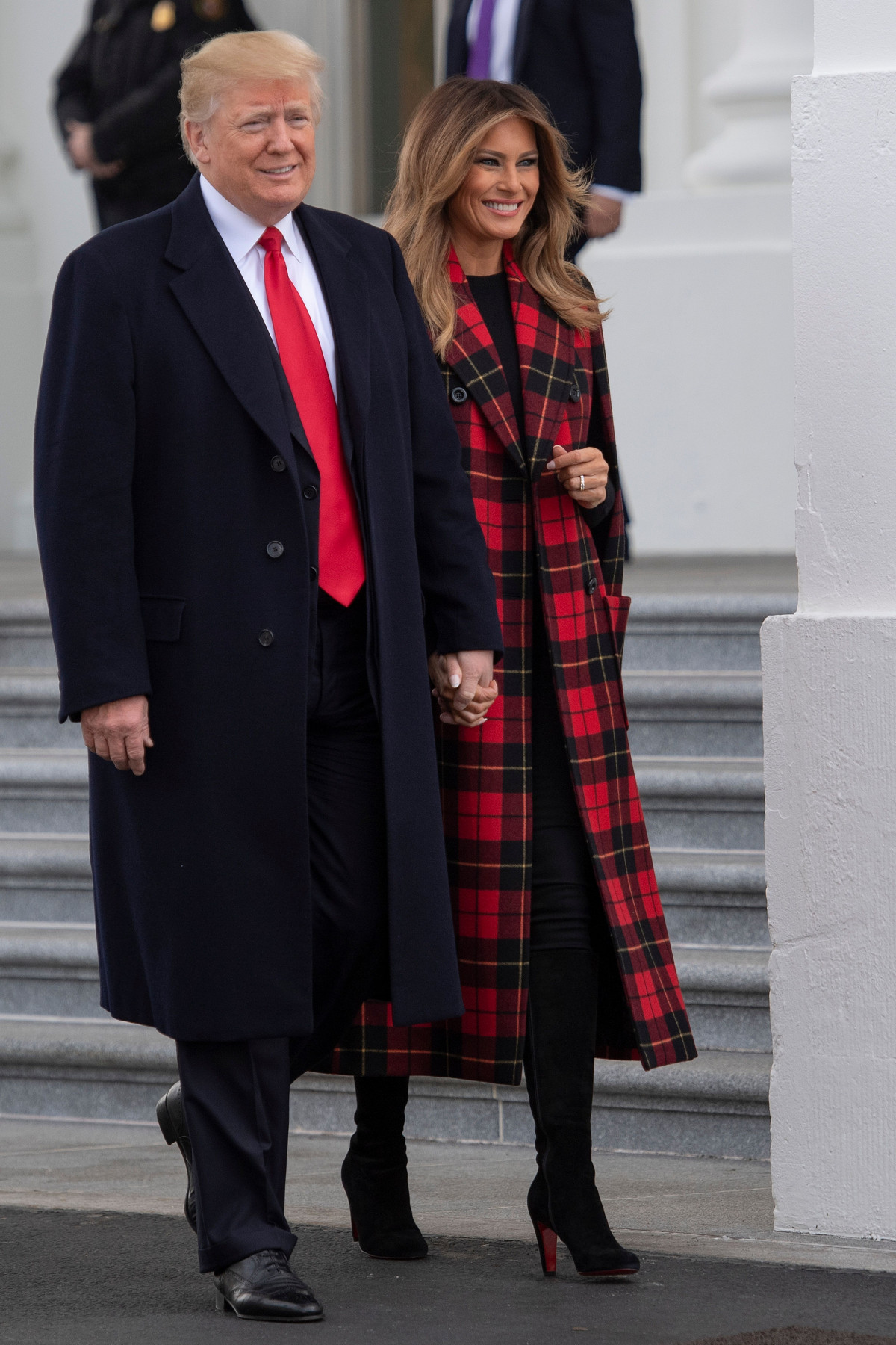 Мелания и Дональд Трамп лично встретили экипаж. Для этого события первая леди выбрала наряд в рождественских тонах – длинный кейп от Michael Kors с принтом в шотландскую клетку (сразу несколько трендов), черных брюках и сапогах на каблуке от Christian Louboutin.