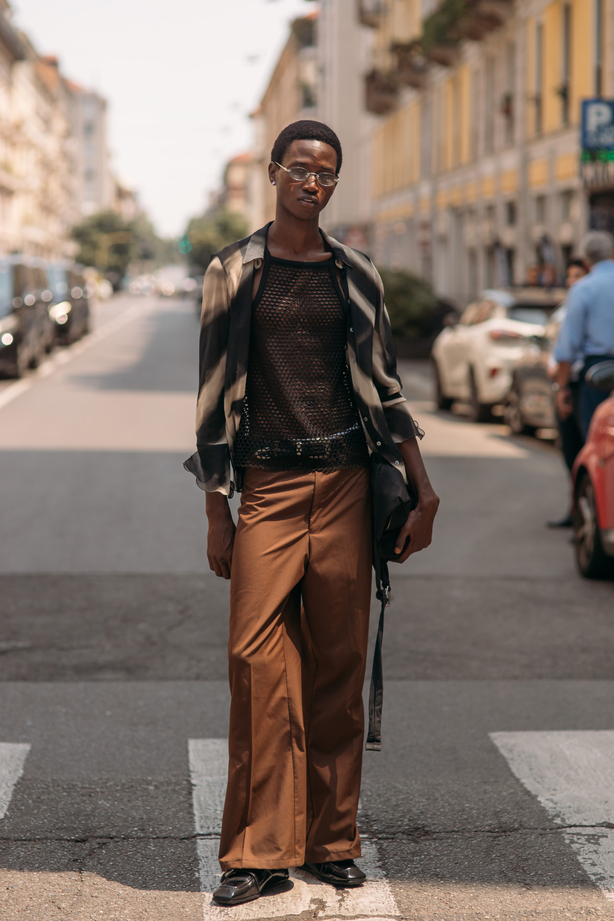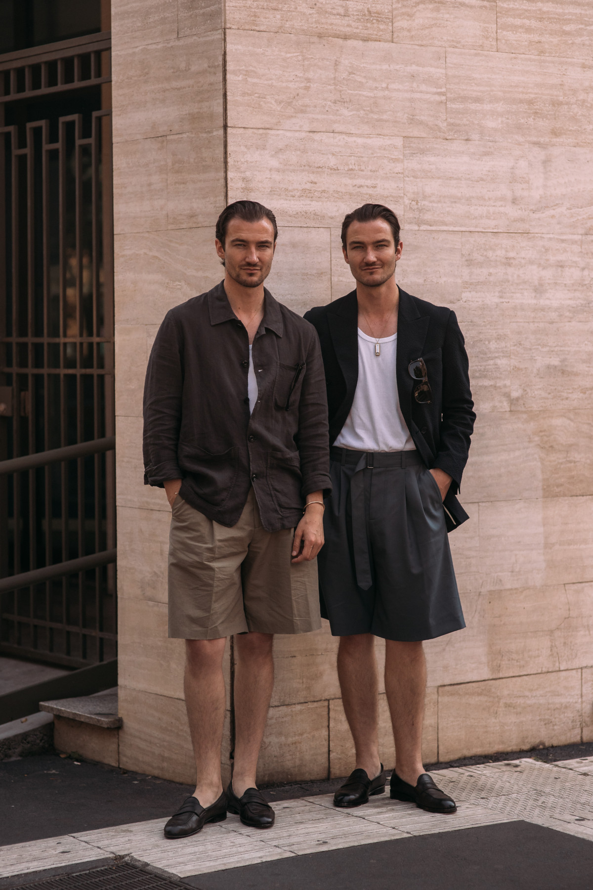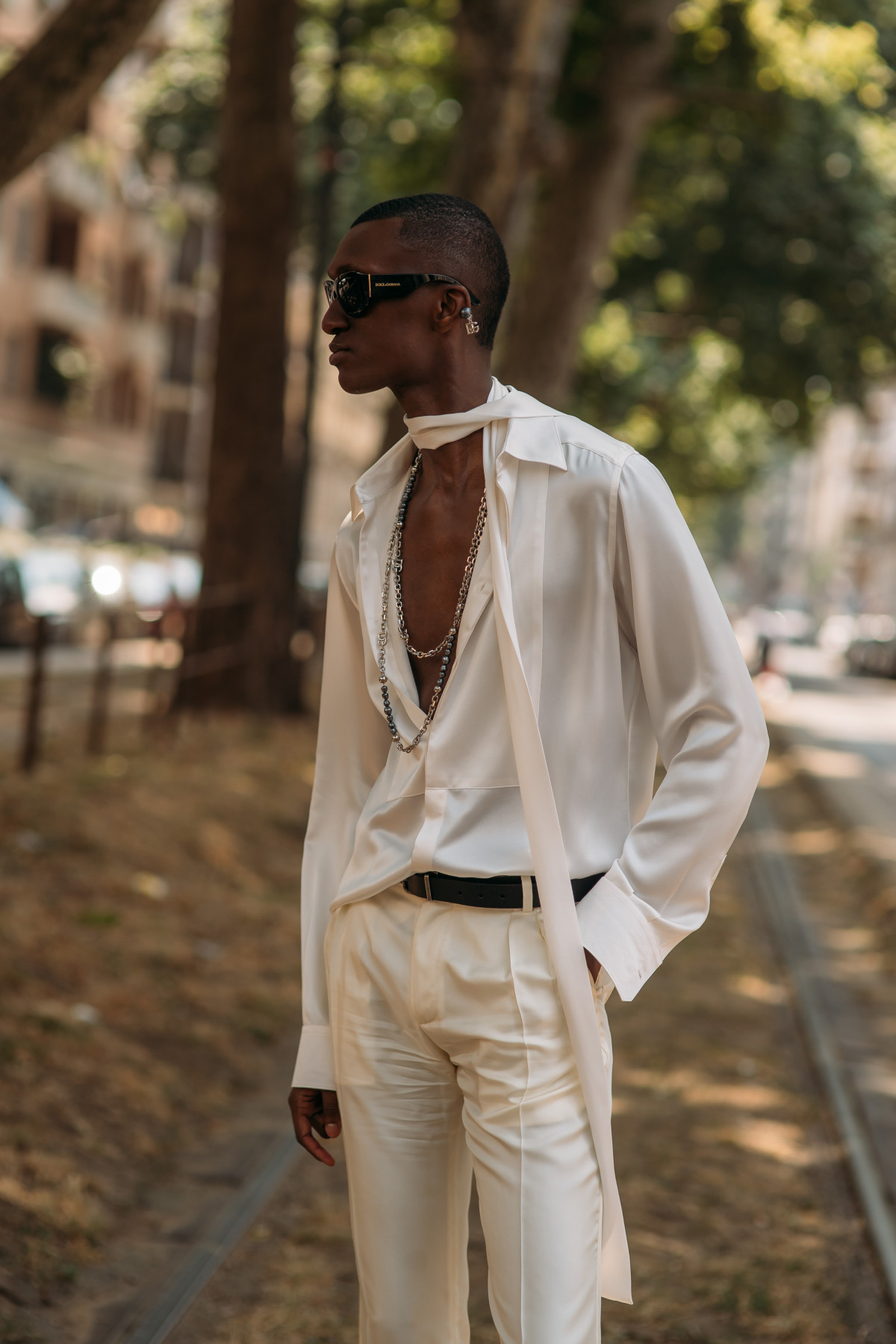 Цього літнього сезону чоловіки традиційно зосередилися на класиці. Штани прямого крою, базові сорочки, у певних випадках доповнені трендовими принтами, структуровані піджаки — здавалося б, доволі прості поєднання, утім кожен гість спробував додати індивідуальні нотки до власного вбрання, що зробило загальну картину streetstyle більш живою та багатогранною.