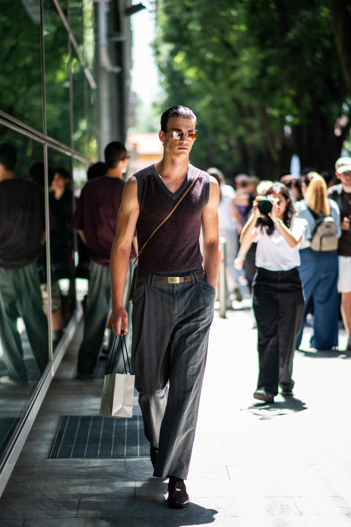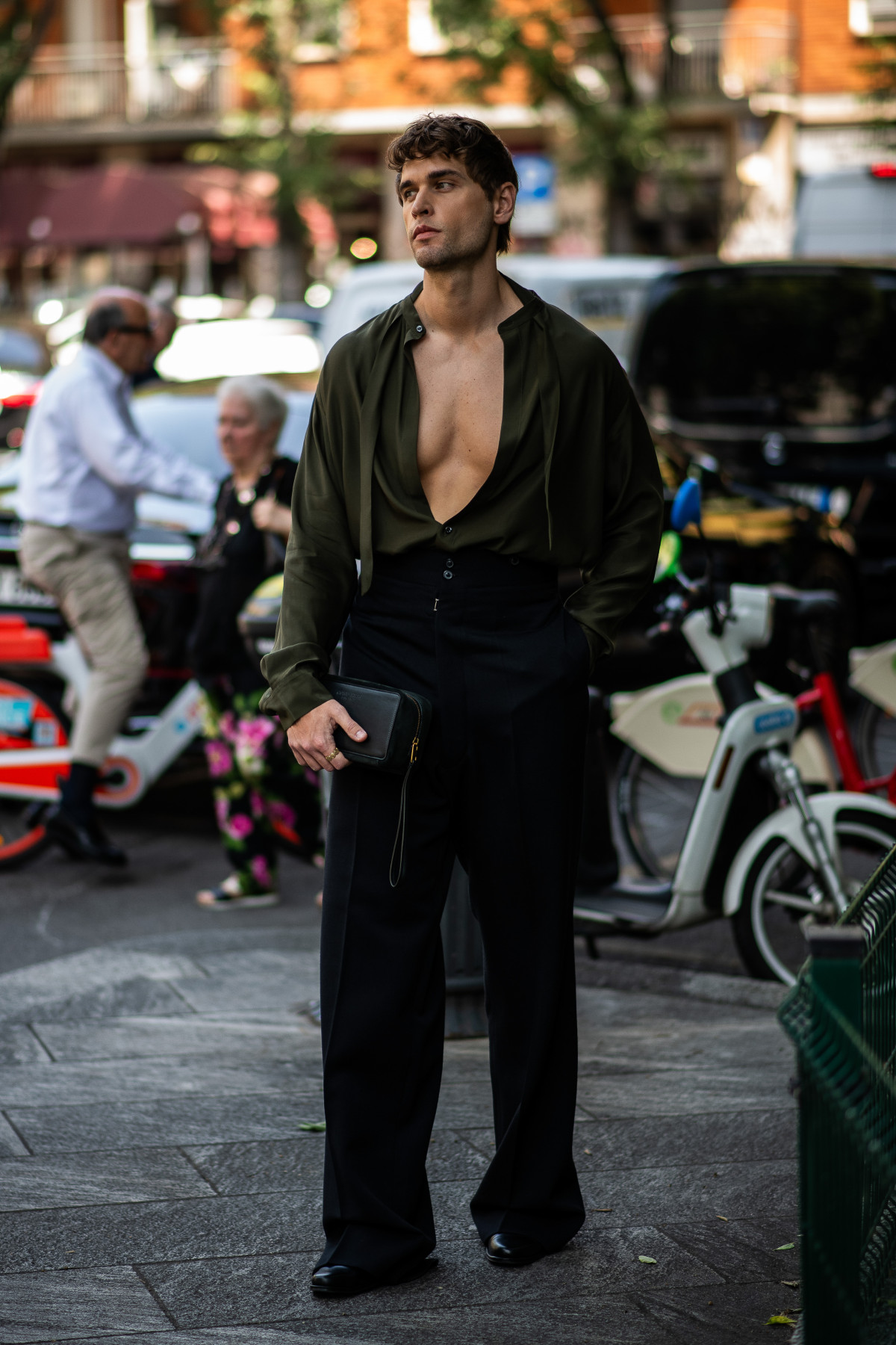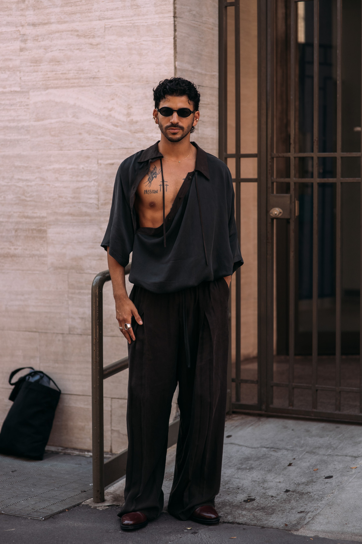 Цього літнього сезону чоловіки традиційно зосередилися на класиці. Штани прямого крою, базові сорочки, у певних випадках доповнені трендовими принтами, структуровані піджаки — здавалося б, доволі прості поєднання, утім кожен гість спробував додати індивідуальні нотки до власного вбрання, що зробило загальну картину streetstyle більш живою та багатогранною.