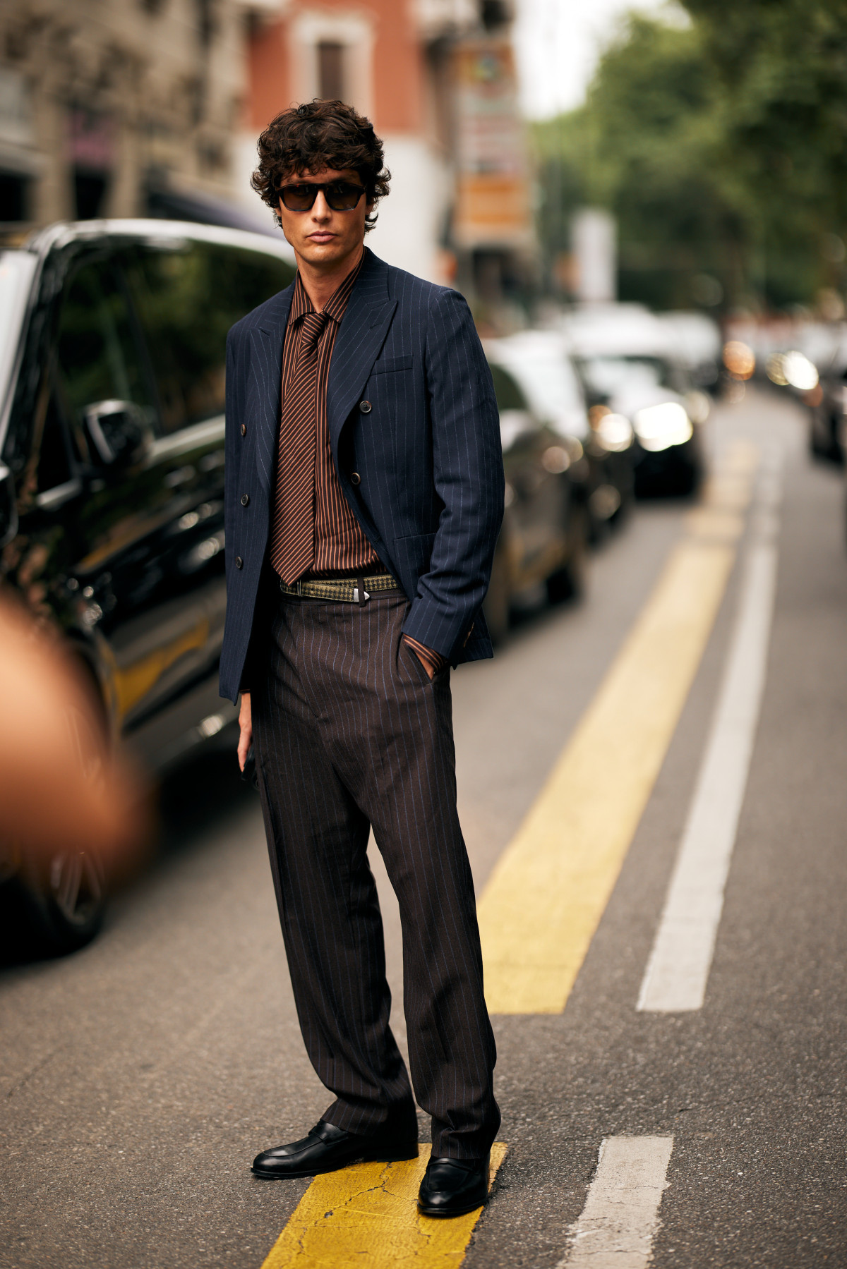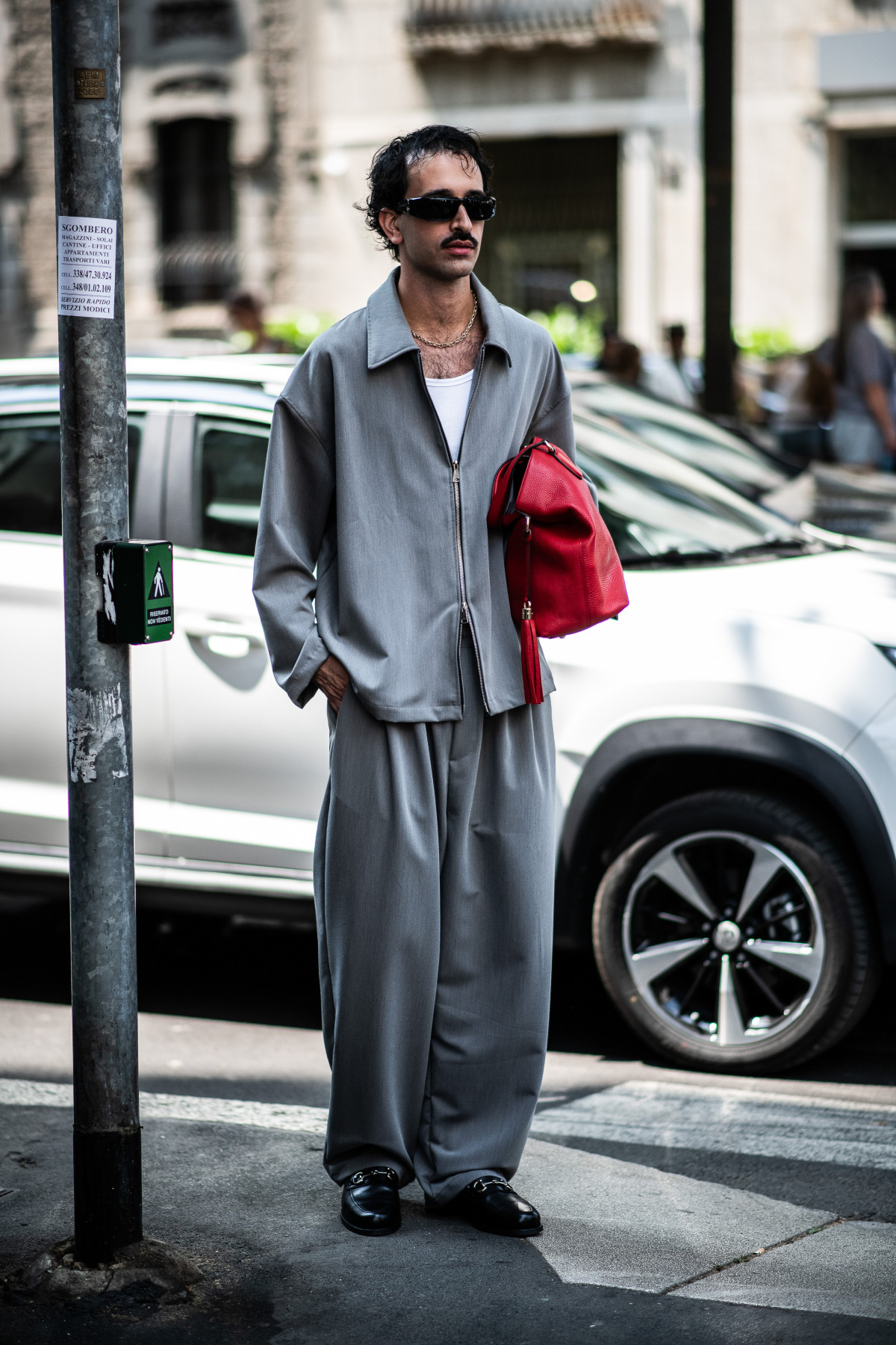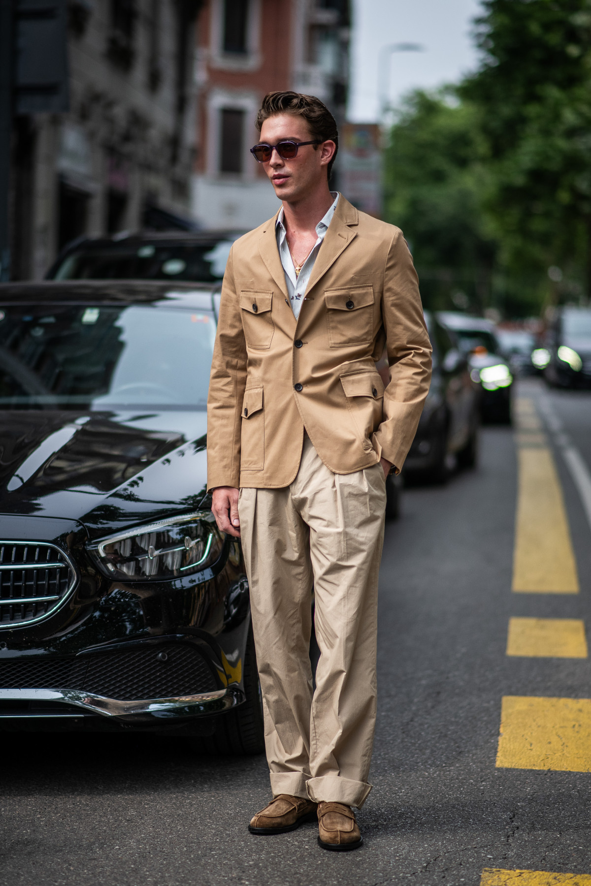 Зокрема, чоловіки обирали костюми в нейтральних відтінках сірого чи бежевого, а також у насичених варіаціях на зразок винного чи темно-гірчичного. Їх носили як повноцінними сетами, так і міксували з футболками або ж розслабленими сорочками, граючи на контрастах.