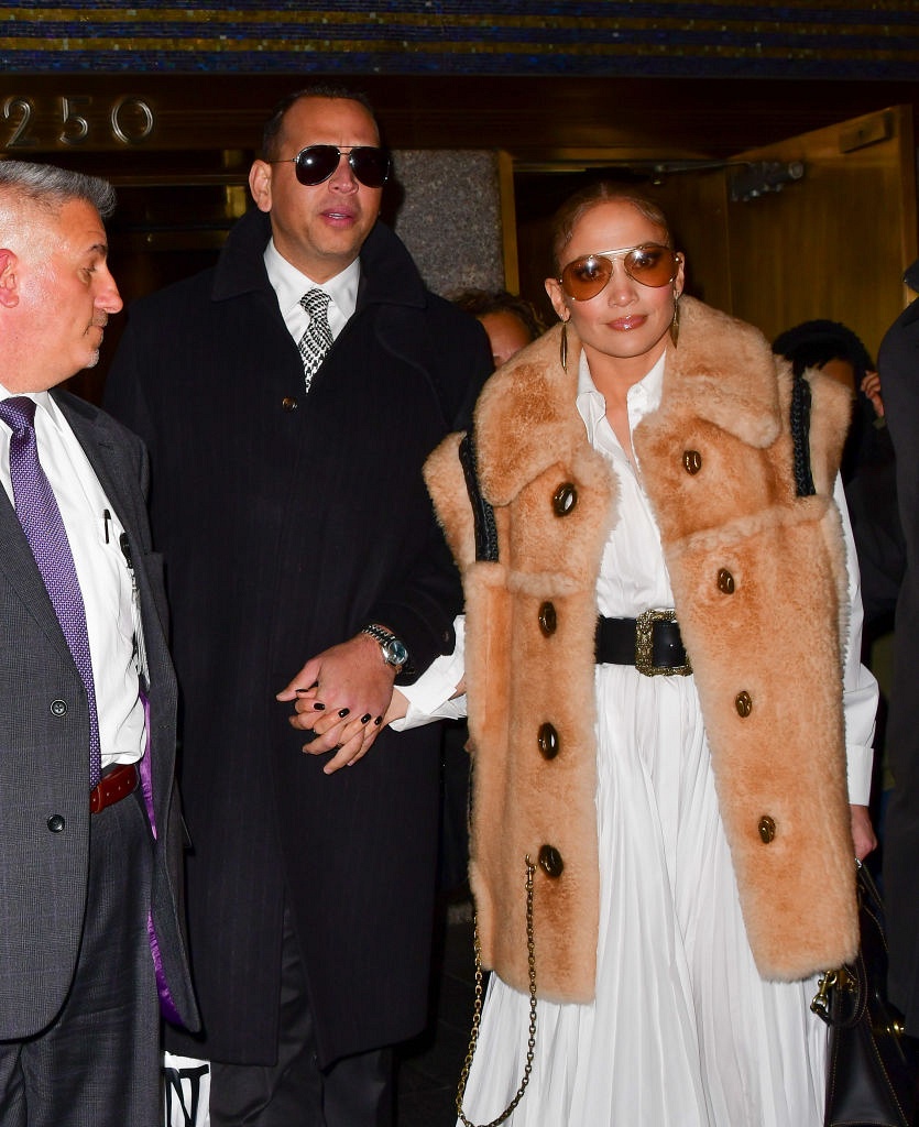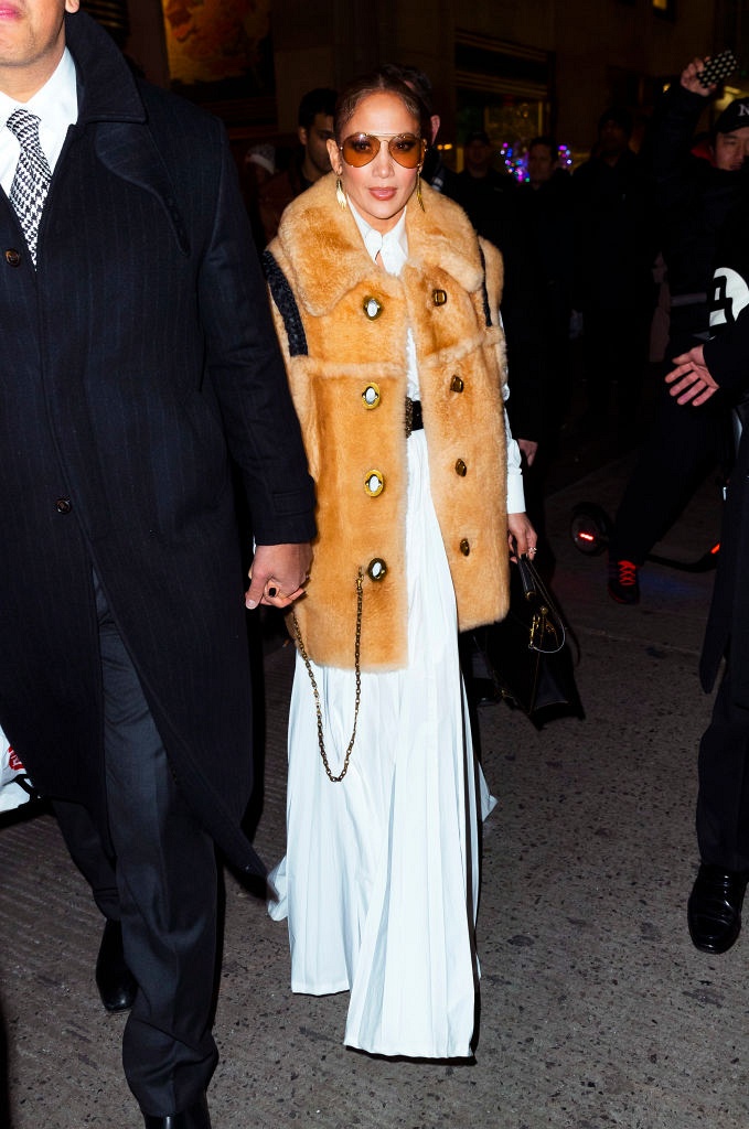 Накануне вечером Дженнифер Лопес вместе с Алексом Родригесом посетили студию NBC. Когда пара покидала здания, их застали папарацци, которые успели сделать несколько снимков. Неожиданно для выхода артистка выбрала платье-рубашку, поверх которой надела меховой жилет Coach с кожаными вставками. Такие носили десять лет назад. Сегодня же меховой жилет считается антитрендом. Особенно если мех не искусственный.