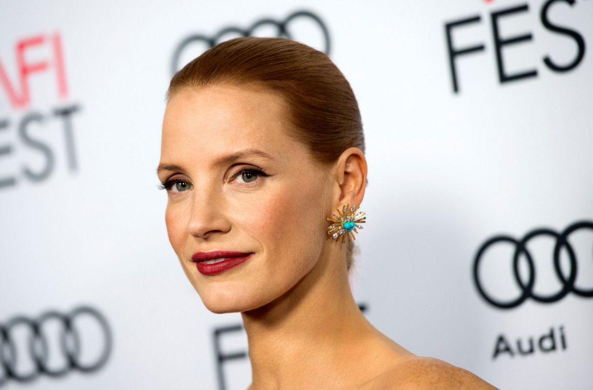 Джессика Честейн выбрала платье Prada c открытым декольте из кади пурпупного цвета с деталями из шелка-дюшеса цвета аквамарин.