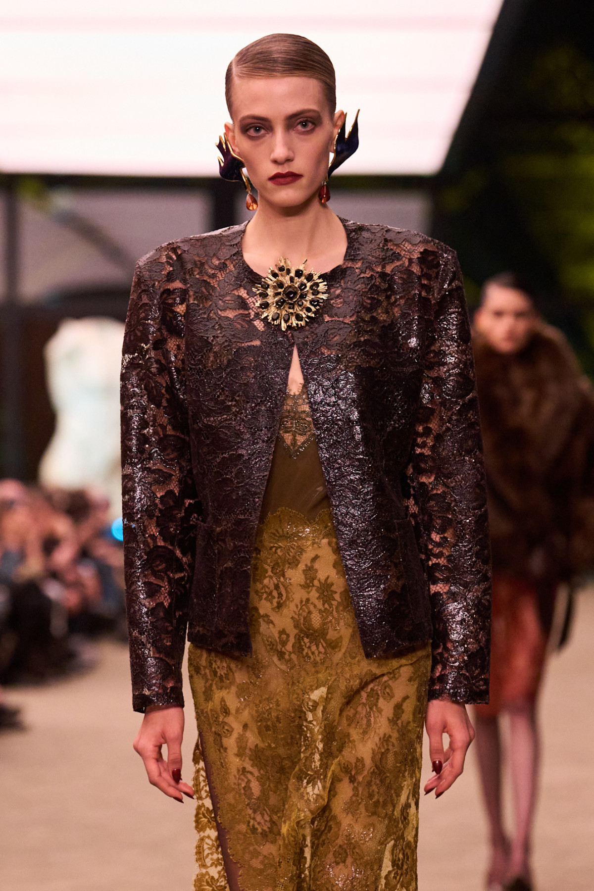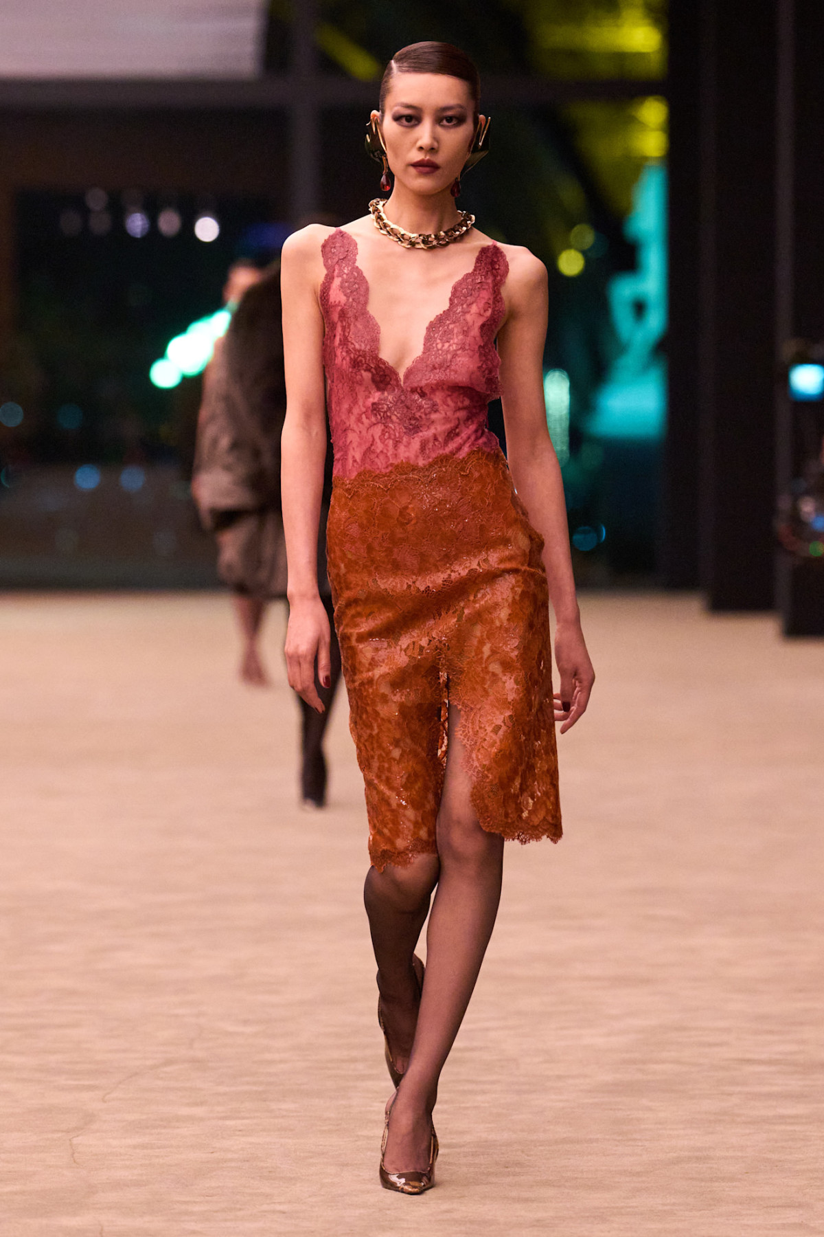 Щодо подіуму: колекція Saint Laurent осінь-зима 2026, яку Ентоні Вакарелло показав цього разу, була досить репетитивною в плані образів. Прозорі мереживні сукні, мідіспідниці та топи, пластикові тренчі, костюми-двійки на голе тіло, суперобʼємні шуби та куртки, підпоясані широкими поясами так, що низ утворює «спідницю».