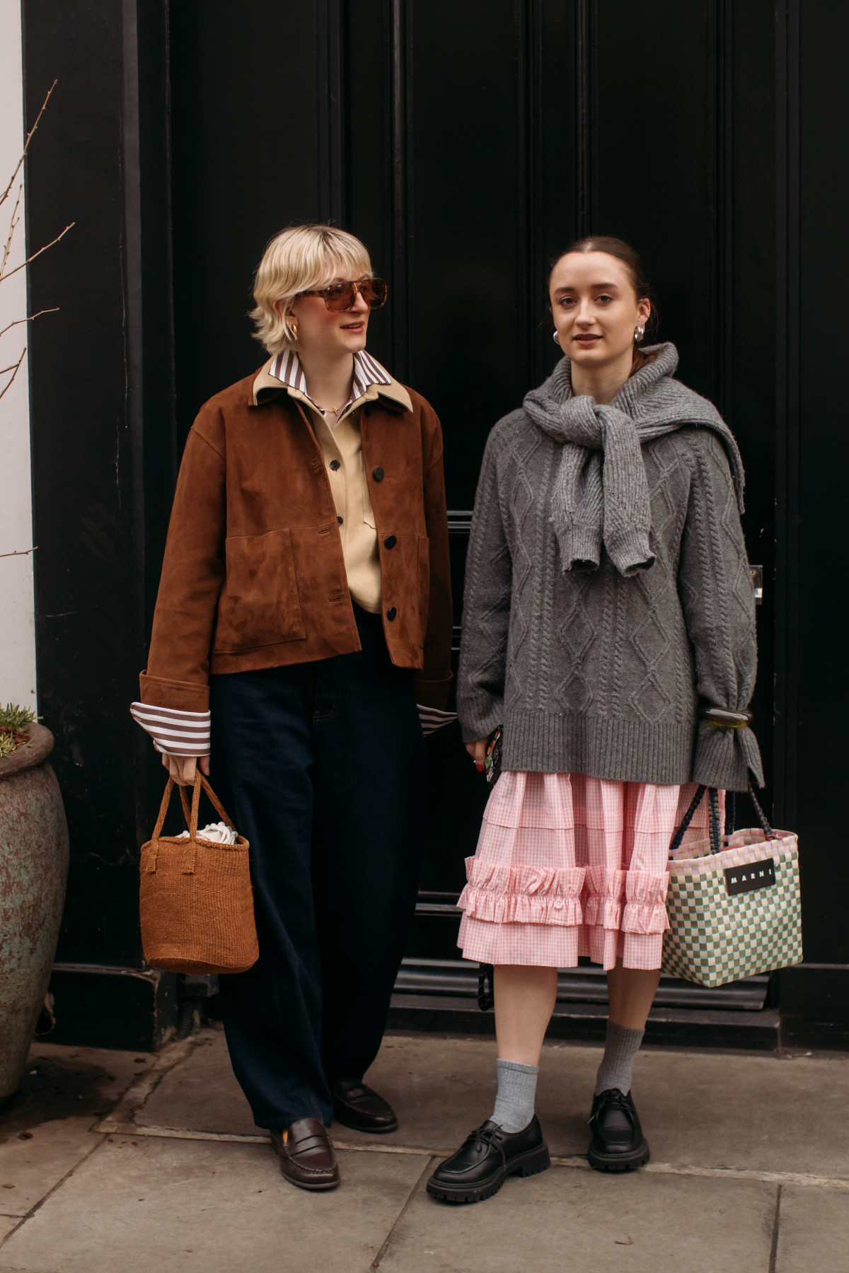 Ну і, звичайно, не забуваємо про окремі деталі, які виділяли навіть найпростіші образи. Зокрема, гості британської столиці додавали до своїх стилізацій яскраві головні убори, серед яких — в’язані панамки, чепчики й бейсболки; светри поверх курток; плетені рукавички; краватки; а також трендові моделі сумок — East-West, кошики, bowler bags та інші.