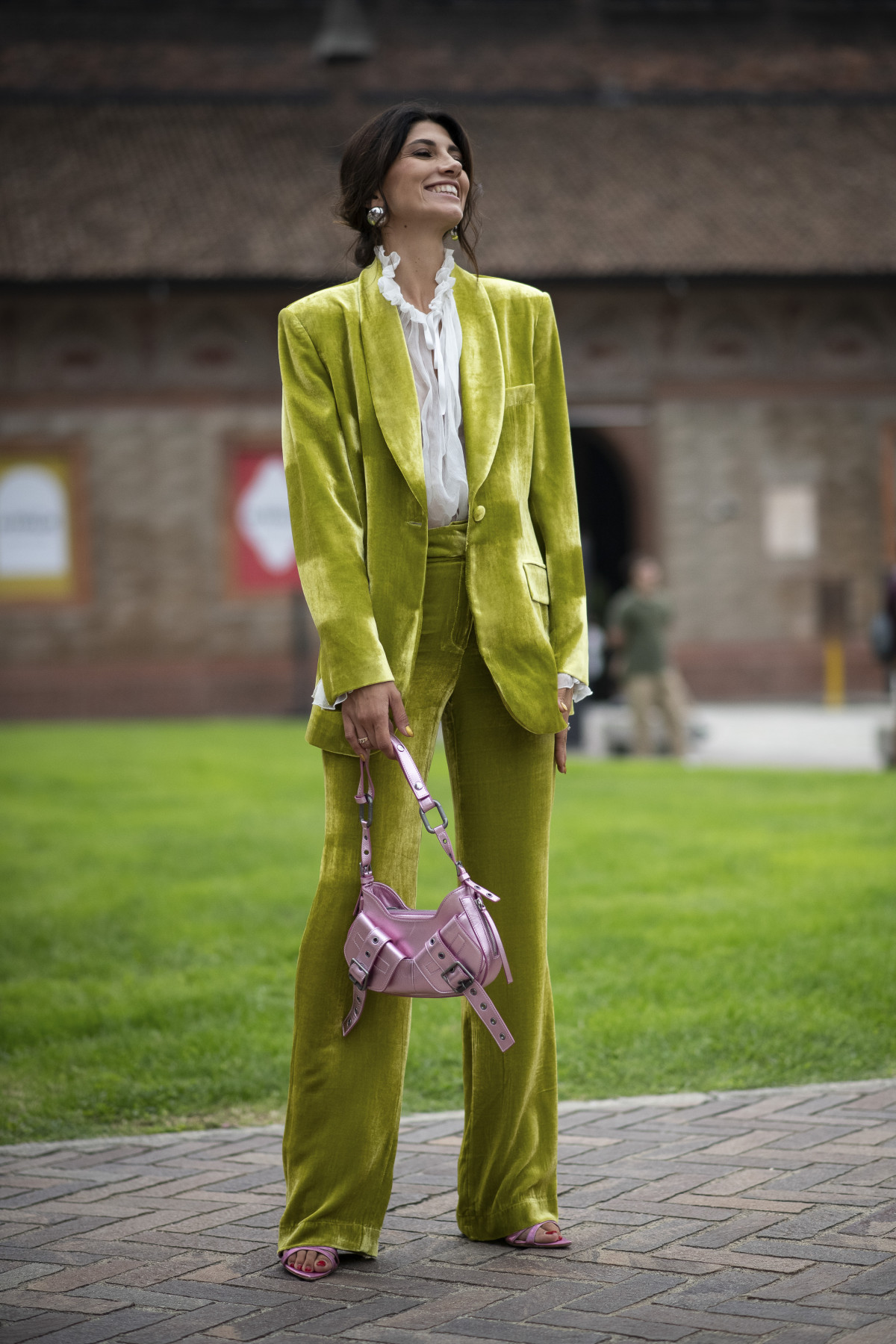 Фешіоніста радили звертати увагу й на тканини. Деякі стрітстайл-зірки зупинилися на вельветових брючних костюмах яскравих відтінків — зелених або металік. Тож, якщо ви не боїтеся експериментів з фактурами та кольорами, беріть на замітку й такий варіант.