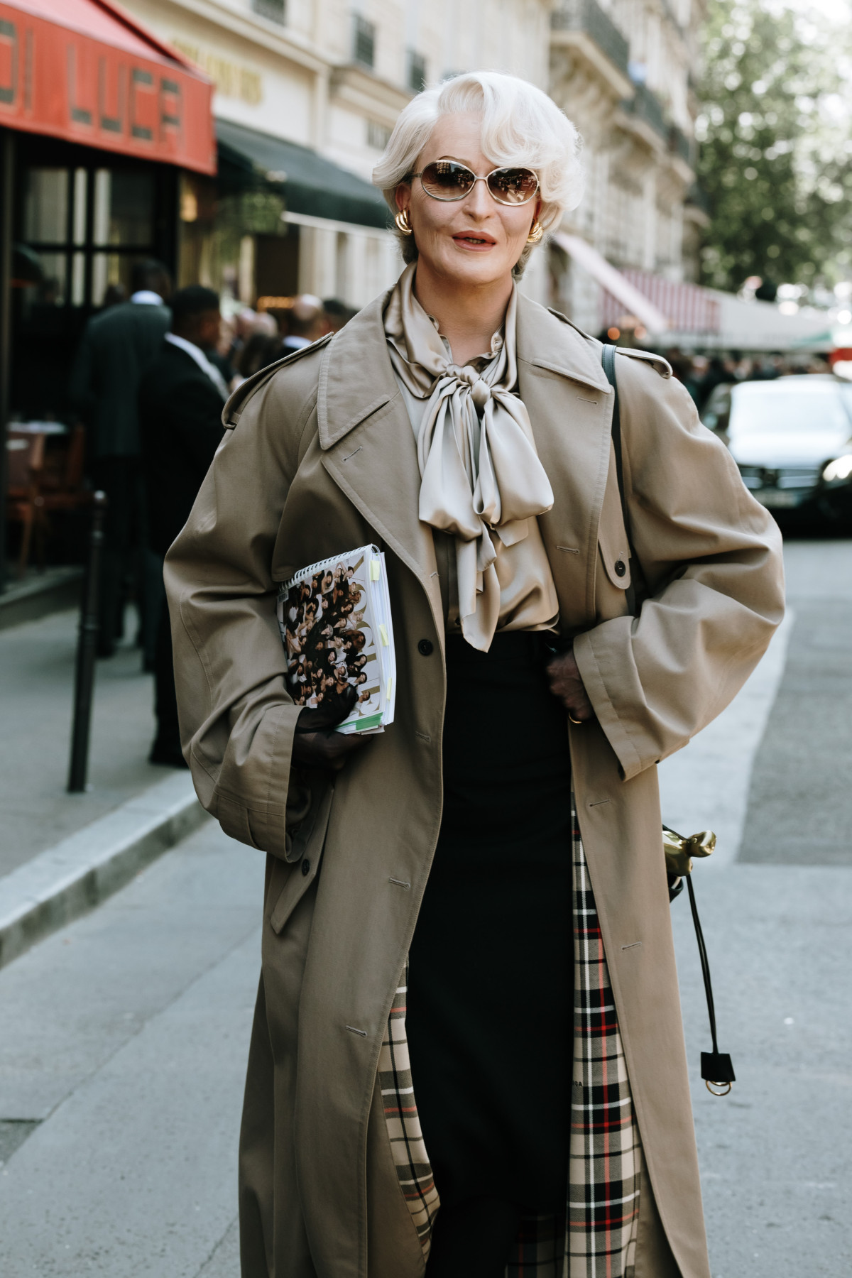Щодо палітри відтінків, то тут фешн-інфлюенсерки обирали й базові кольори, і більш насичені та яскраві. До прикладу, нерідко на вулицях можна було помітити розкішні total black образи, як-от у Кейт Бланшетт, що завітала на показ Armani Privé, або навпаки поєднання глибоких червоних тонів.