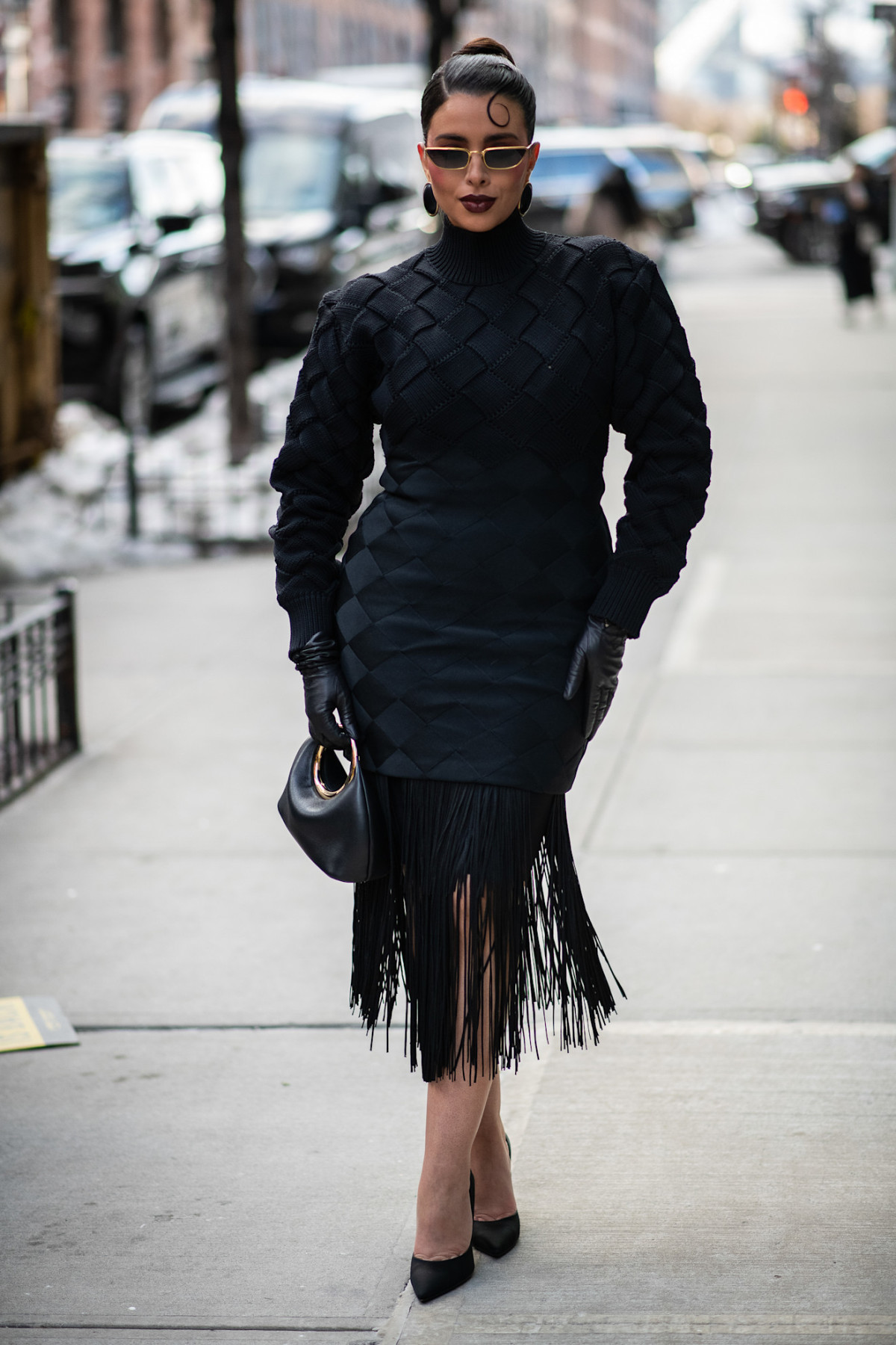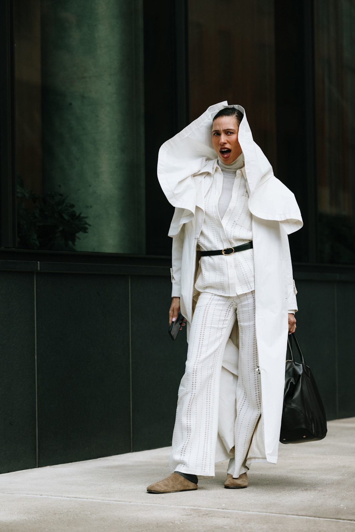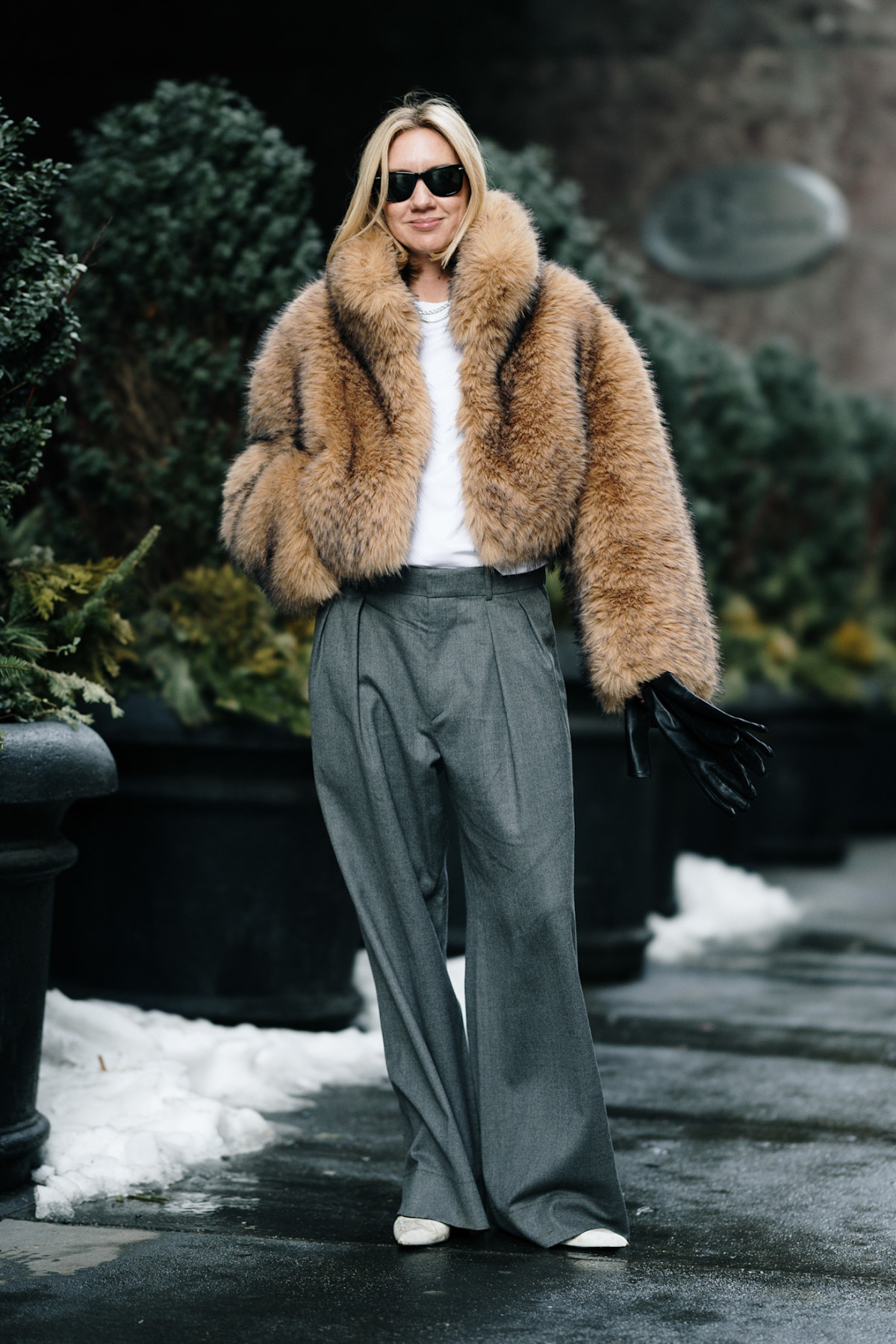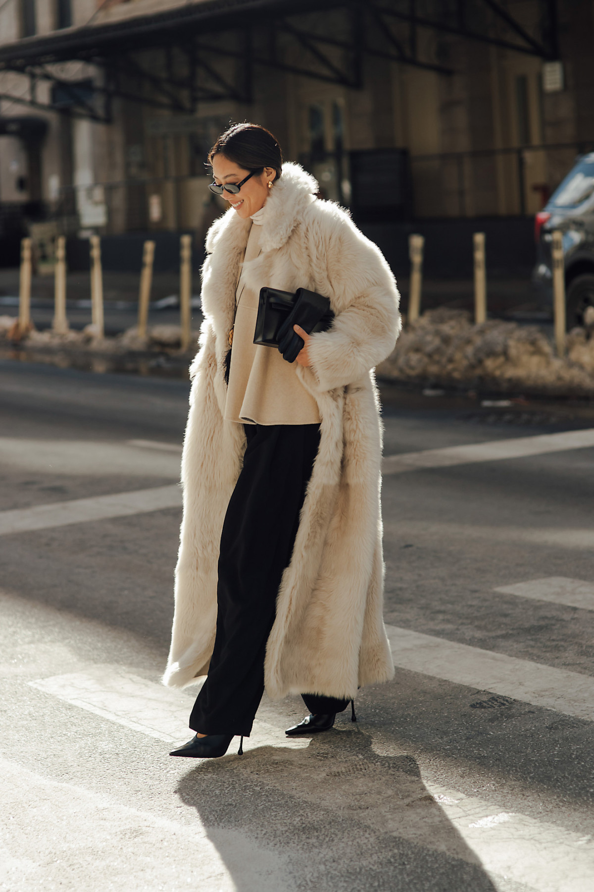 Тренди, які цього сезону обрали нью-йоркські модниці, включають total white, хутряні шуби та шапки, об’ємні шкіряні куртки, офіскор зі широкими костюмними штанами, мідіспідниці та бахрому.