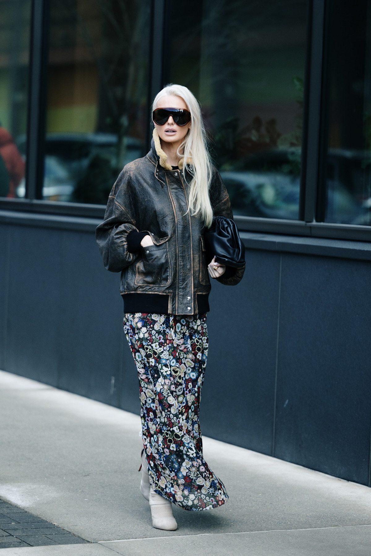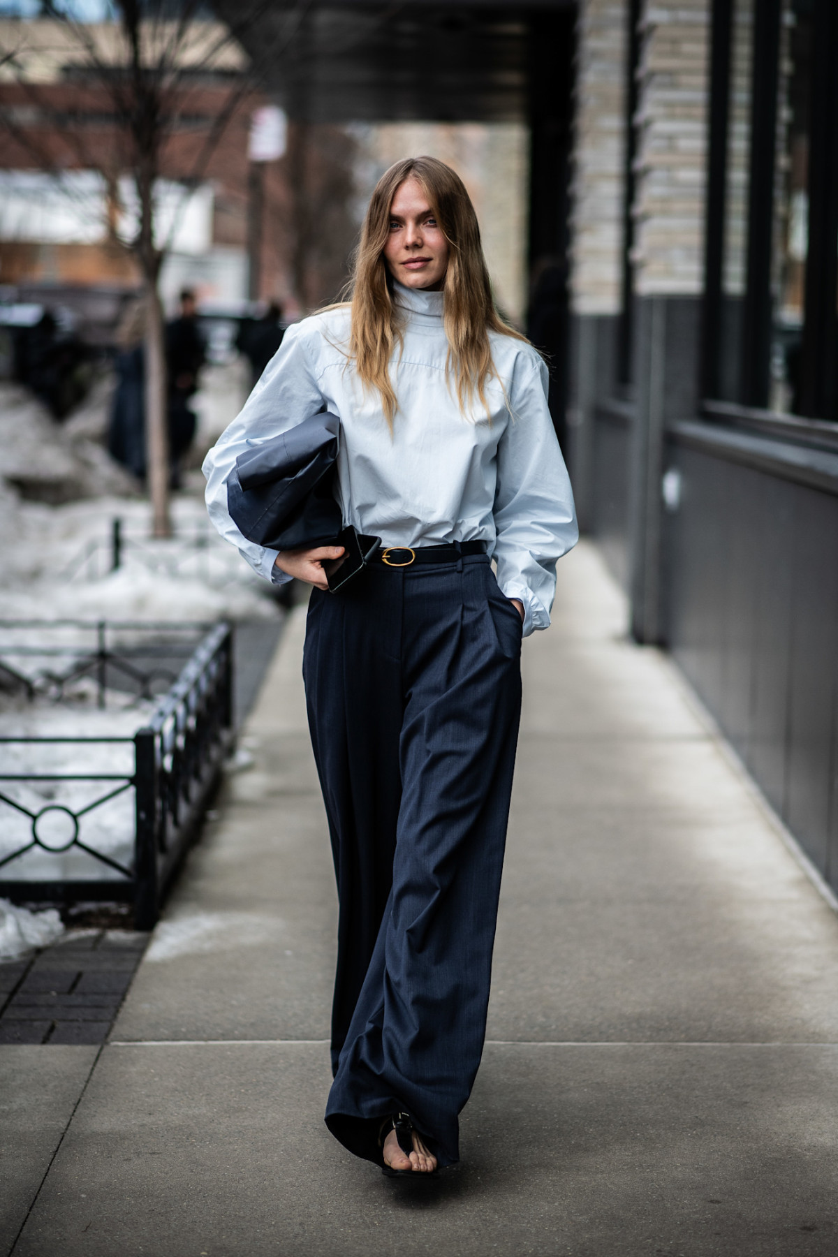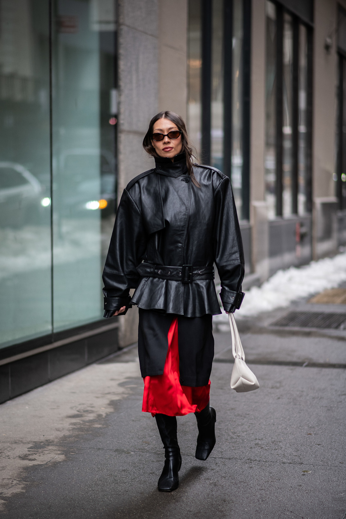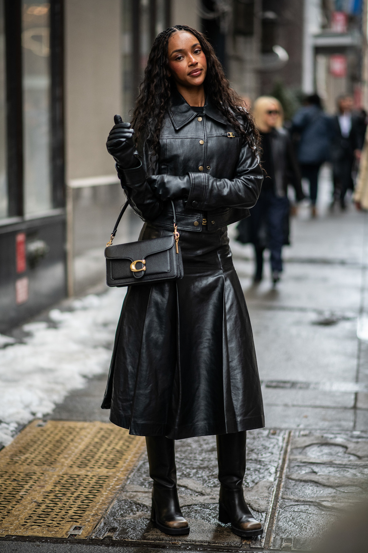 Тренди, які цього сезону обрали нью-йоркські модниці, включають total white, хутряні шуби та шапки, об’ємні шкіряні куртки, офіскор зі широкими костюмними штанами, мідіспідниці та бахрому.