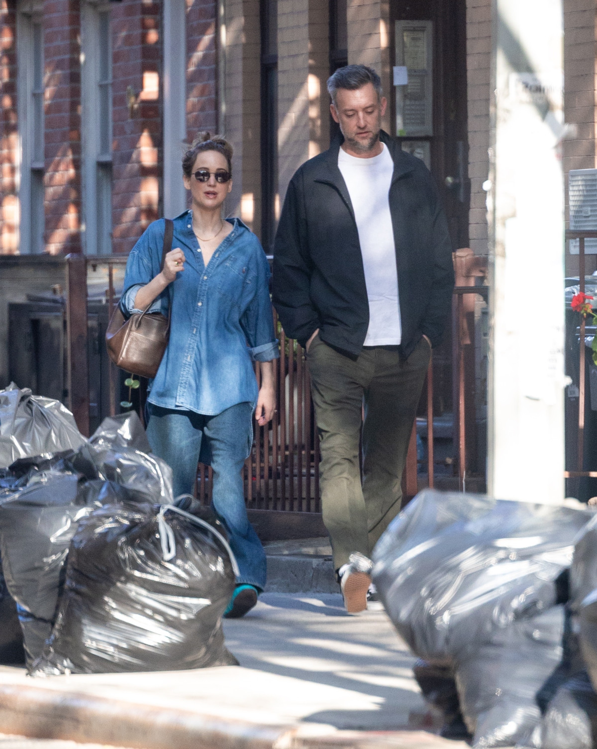 Зірку помітили під час повсякденної прогулянки з чоловіком і крихітним сином. Для виходу Дженніфер обрала широкі baggy-джинси темно-синього відтінку й дещо світлішу обʼємну сорочку, розстібнуту на верхні ґудзики. Взуття теж пасувало в тон — бірюзові балетки мʼяко розбавляли поєднання й водночас додавали дещо яскравішого акценту, не вибиваючись із загальної стилістики.