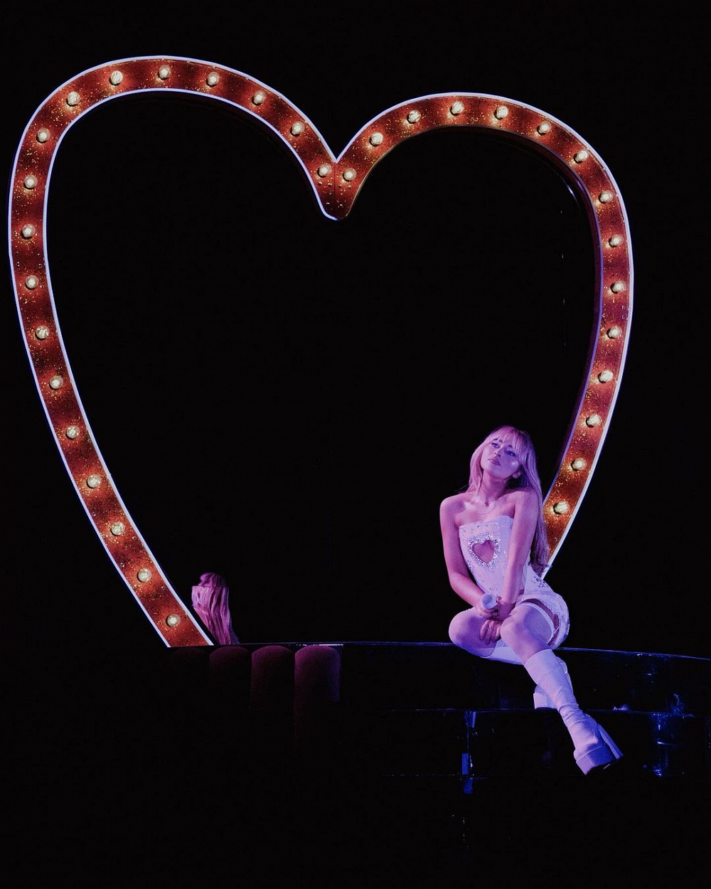 Сукня FROLOV довжини міні була оздоблена мереживом і стразами. Під грудьми розмістився трендовий виріз у формі серця. Образ Сабріна доповнила панчохами, чоботами на платформі від Naked Wolfe і пір’ям, накинутим на плечі.